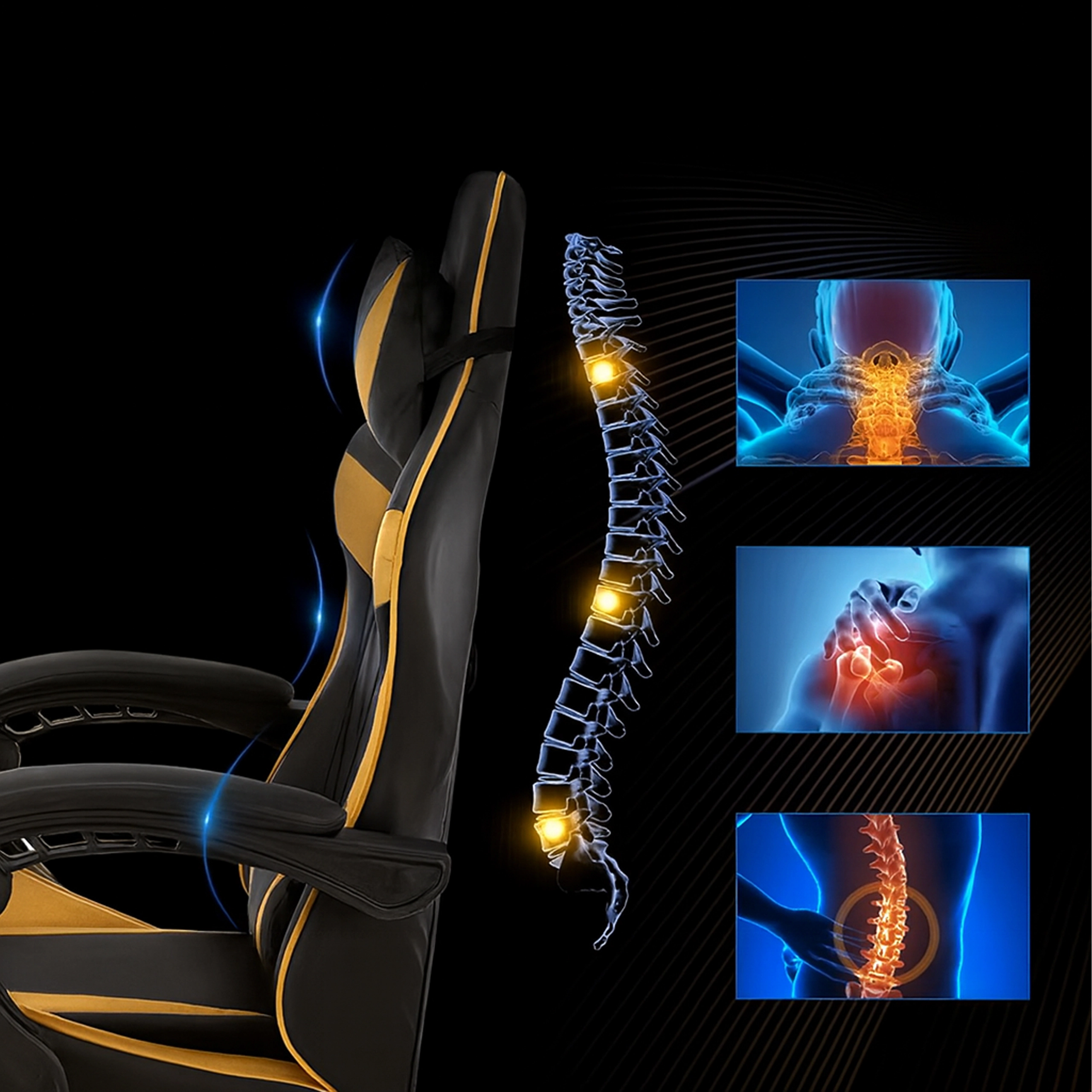 Sprijină-ți picioarele, relaxează coapsele și zona lombară. Doar trage suportul pentru picioare și rabatează spătarul – ideal pentru o pauză între taskuri sau în timpul sesiunilor lungi de gaming.