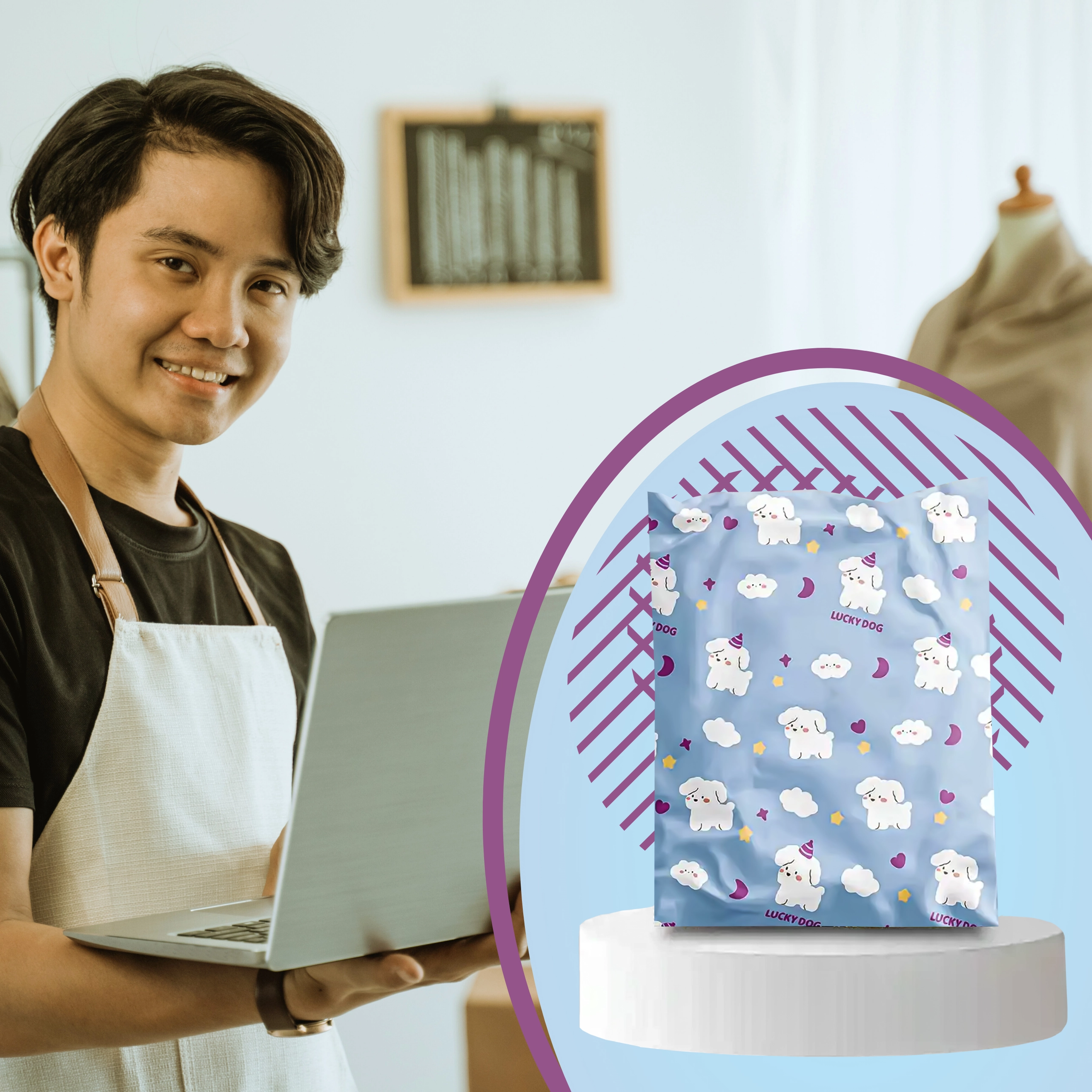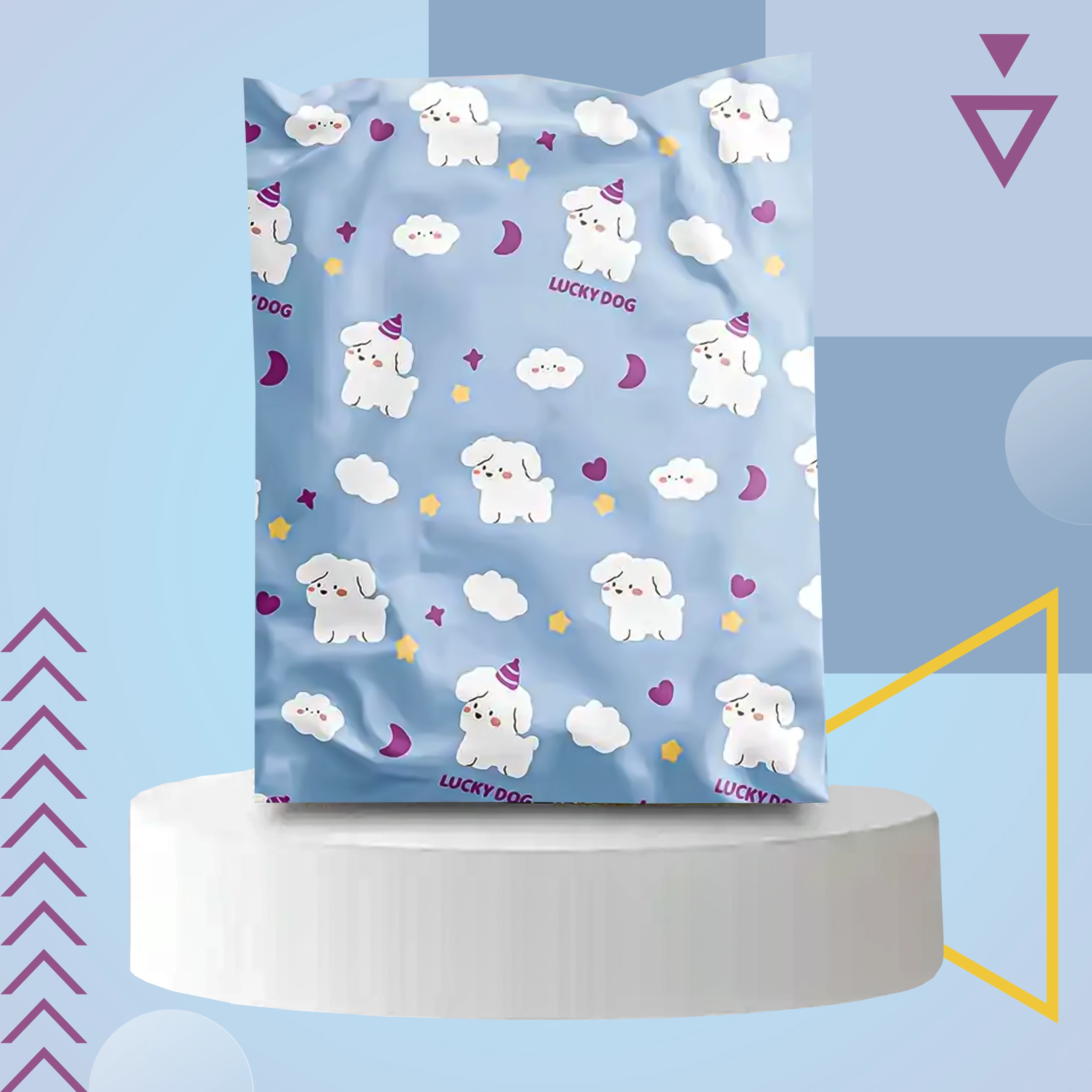 Motivul jucăuș albastru cu câini și nori oferă personalitate coletelor și susține imaginea magazinului dvs.