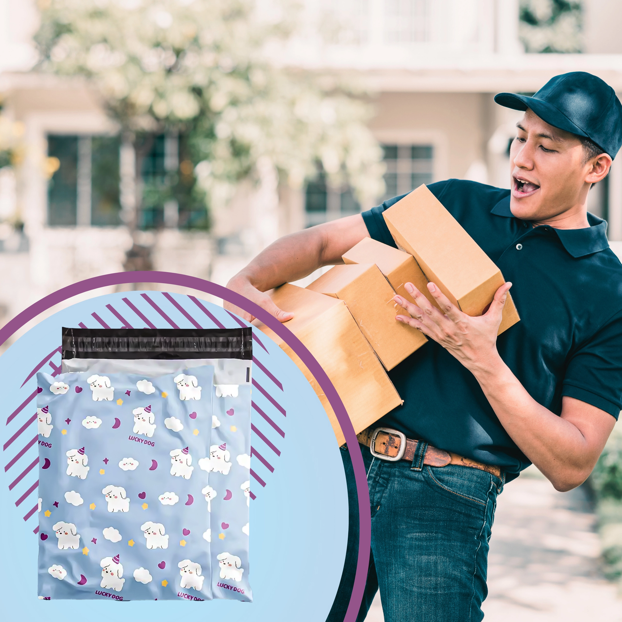 Datorită materialului rezistent și aspectului opac, conținutul rămâne protejat de umezeală și priviri indiscrete. Decorul LUCKY DOG accentuează profesionalismul și memorabilitatea coletelor dvs.