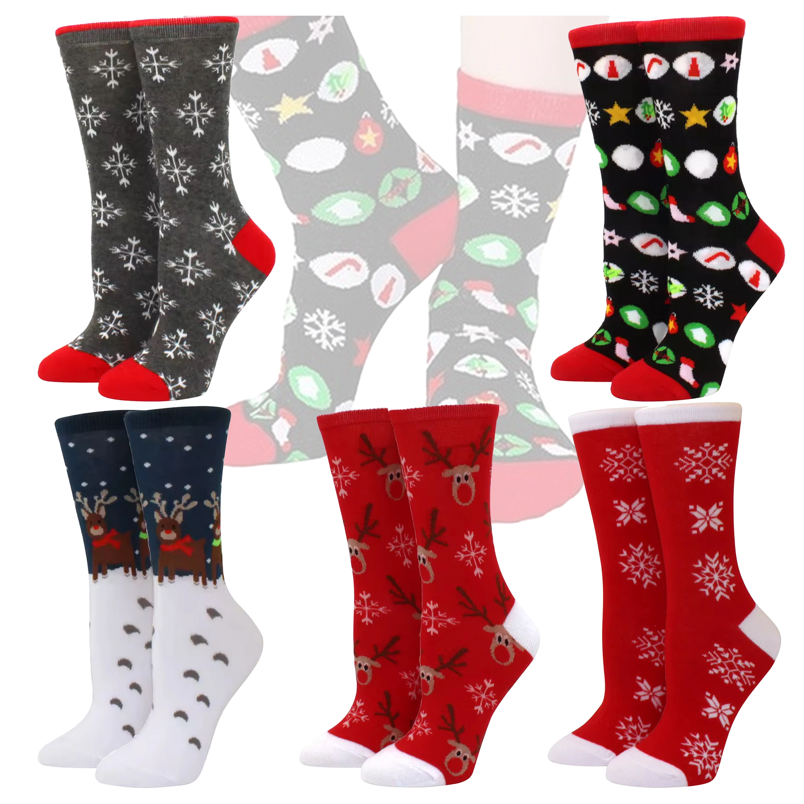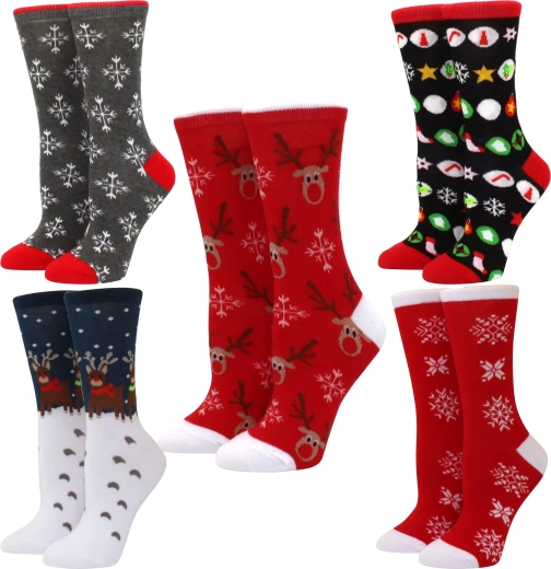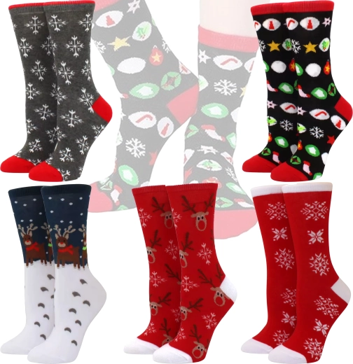 Set stilat cu 5 perechi de șosete de Crăciun din bumbac pentru confort și bucurie în zilele de iarnă. Din bumbac de înaltă calitate – moale, respirabil și plăcut la atingere. Motive vesele precum reni, brăduți și fulgi de zăpadă creează o atmosferă festivă. Un cadou grozav pentru Crăciun și Moș Nicolae.