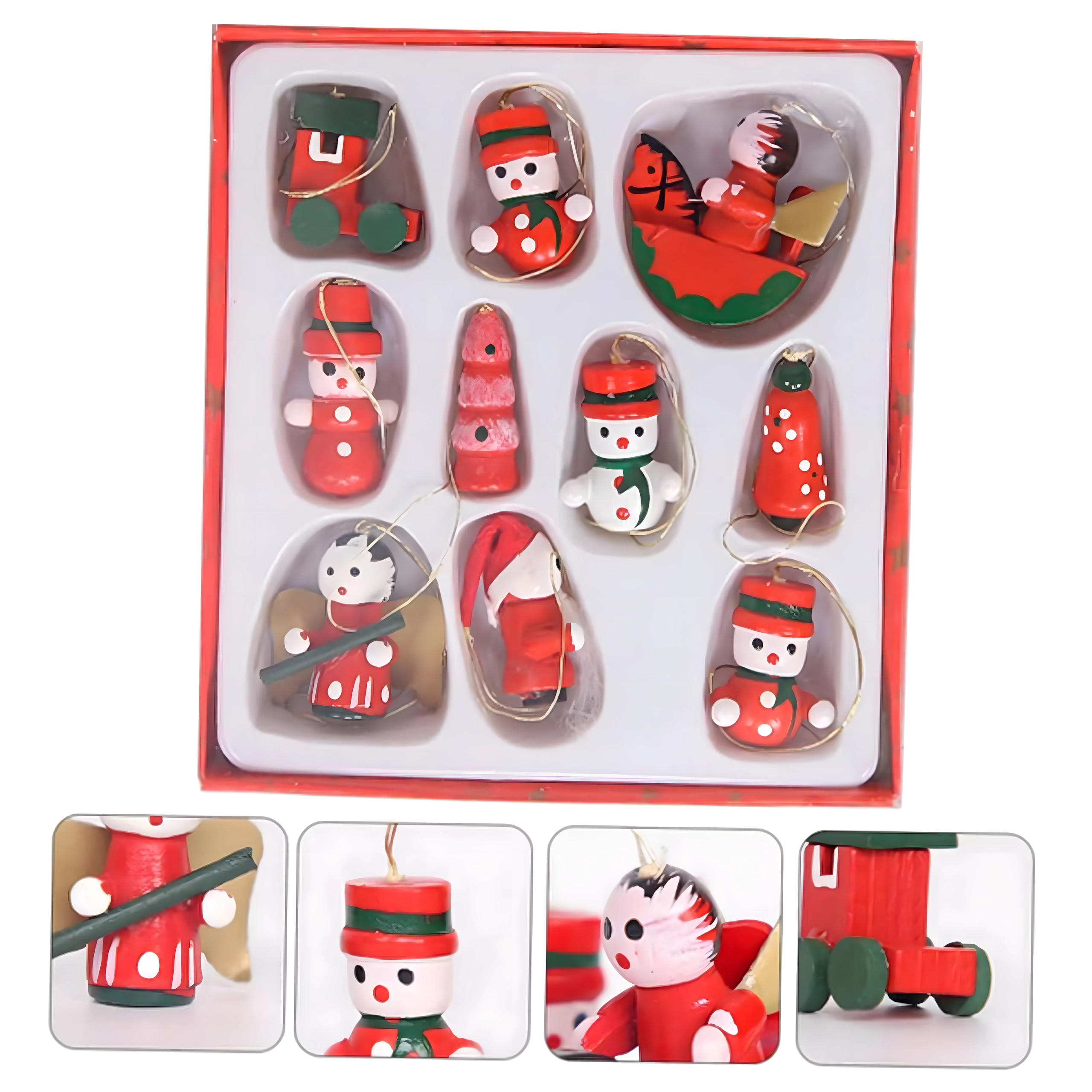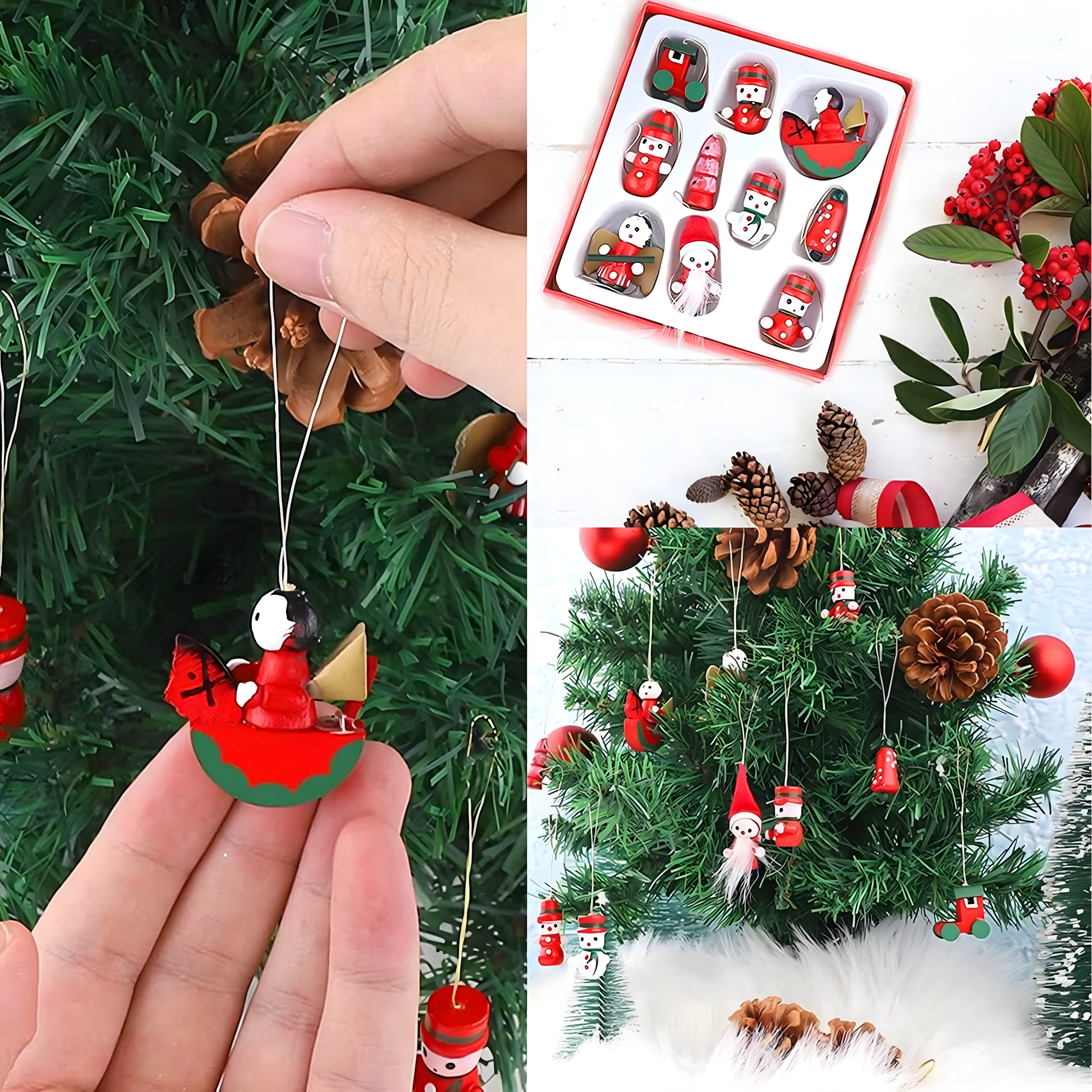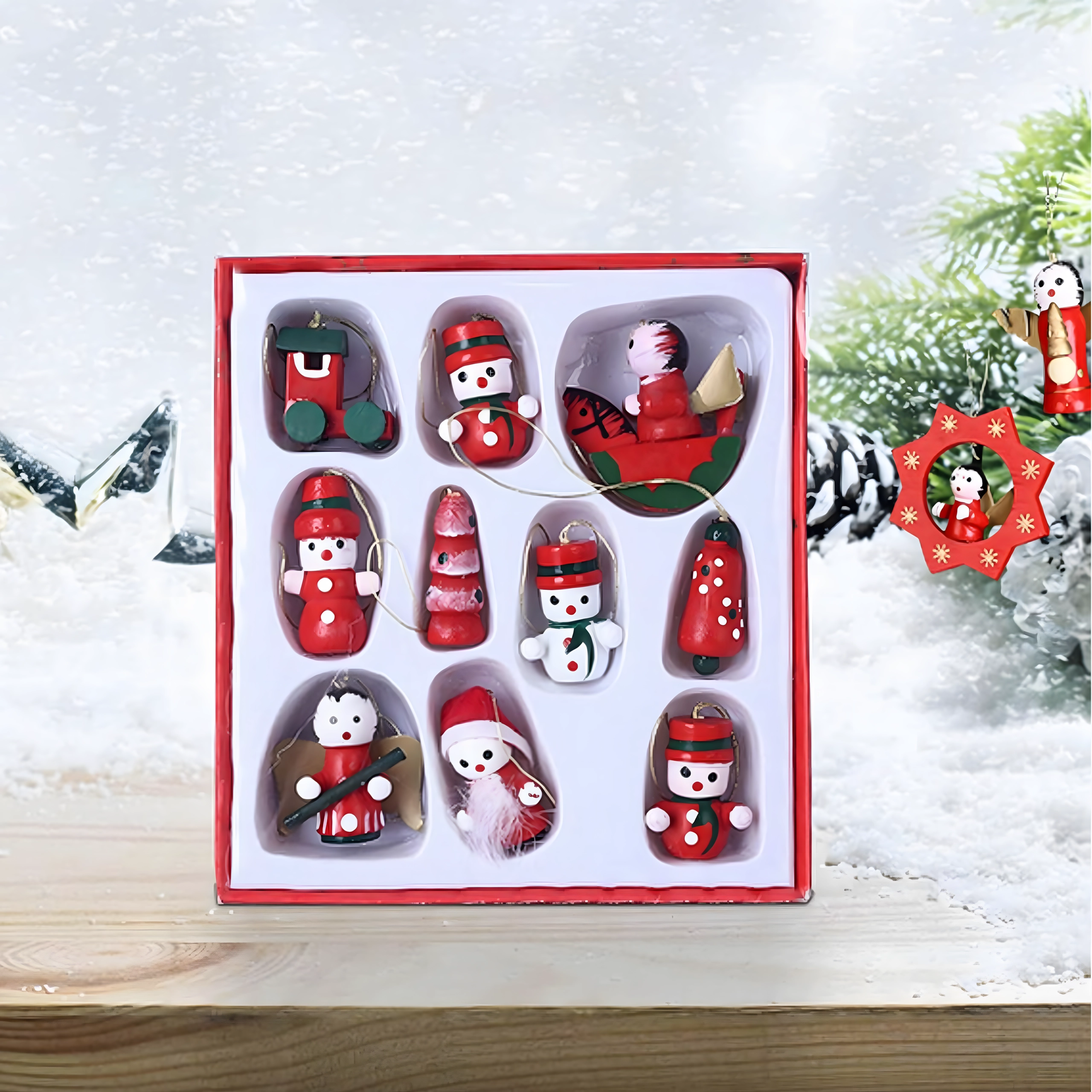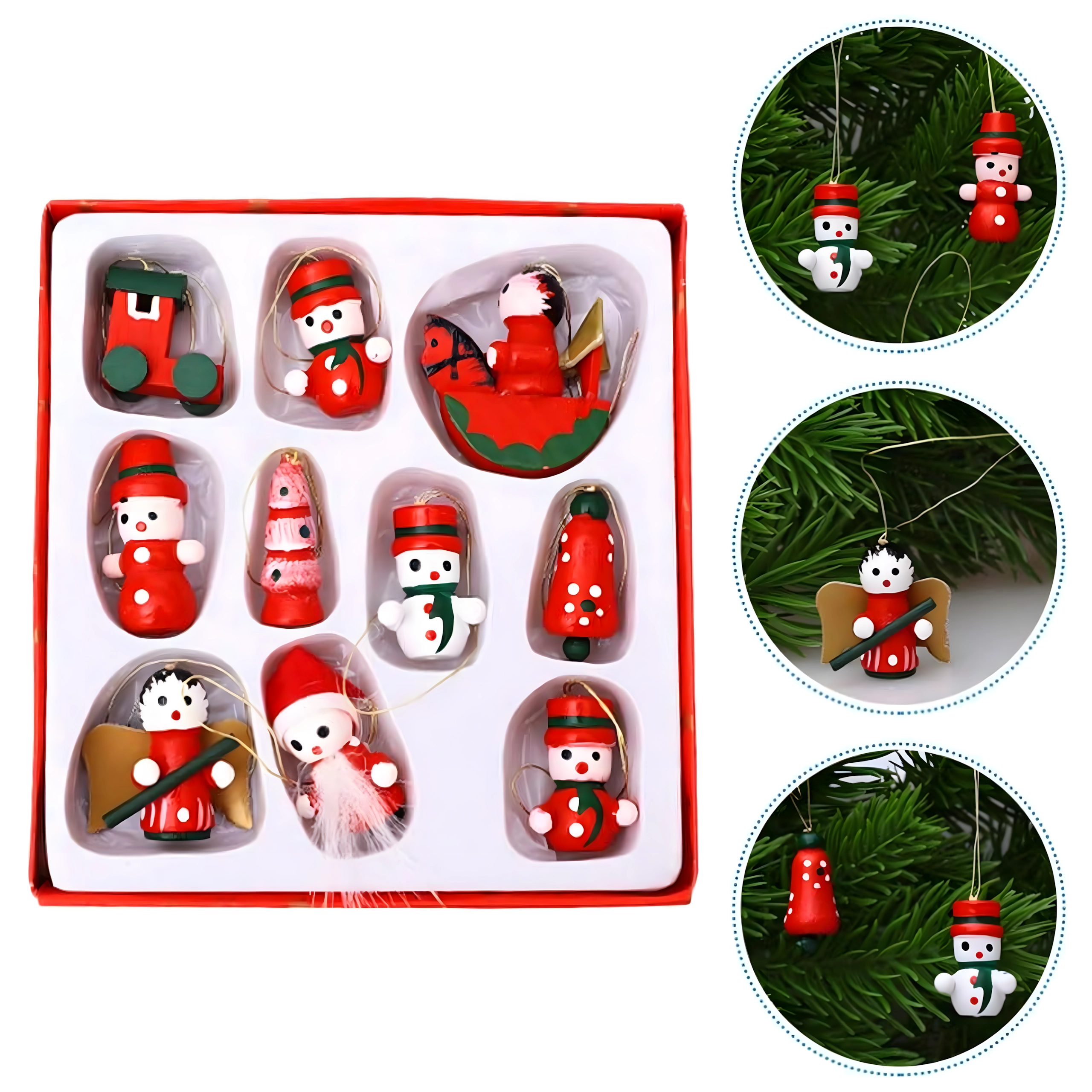 Set de 10 ornamente de Crăciun din lemn pentru agățat este o decorațiune atemporală care aduce farmec oricărui brad și oricărei decorări de sărbătoare. Sunt realizate din lemn ușor și imposibil de spart, fiind sigure pentru copii și animale de companie. Motive variate – gheată, Moș Crăciun, brăduț, înger, clopoțel și altele – creează acasă o atmosferă caldă și festivă.