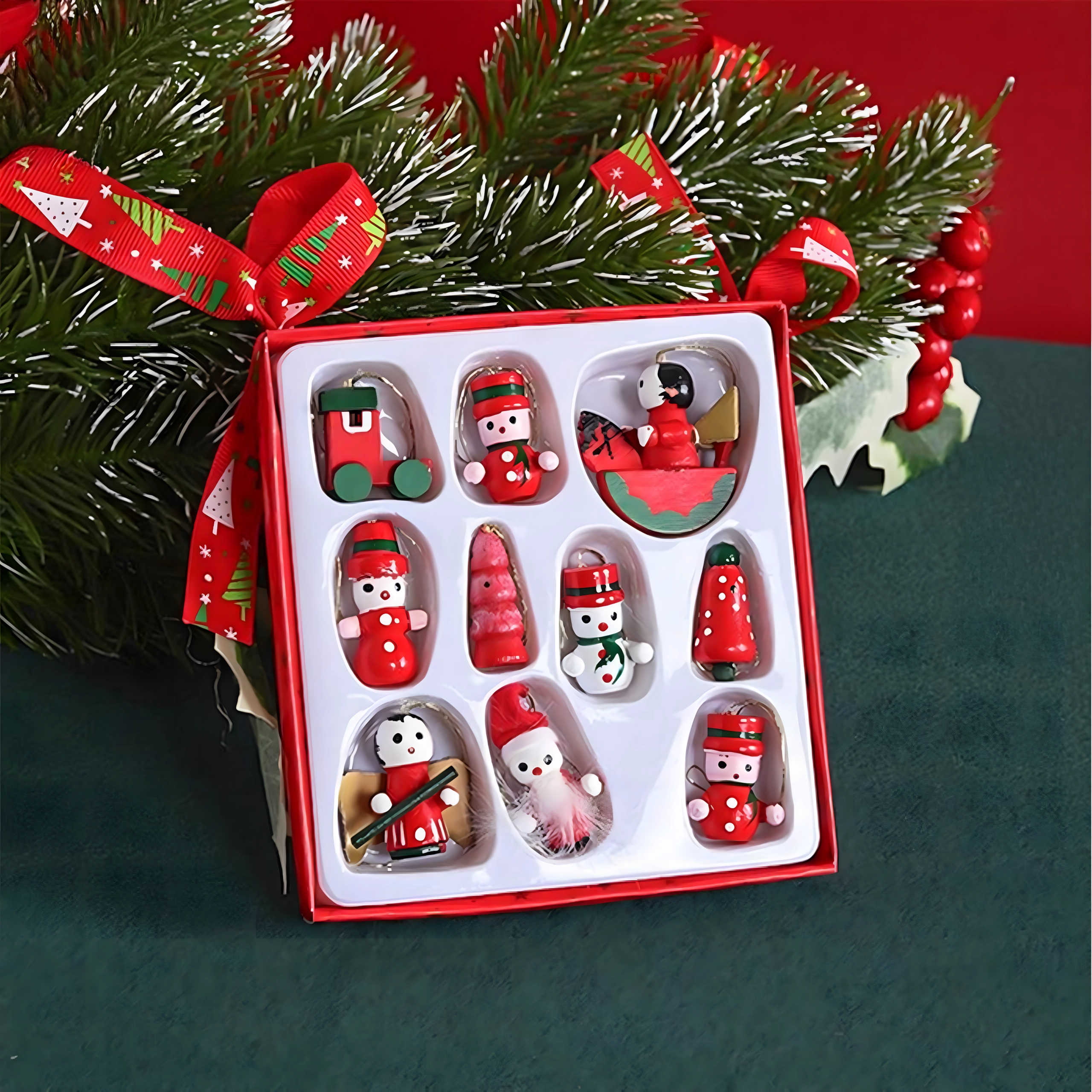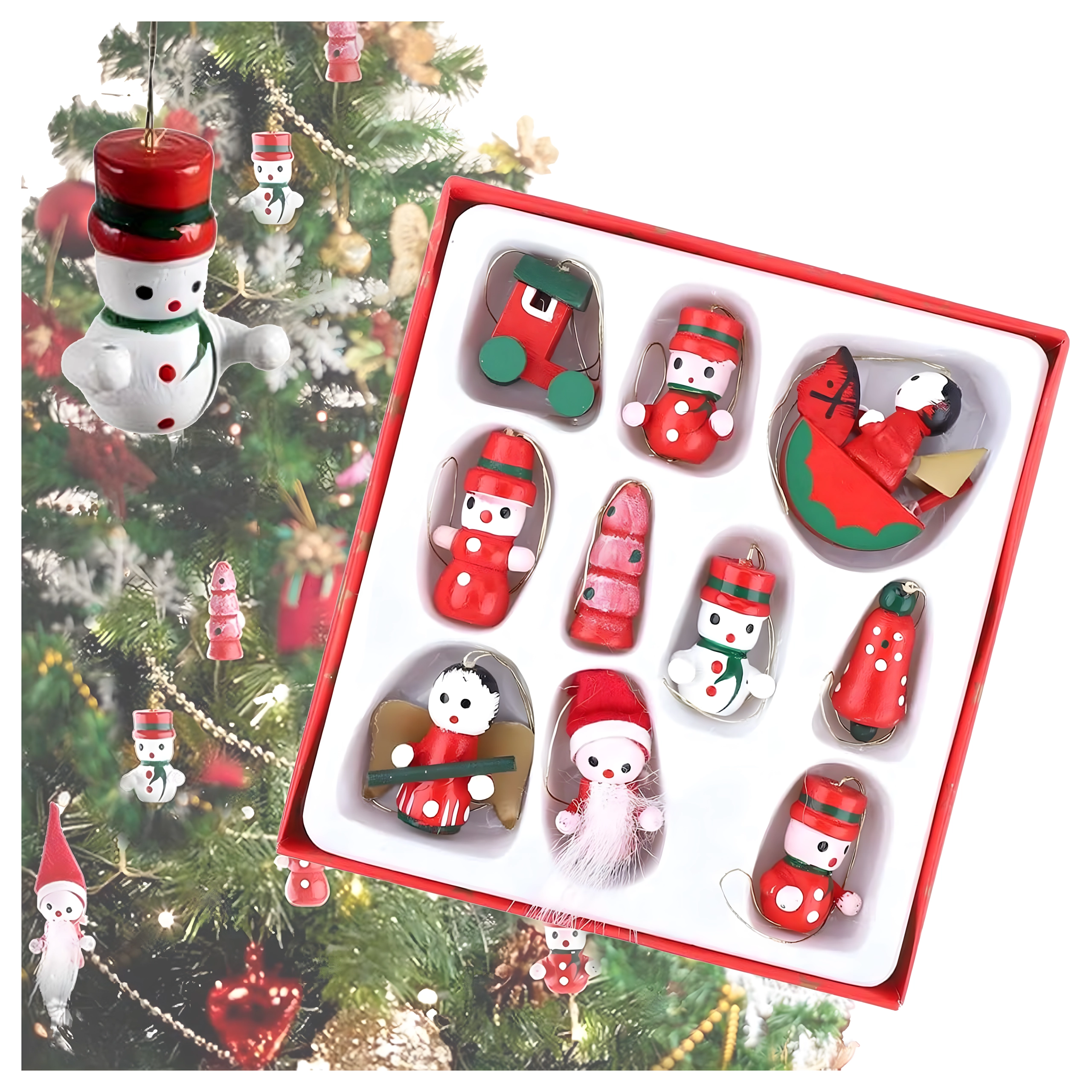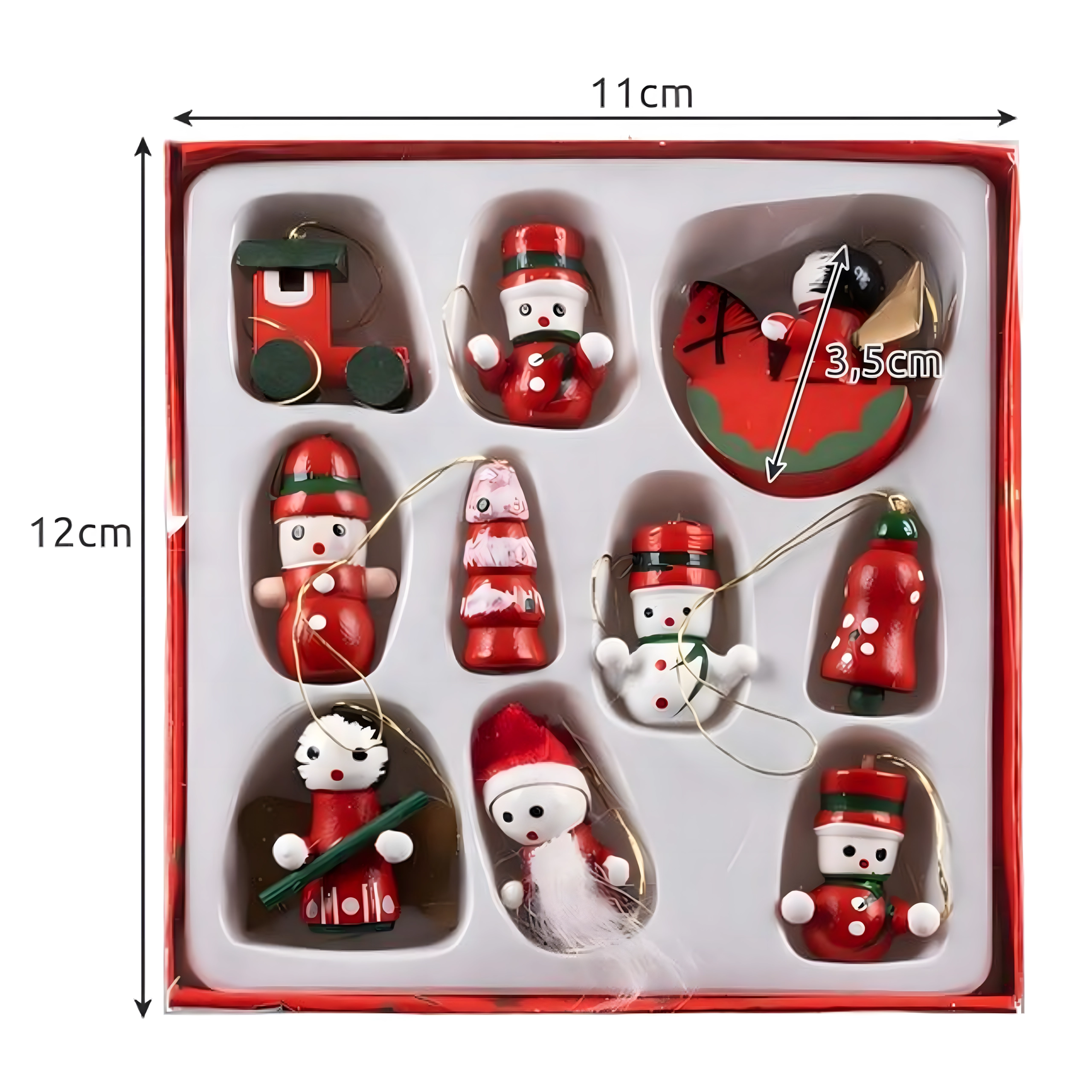 Set de 10 ornamente de Crăciun din lemn pentru agățat este o decorațiune atemporală care aduce farmec oricărui brad și oricărei decorări de sărbătoare. Sunt realizate din lemn ușor și imposibil de spart, fiind sigure pentru copii și animale de companie. Motive variate – gheată, Moș Crăciun, brăduț, înger, clopoțel și altele – creează acasă o atmosferă caldă și festivă.