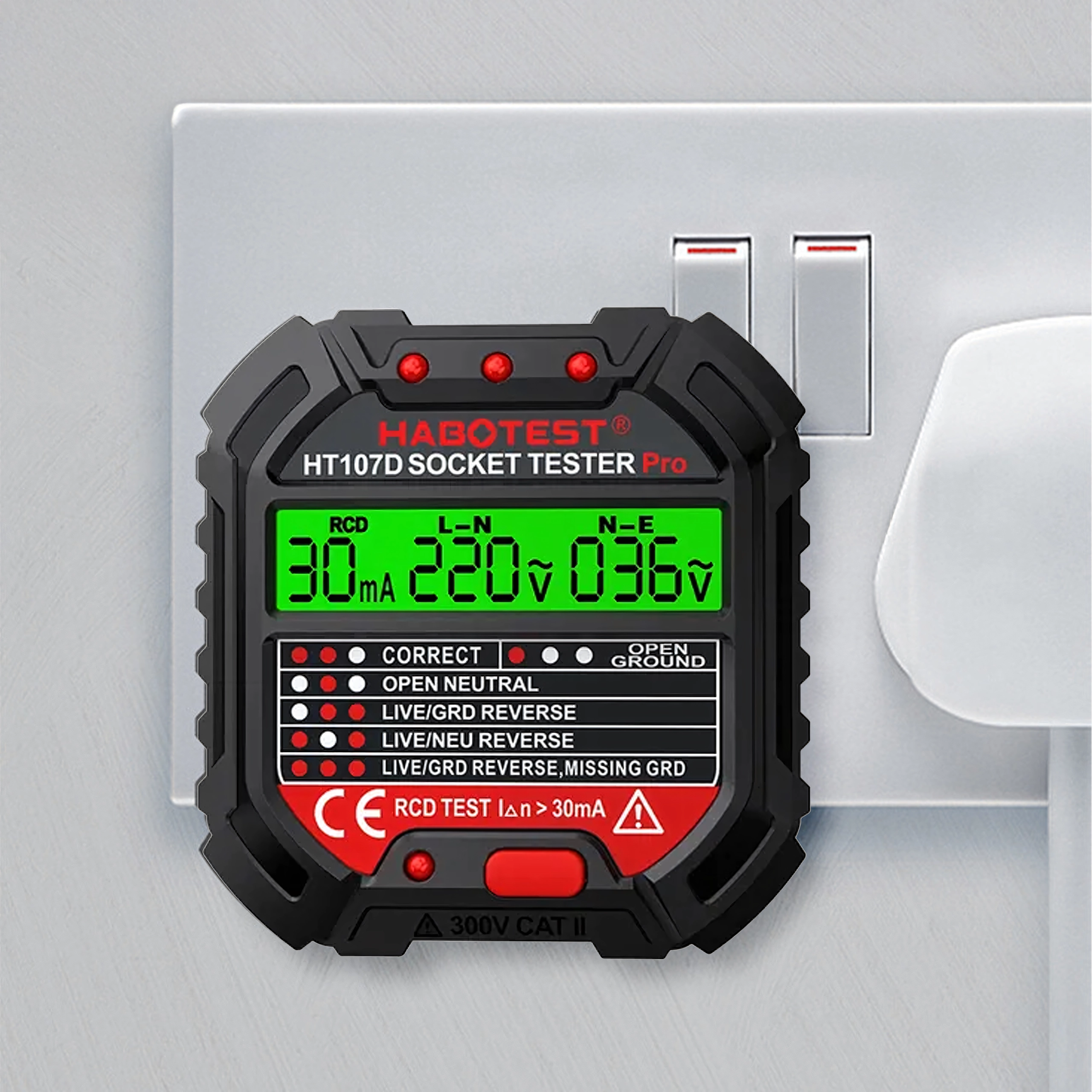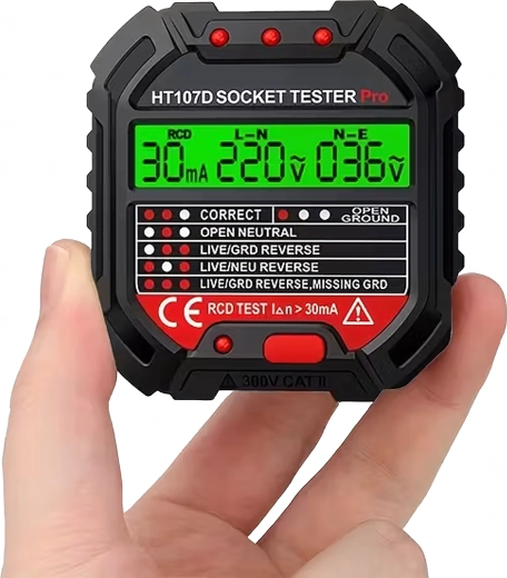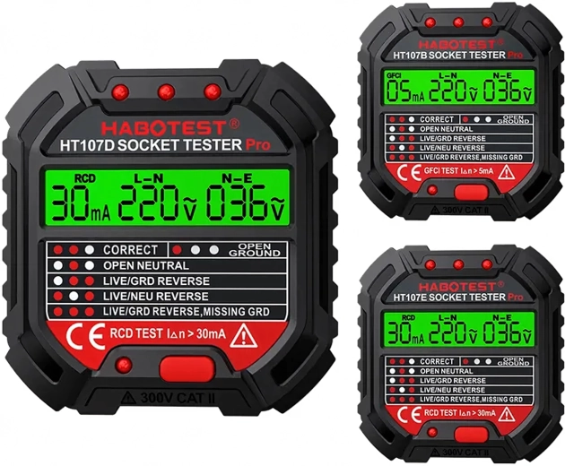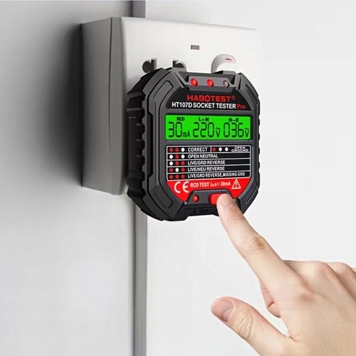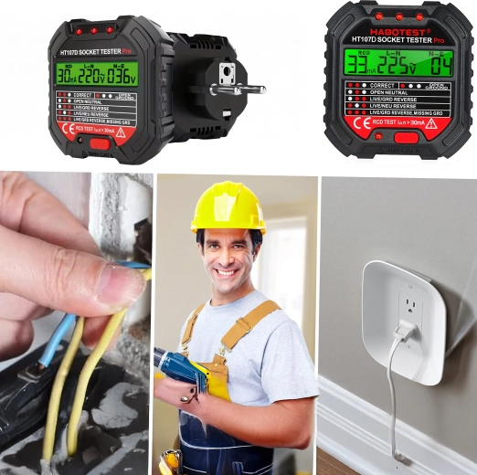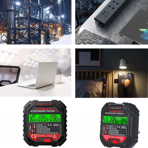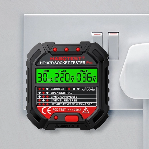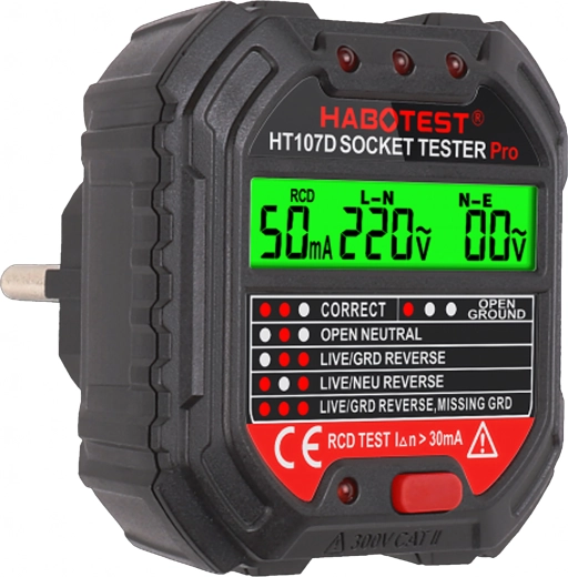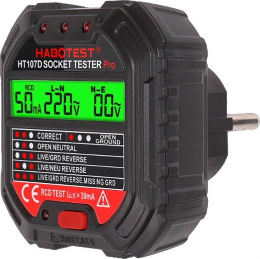 Asigurați-vă siguranța acasă, la birou și în atelier cu testerul inteligent de tensiune HABOTEST HT107D. Acest tester de prize compact și foarte funcțional cu ecran LCD detectează rapid erorile din instalația electrică și ajută la prevenirea defecțiunilor și reparațiilor costisitoare. Suportă, de asemenea, test RCD (întrerupător diferențial) pentru verificarea corectă a protecției circuitului.