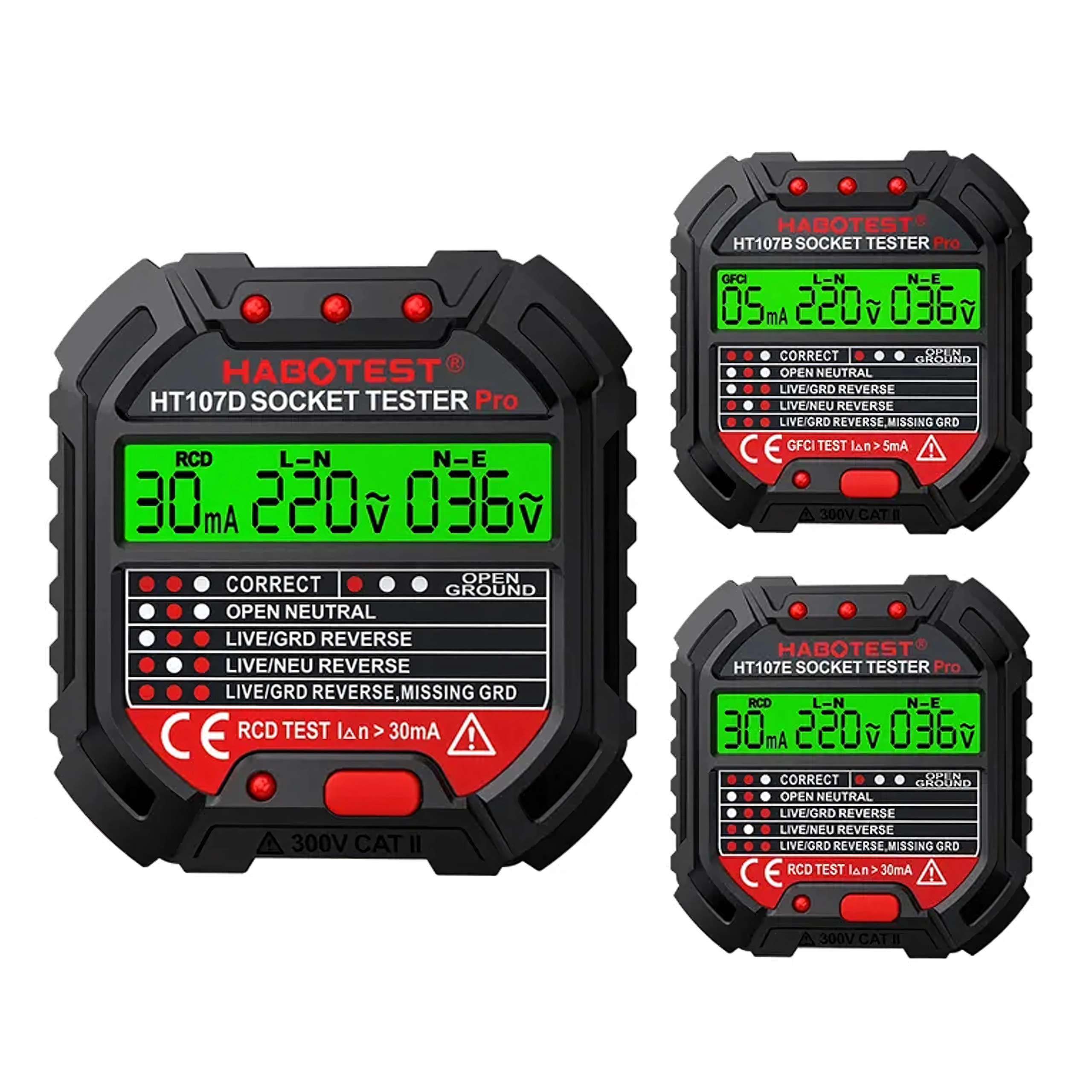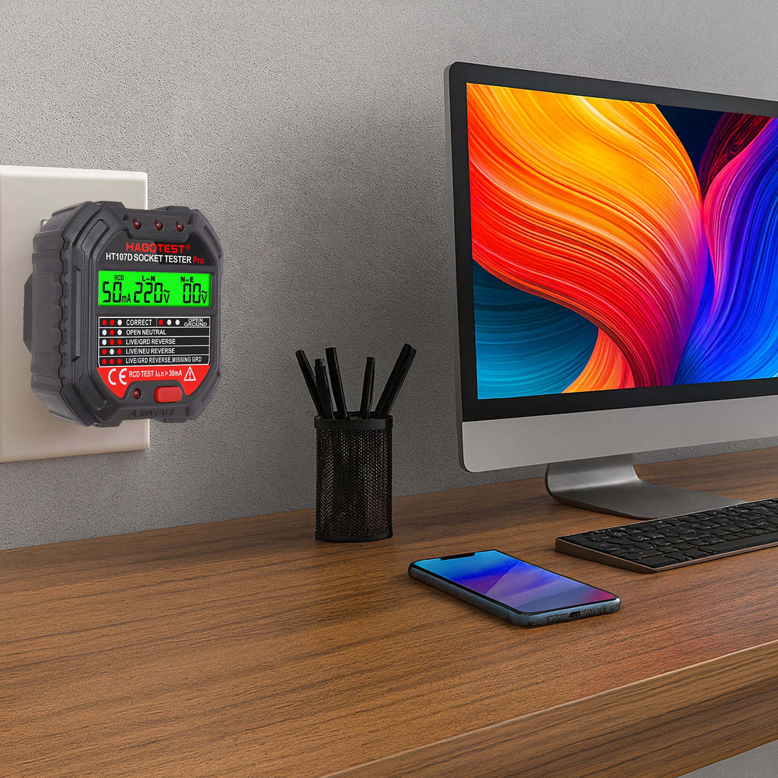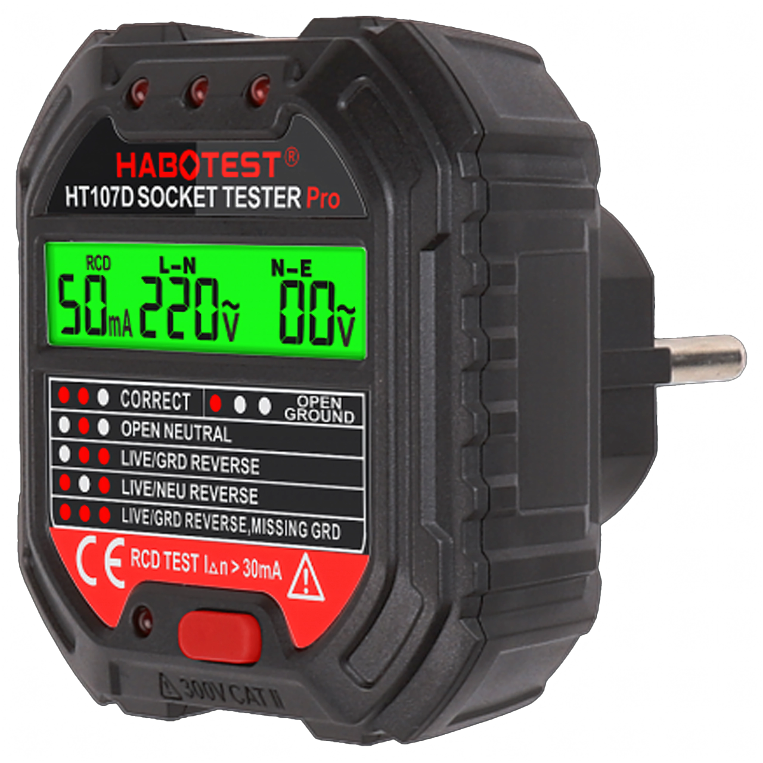Asigurați-vă siguranța acasă, la birou și în atelier cu testerul inteligent de tensiune HABOTEST HT107D. Acest tester de prize compact și foarte funcțional cu ecran LCD detectează rapid erorile din instalația electrică și ajută la prevenirea defecțiunilor și reparațiilor costisitoare. Suportă, de asemenea, test RCD (întrerupător diferențial) pentru verificarea corectă a protecției circuitului.