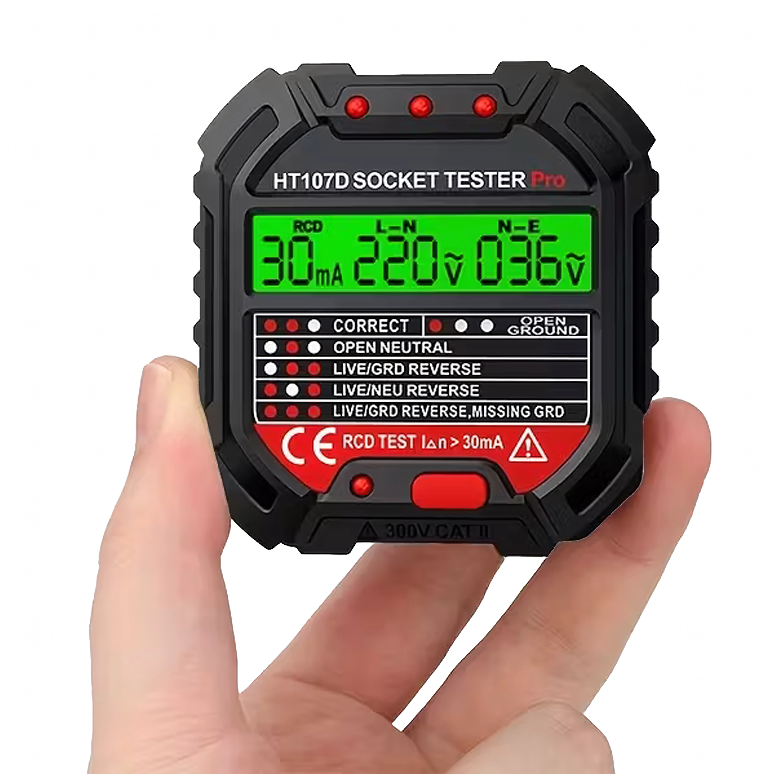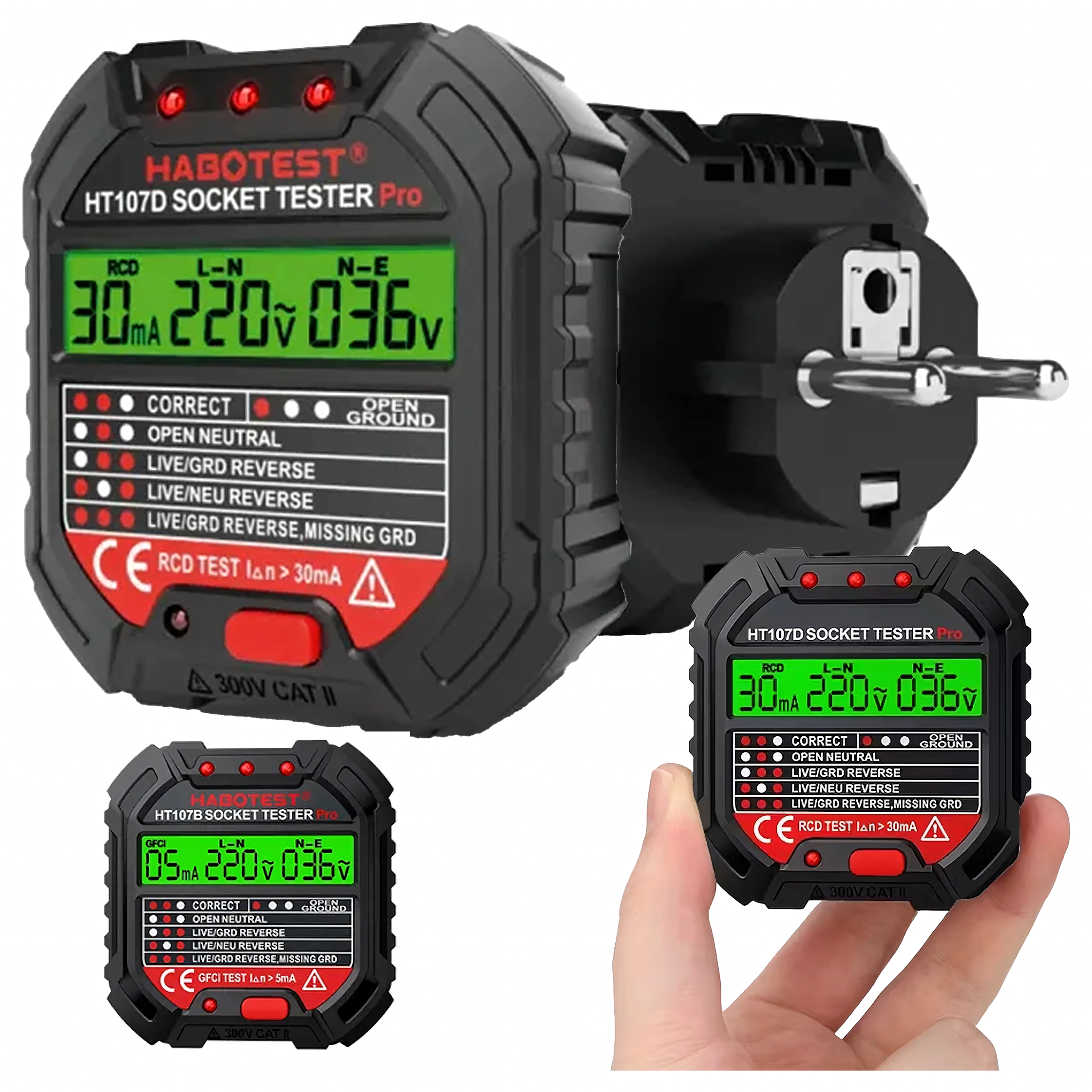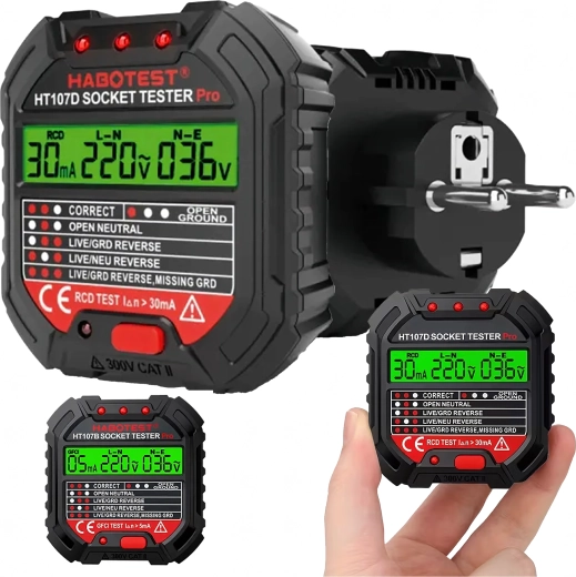 HABOTEST HT107D este un instrument practic pentru verificarea rapidă a prizelor de rețea. Datorită ecranului LCD clar, oferă informații intuitive despre starea conexiunilor și tensiune, astfel încât aflați imediat dacă priza este sigură pentru utilizare. Testul RCD integrat permite verificarea funcționalității întrerupătorului diferențial și crește protecția împotriva electrocutării.