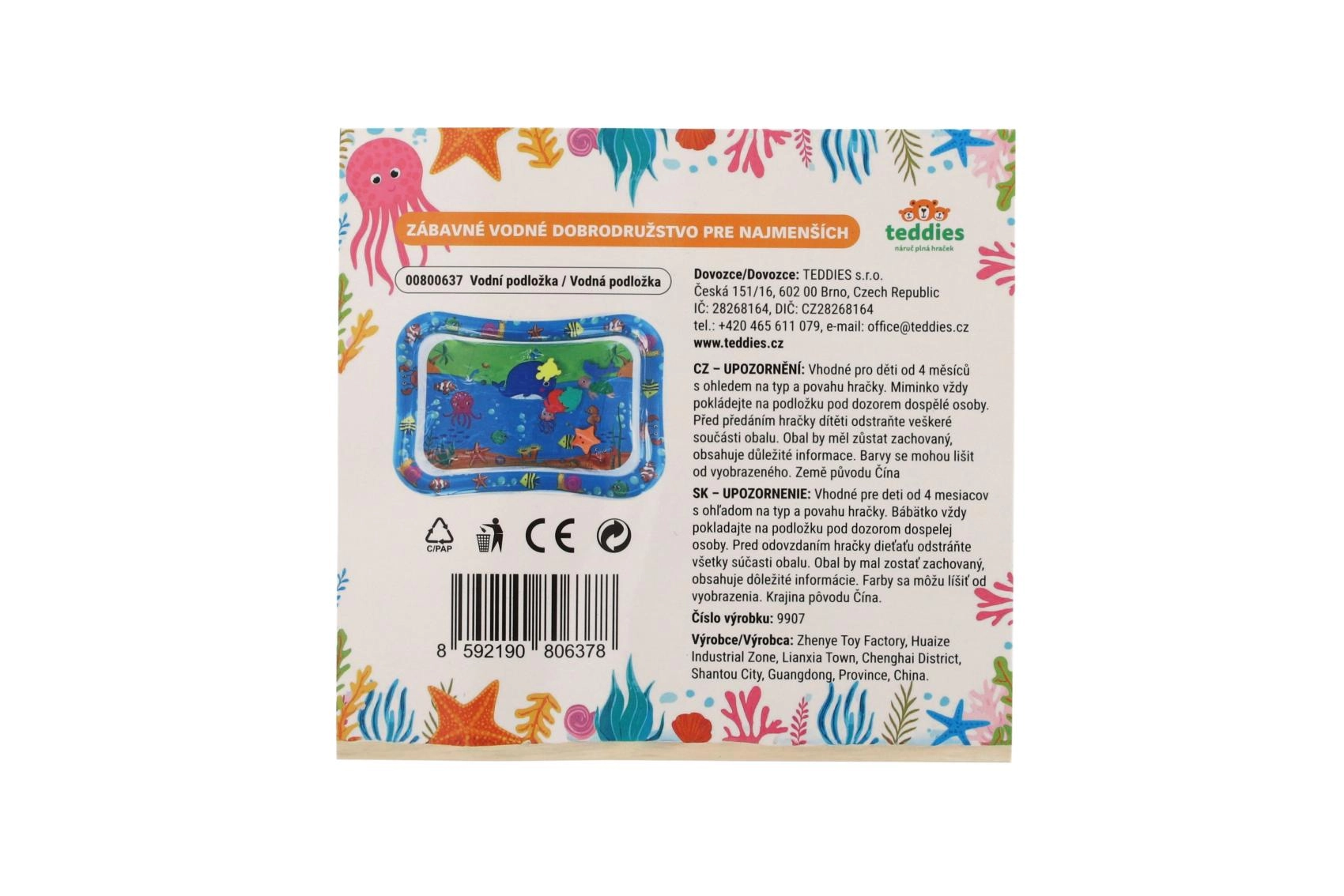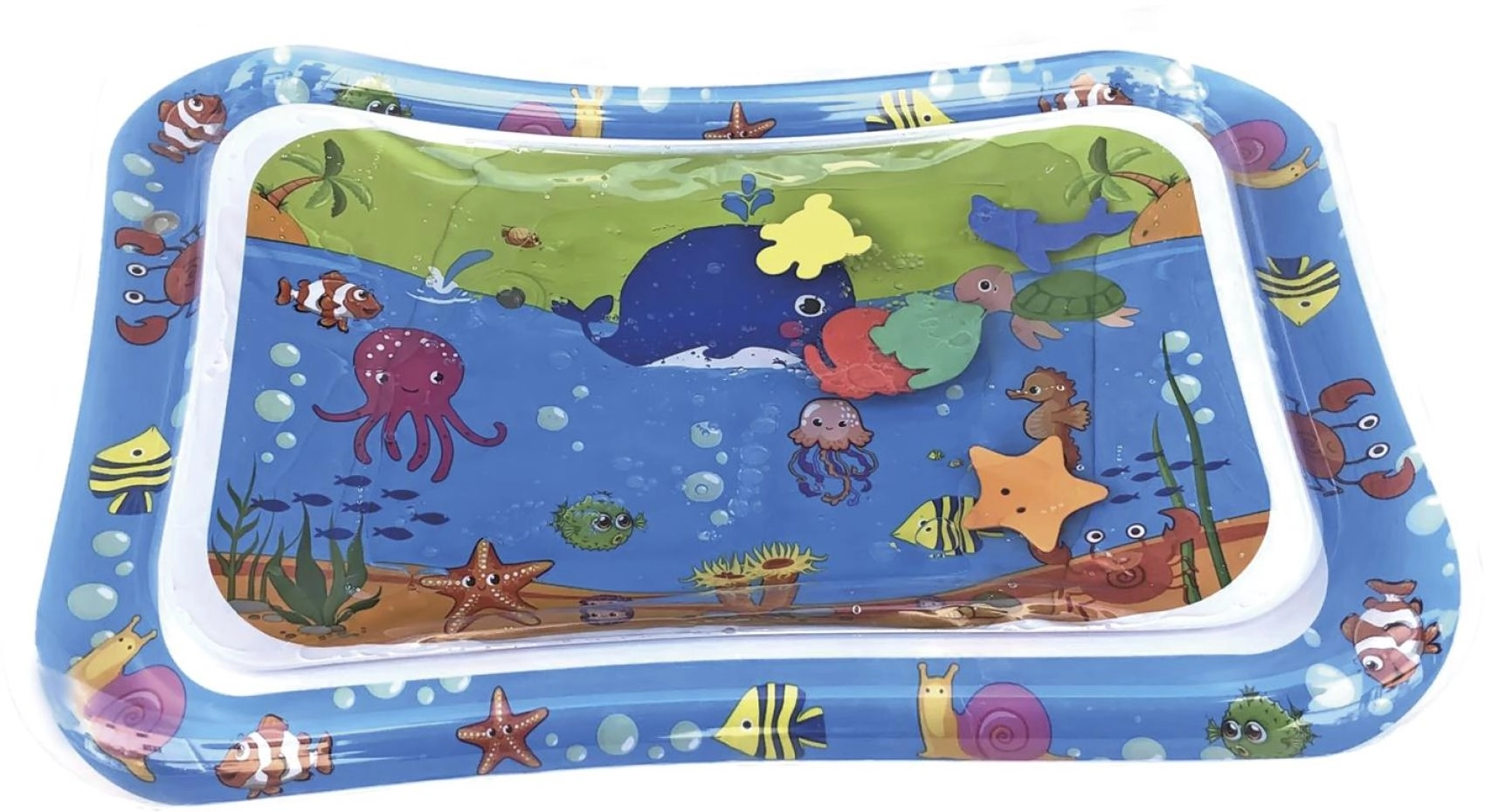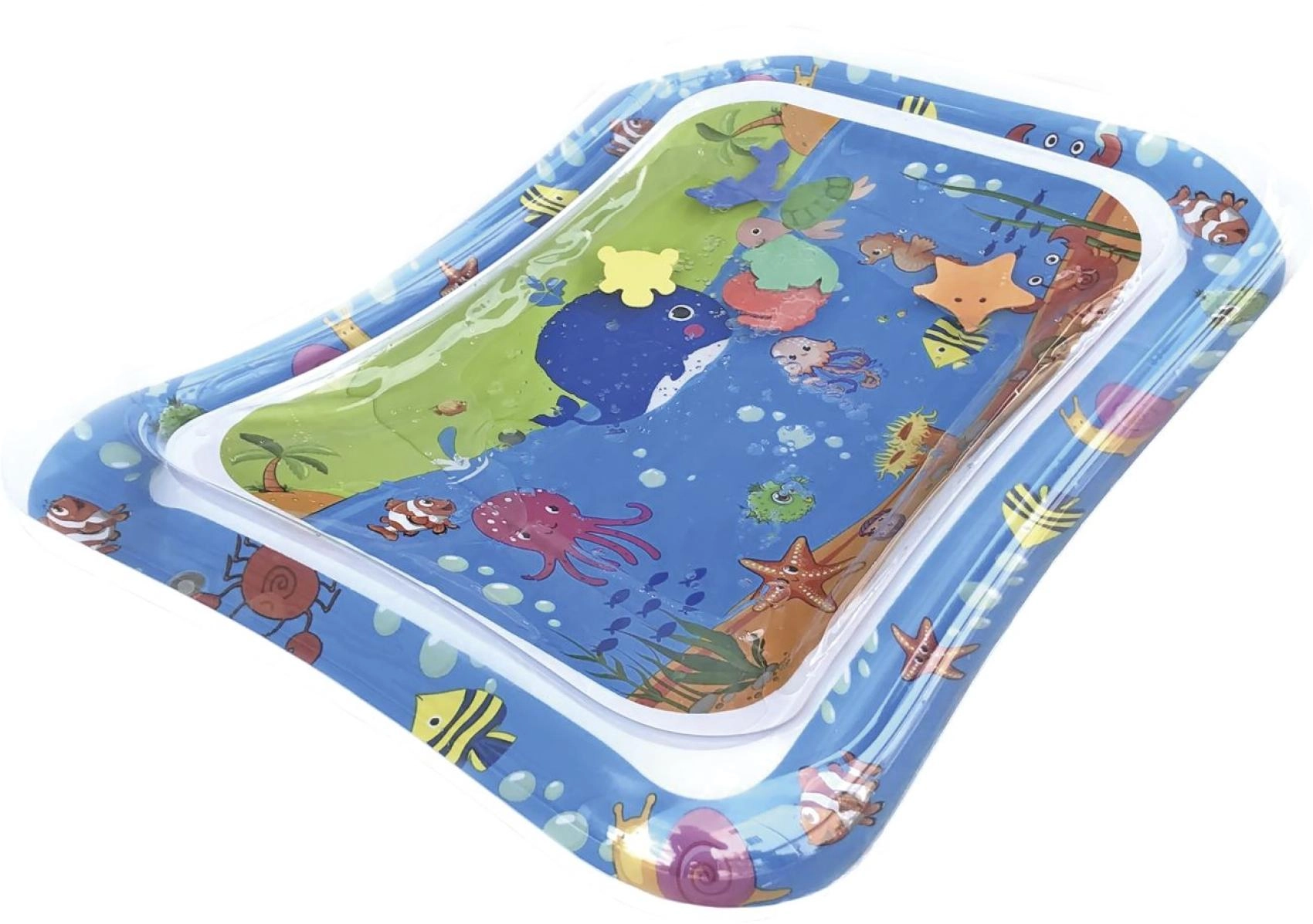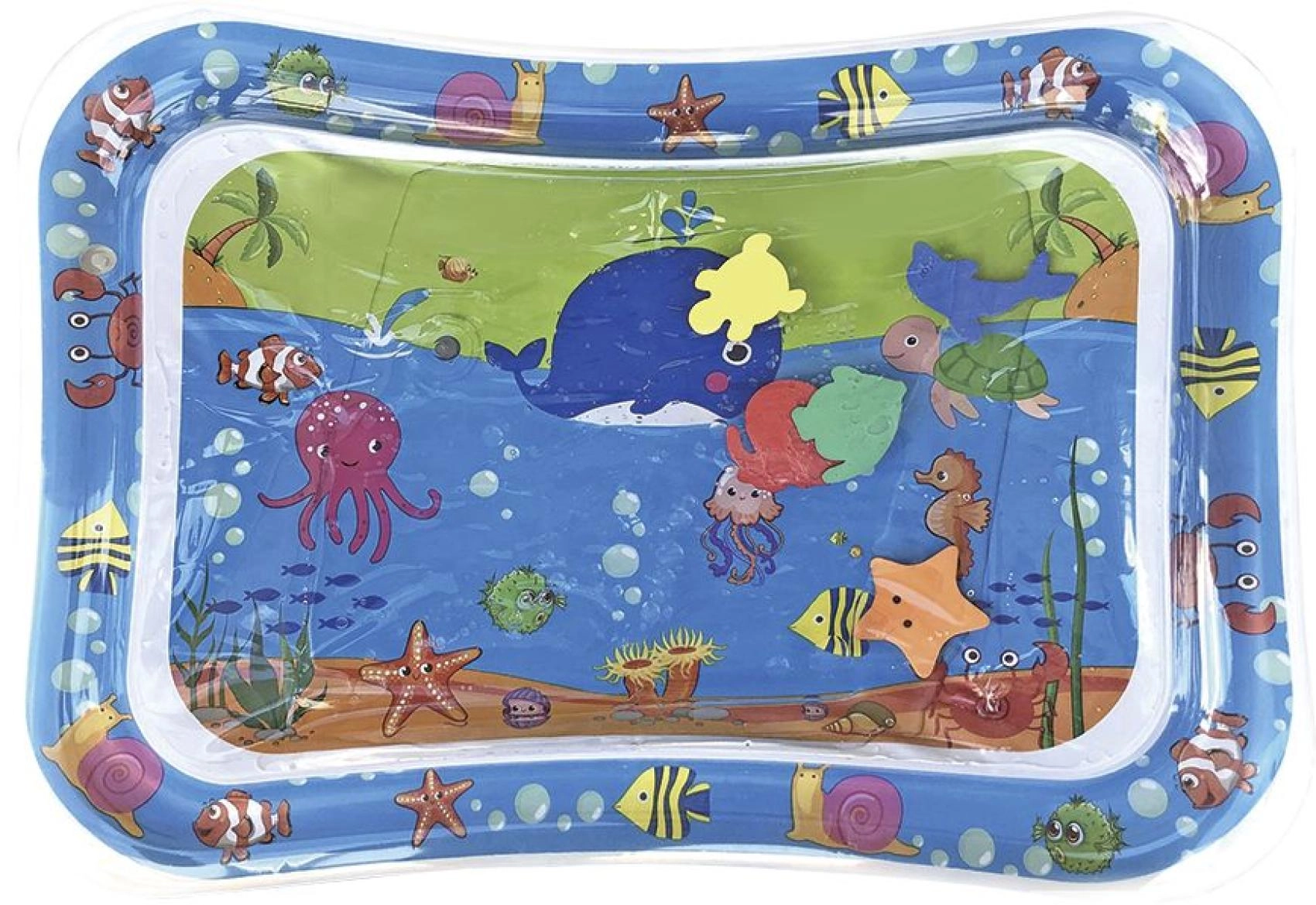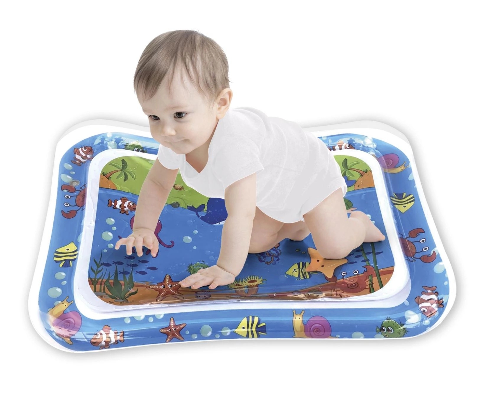Această saltea gonflabilă cu apă, cu motive oceanice, oferă copiilor un mediu sigur și distractiv pentru joaca pe burtică și pentru primele ridicări ale capului. Camera cu apă și forme plutitoare creează un efect de mișcare care stimulează natural vederea, simțul tactil și coordonarea mână–ochi.