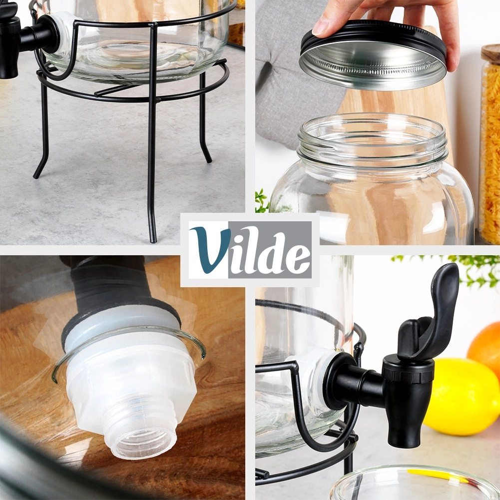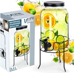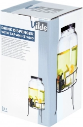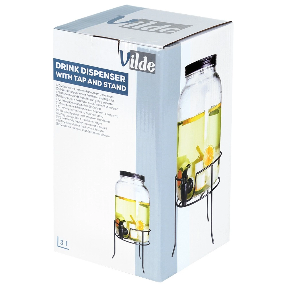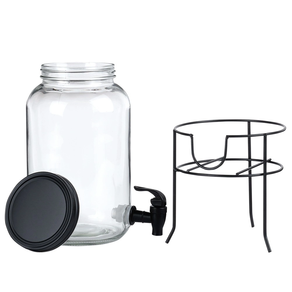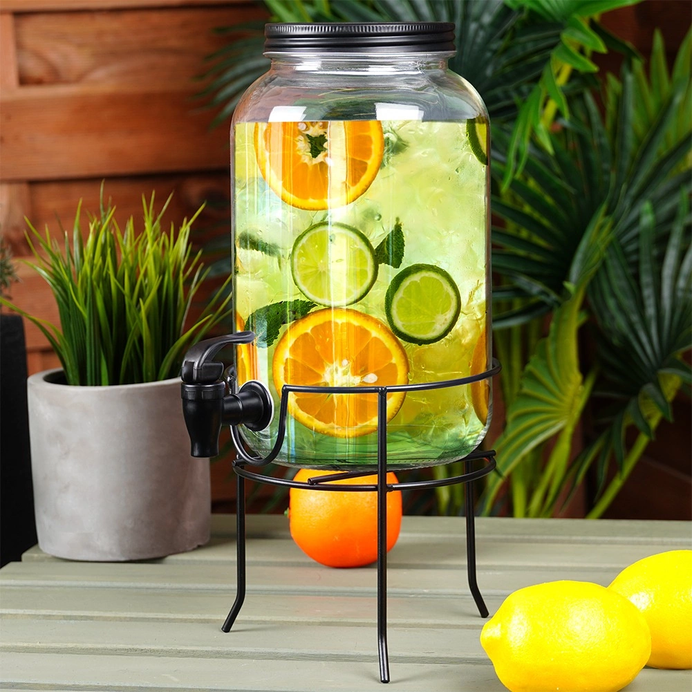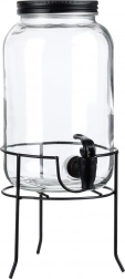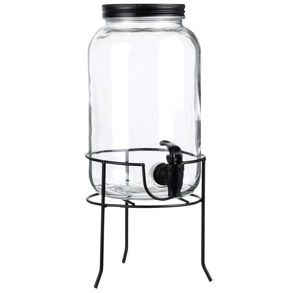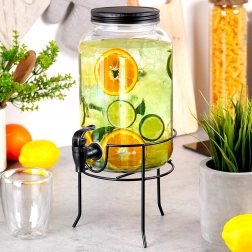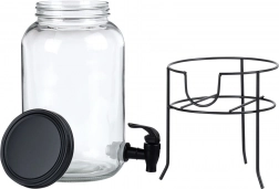 Dozator practic de băuturi din sticlă groasă de calitate, cu robinet negru și capac negru mat, păstrează băuturile răcoritoare protejate de insecte și impurități. Suportul metalic stabil ridică recipientul la înălțimea ideală pentru pahare, astfel turnarea este curată și comodă.