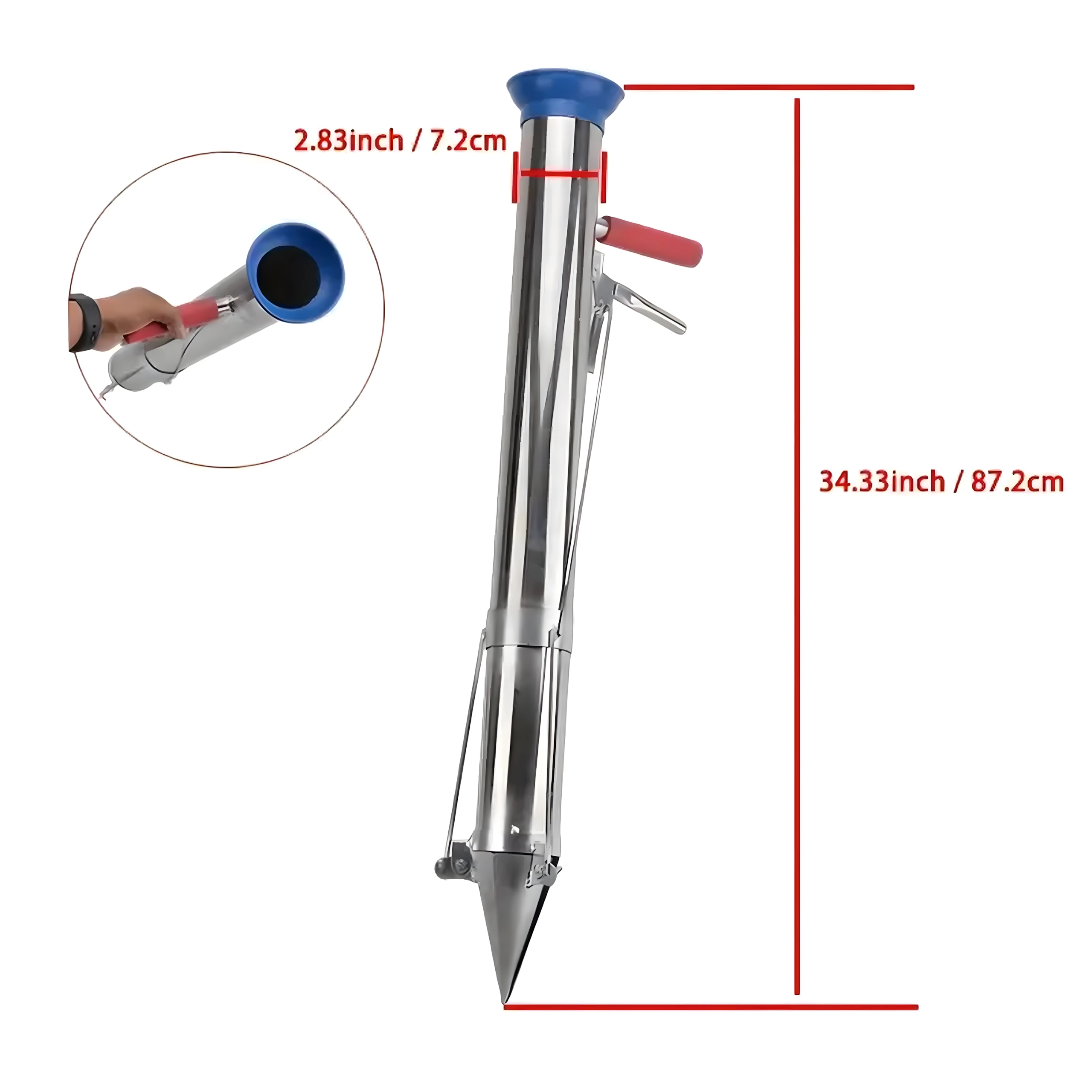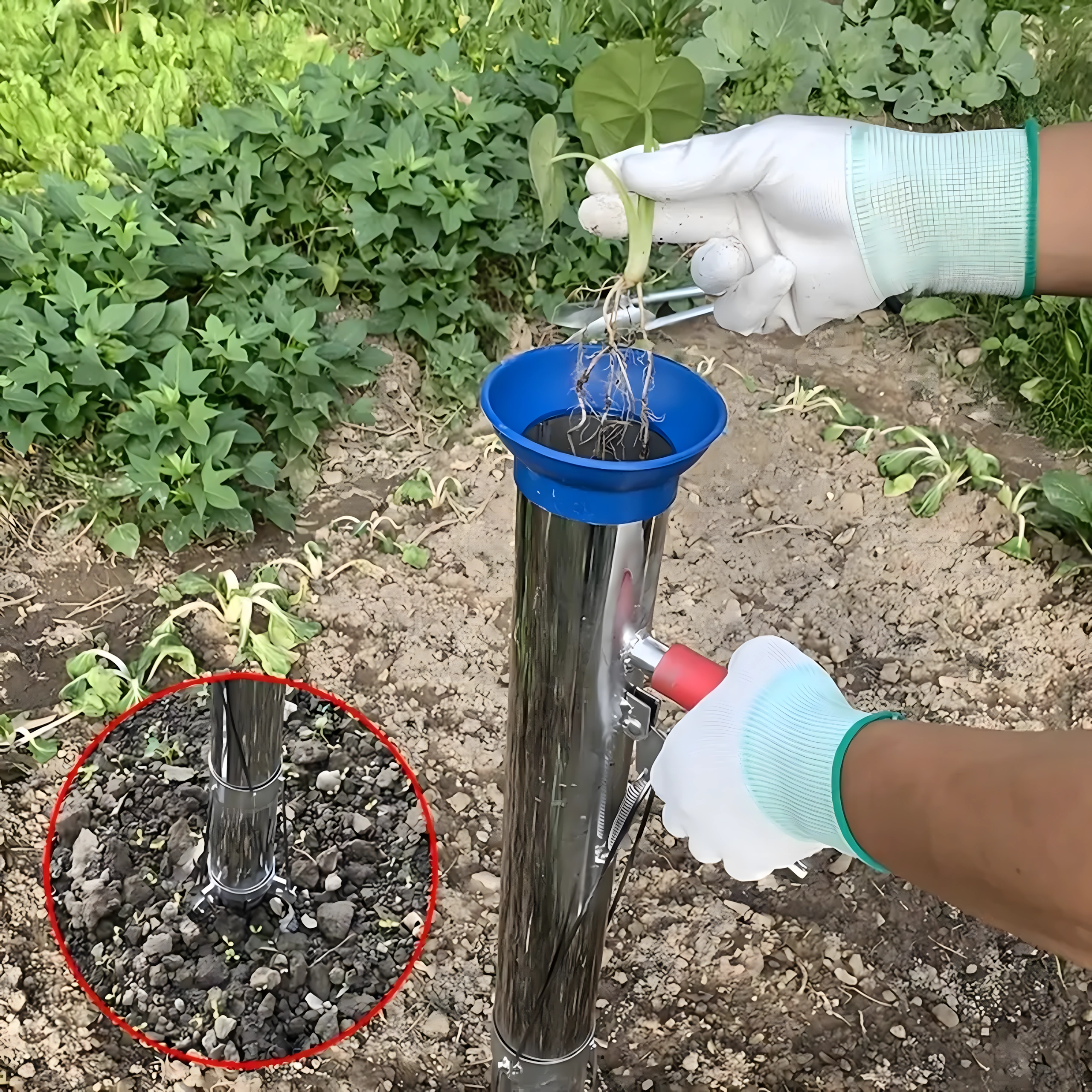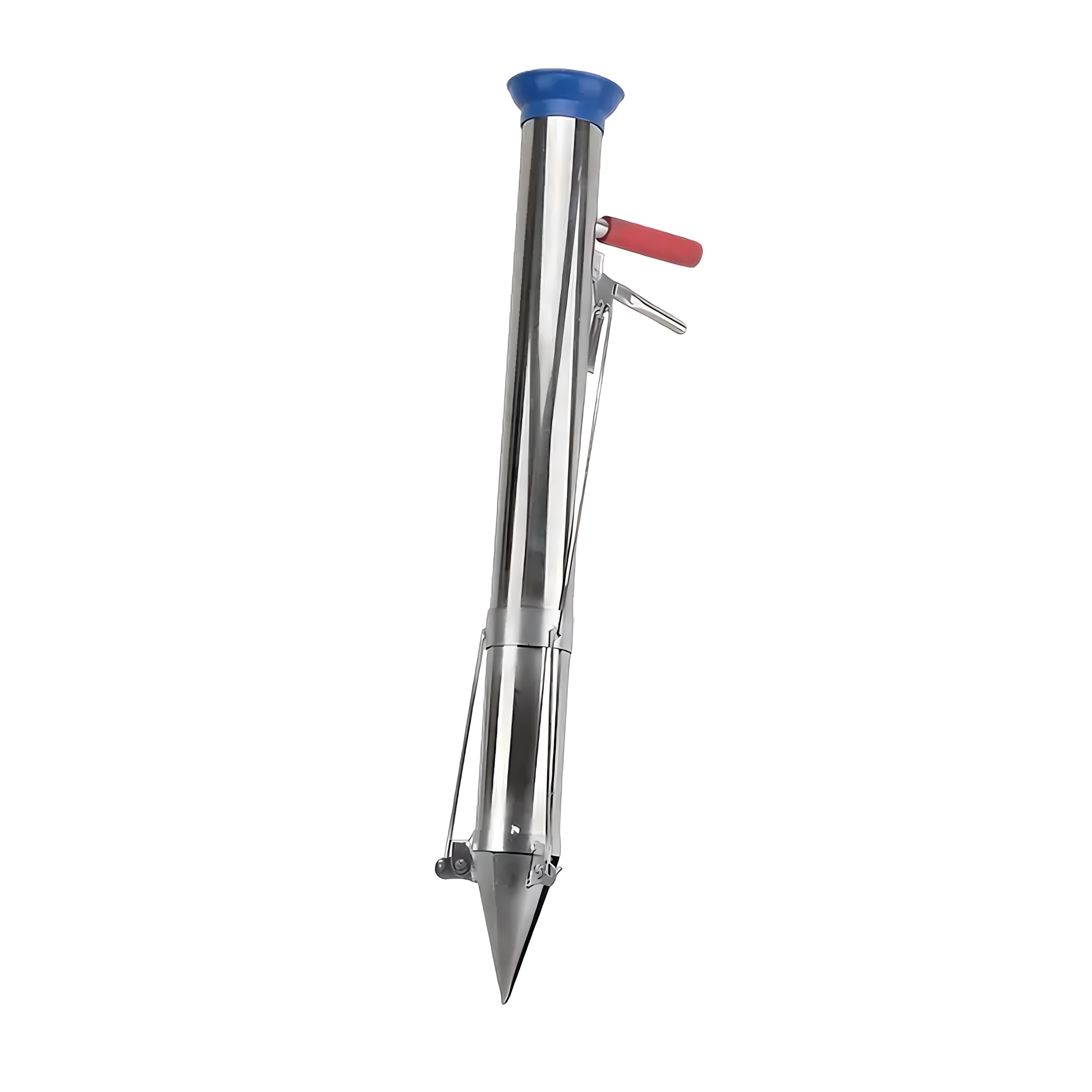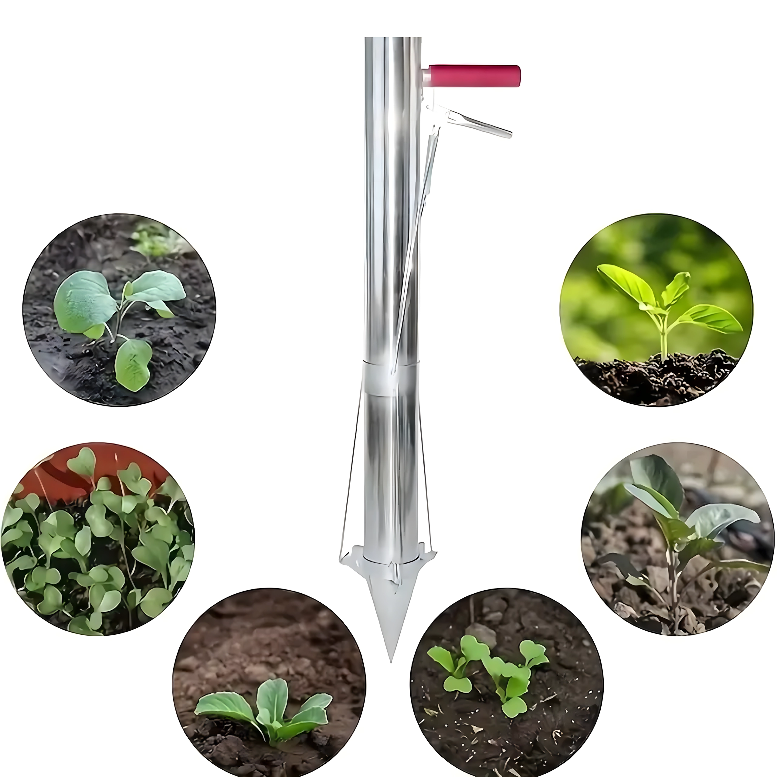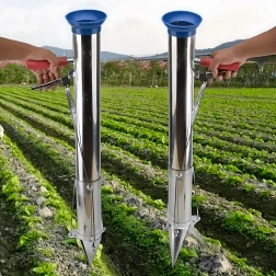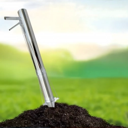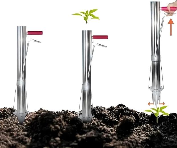 Vârful conic și corpul cilindric creează o gaură curată dintr-o singură apăsare; introduceți răsadul, iar cu pârghia eliberați ușor solul înapoi.