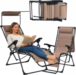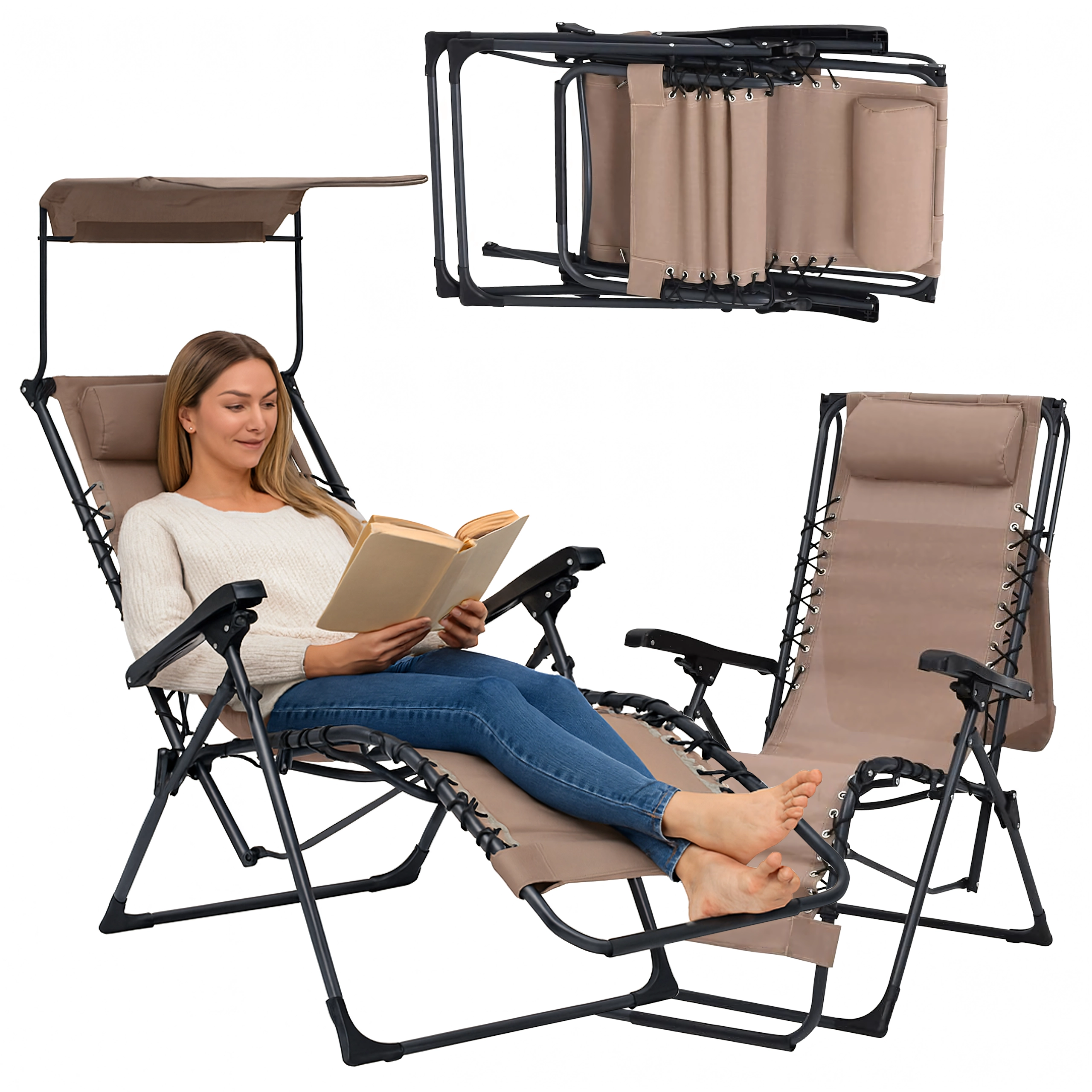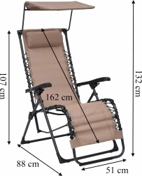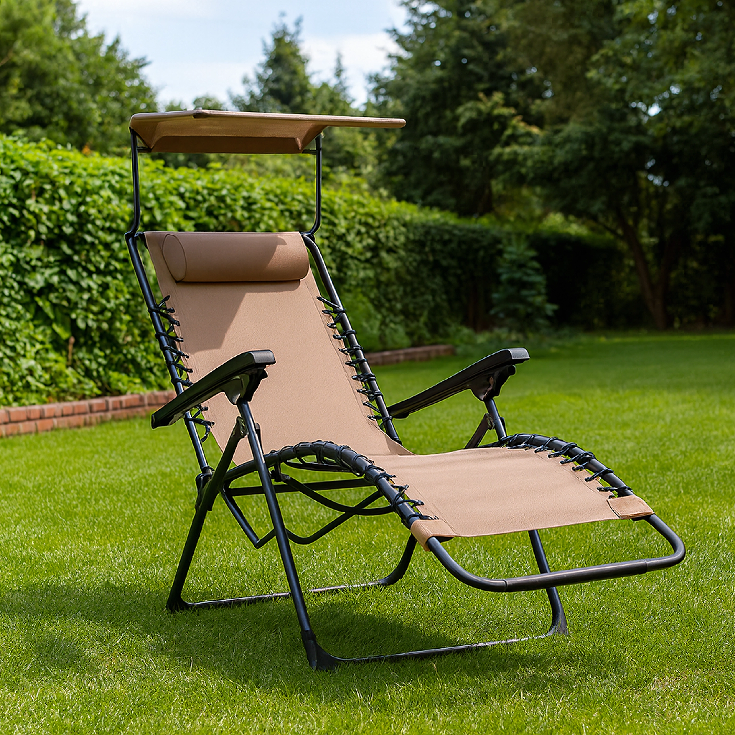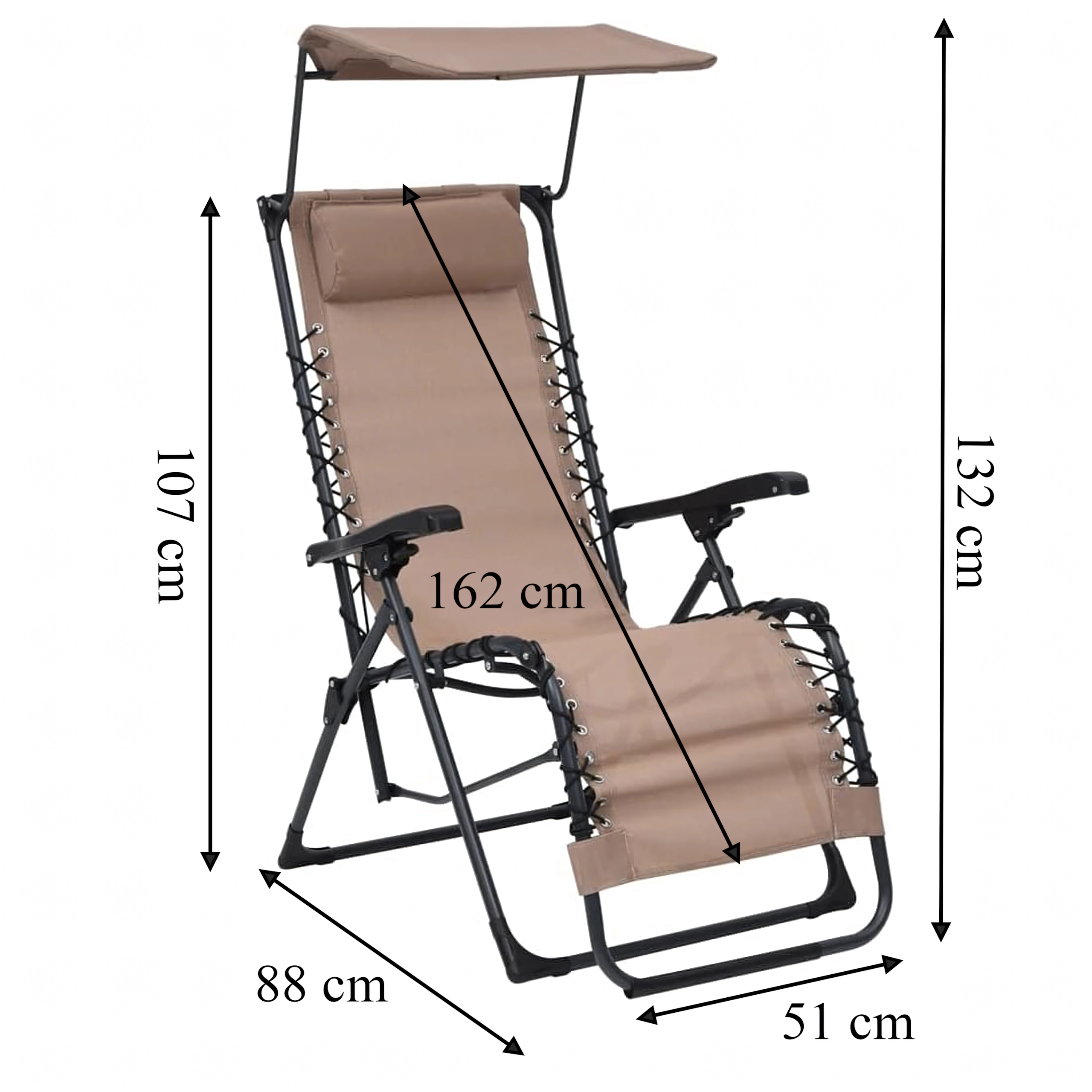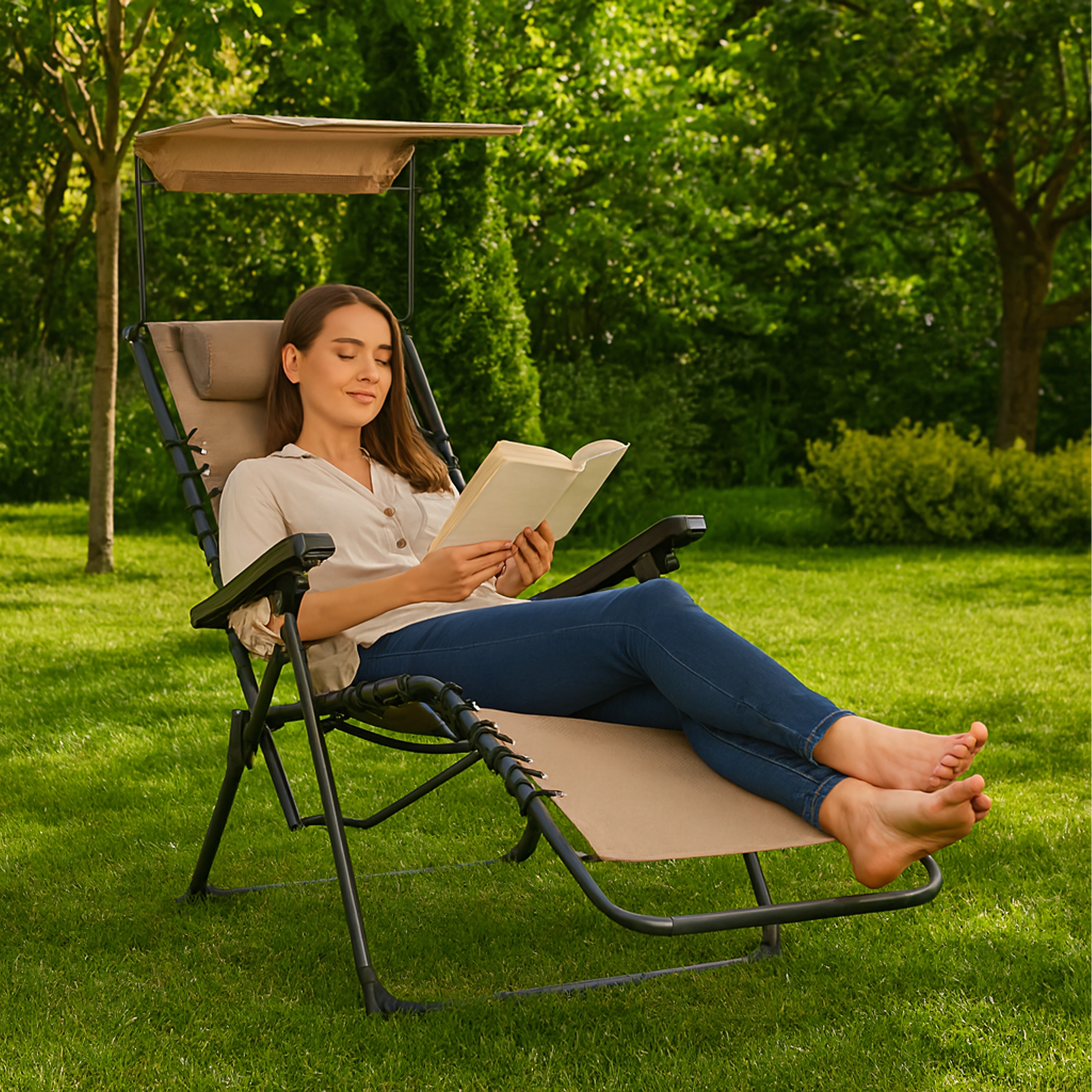 Copertina practică oferă umbră în zilele însorite, iar spătarul ajustabil vă permite să treceți lin de la poziția de șezut la relaxare întins. Perna moale detașabilă pentru cap susține coloana cervicală pentru confort maxim.