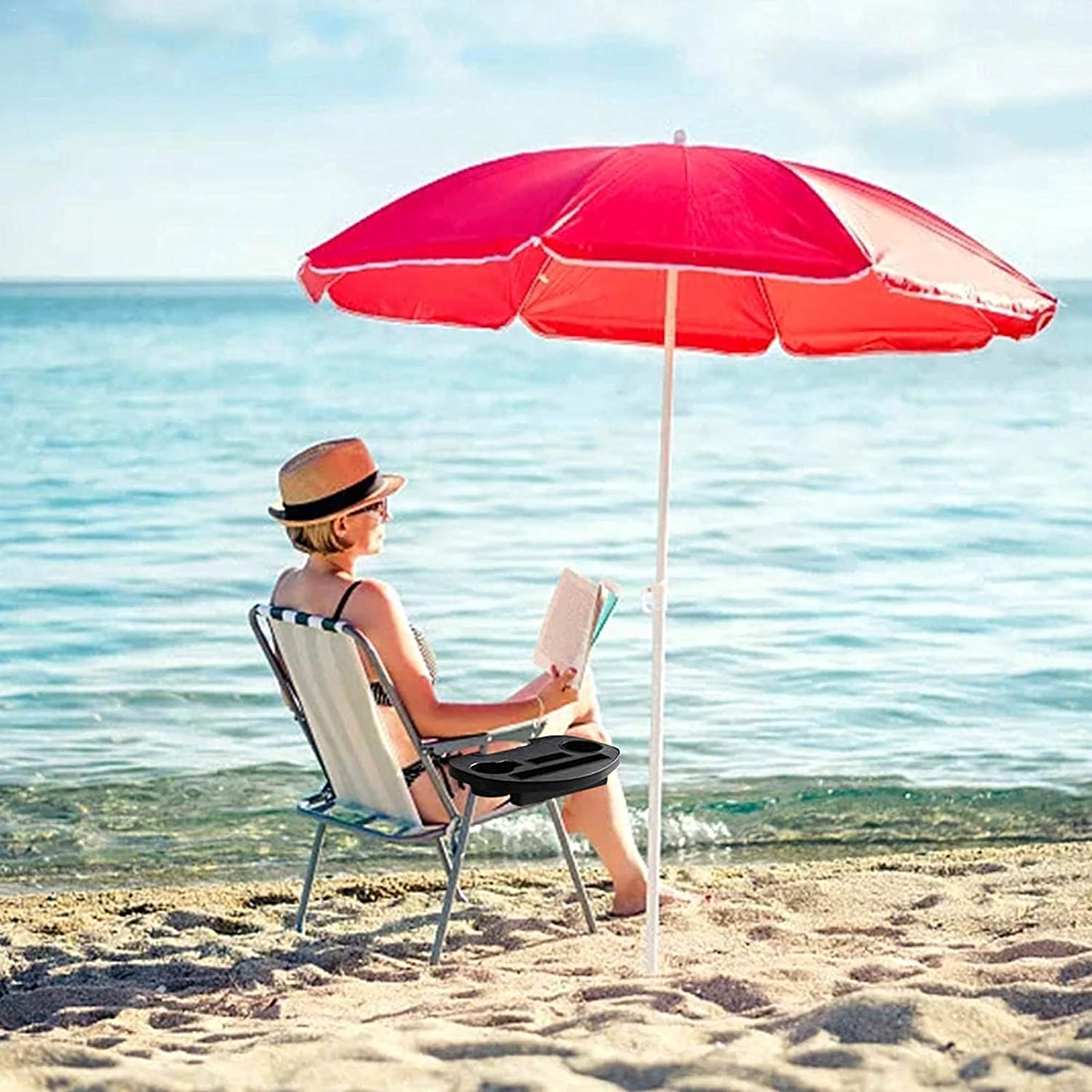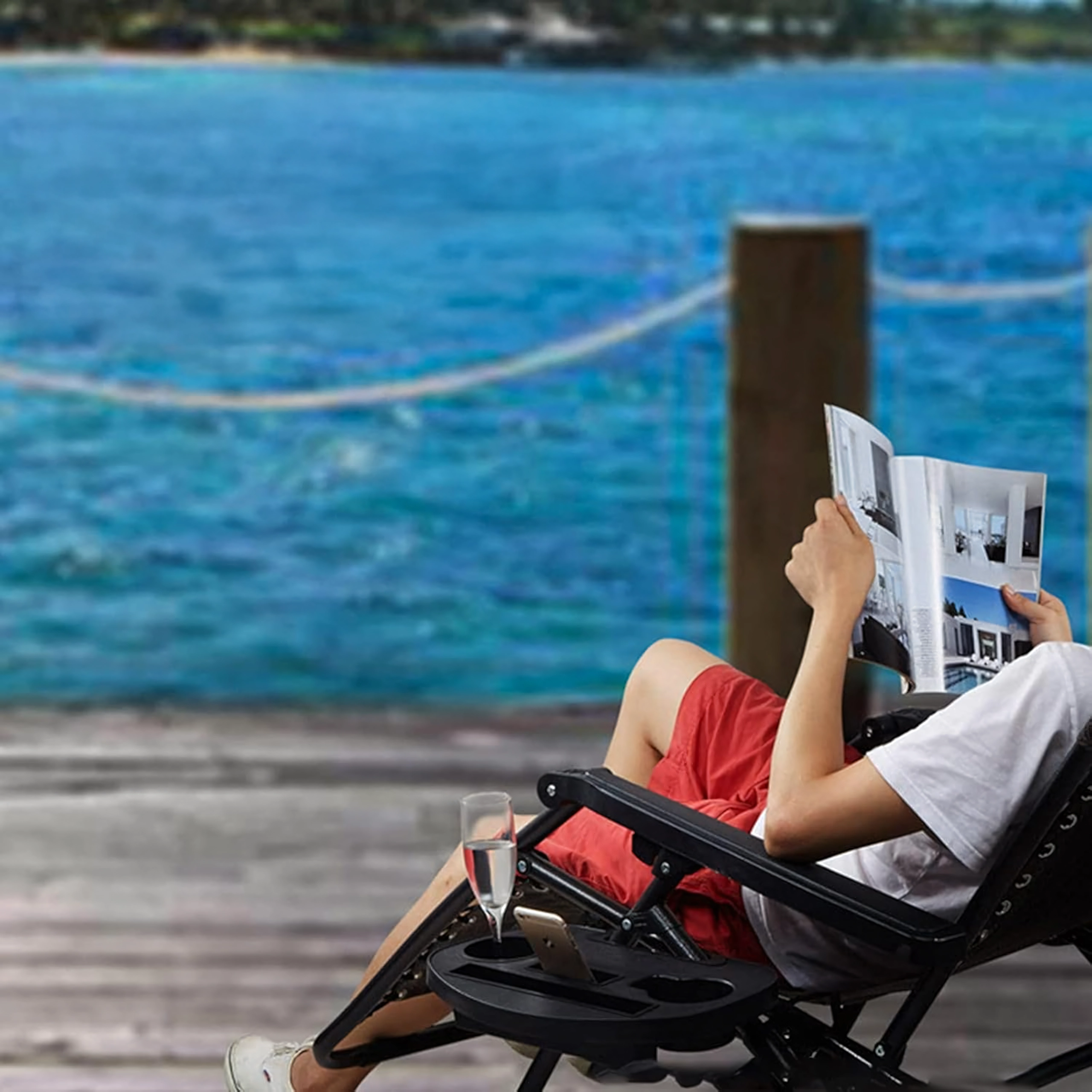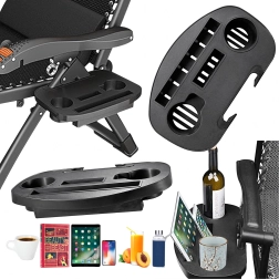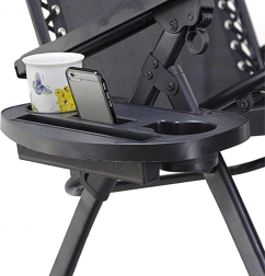 Accesoriu practic pentru șezlongurile Zero Gravity: măsuță universală cu prindere tip clemă, din plastic rezistent, cu compartimente pentru toate lucrurile esențiale. Oferă două suporturi pentru băuturi, slot pentru telefon sau tabletă și spațiu pentru mărunțișuri. Montaj rapid fără unelte – ideală pentru terasă, balcon, grădină, plajă și camping.