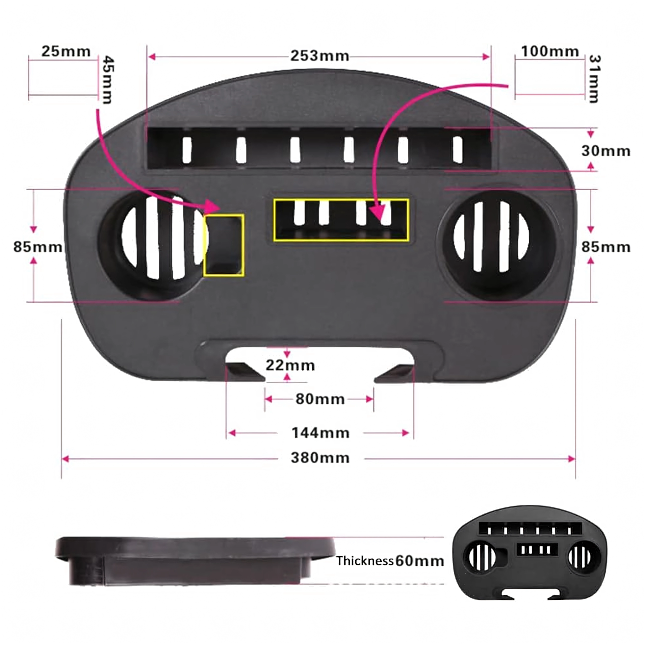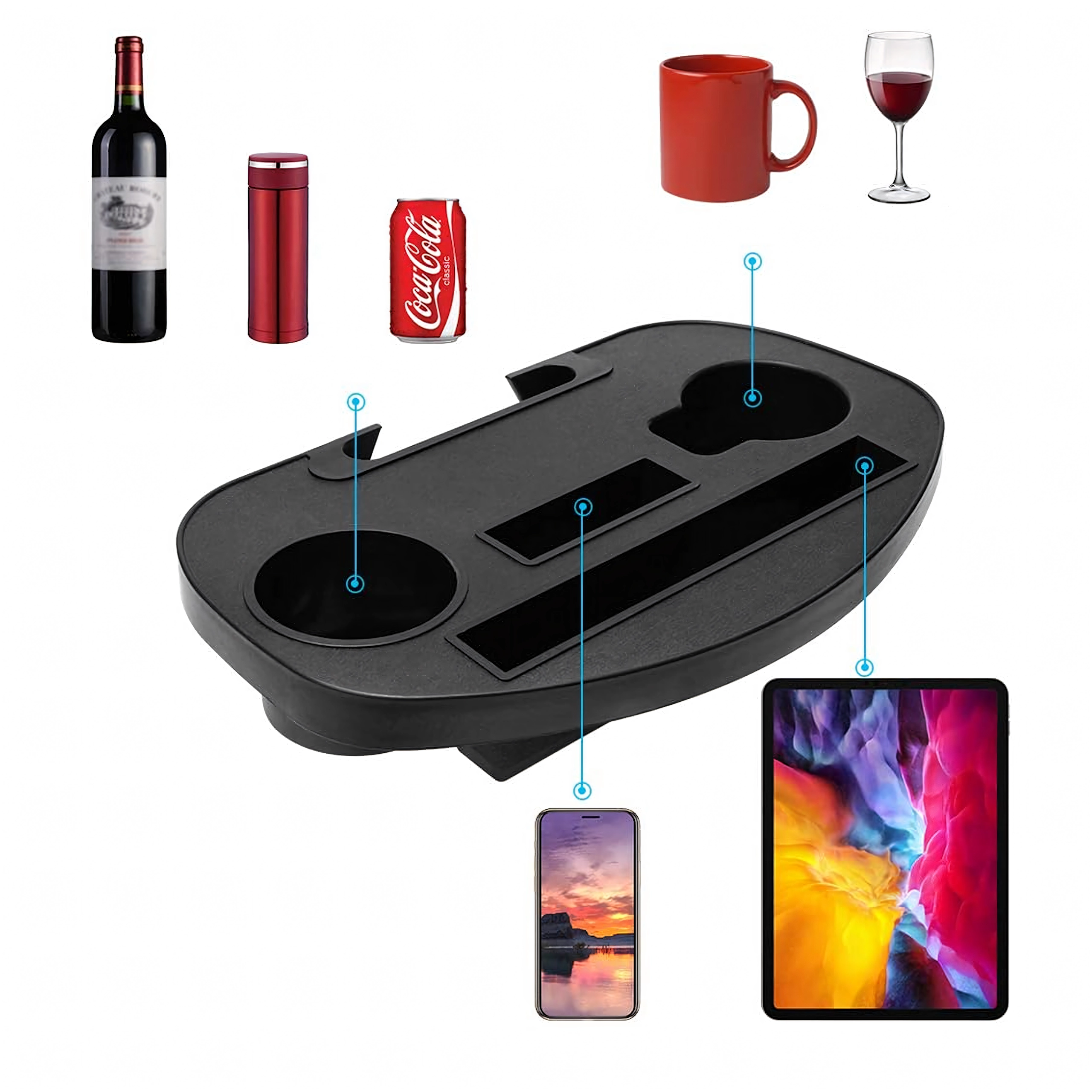 - 2× suport pentru băuturi, slot pentru telefon/tabletă, compartimente pentru mărunțișuri