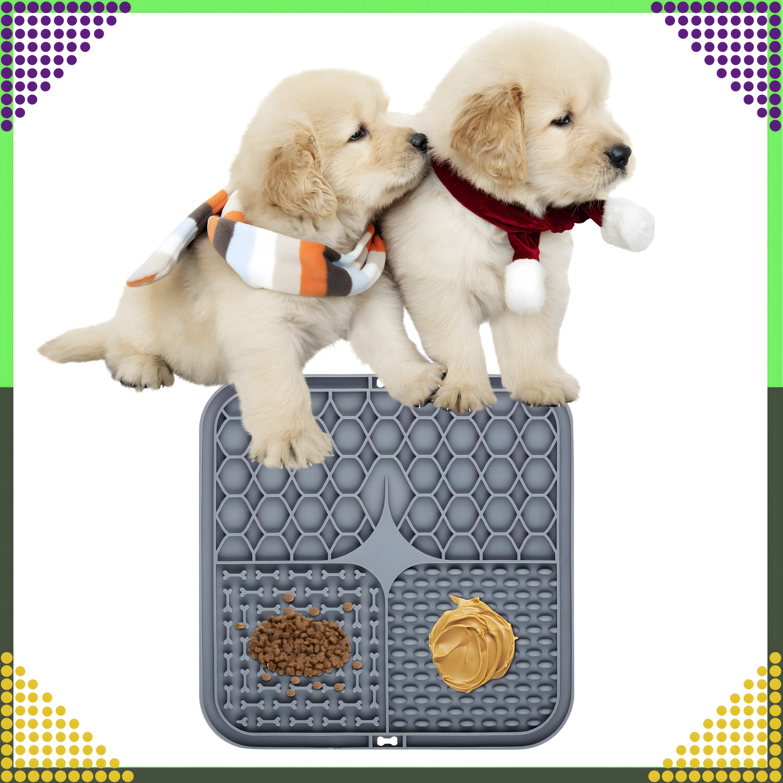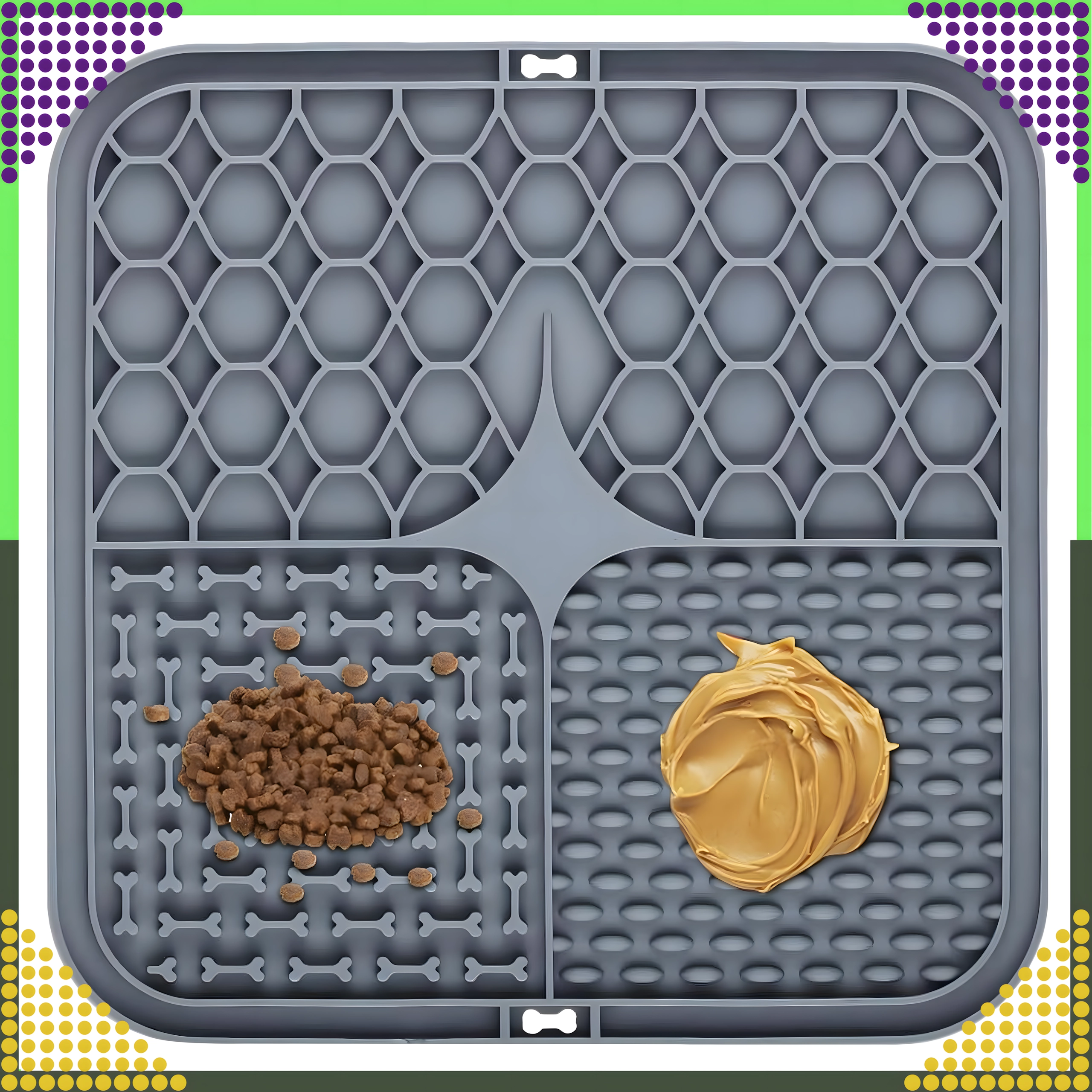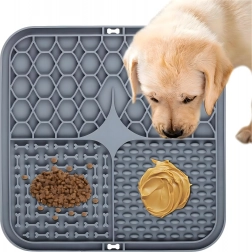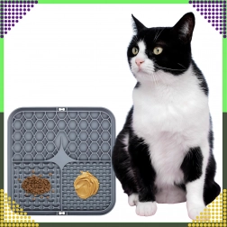 Partea din spate cu ventuze antiderapante menține covorașul ferm pe podea sau pe o suprafață verticală (de ex. în baie, în timpul băii). Covorașul este din silicon moale, ușor de spălat și este ideal pentru încetinirea hrănirii, dar și ca distragere în timpul îngrijirii blănii sau la vizita la veterinar.