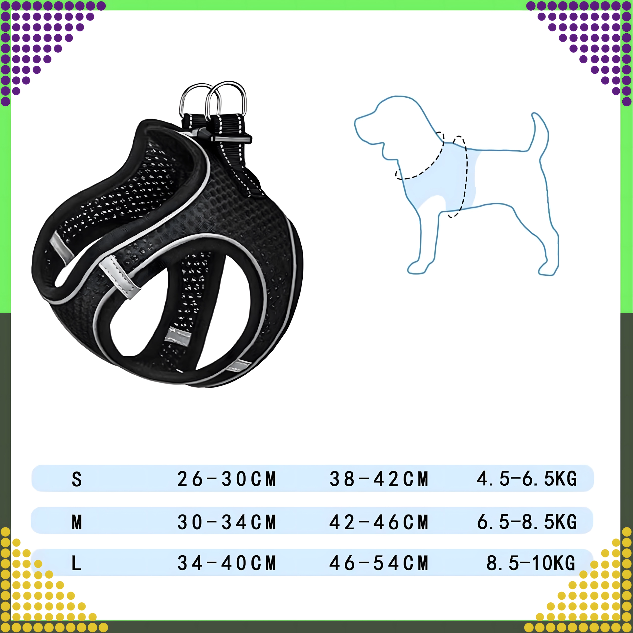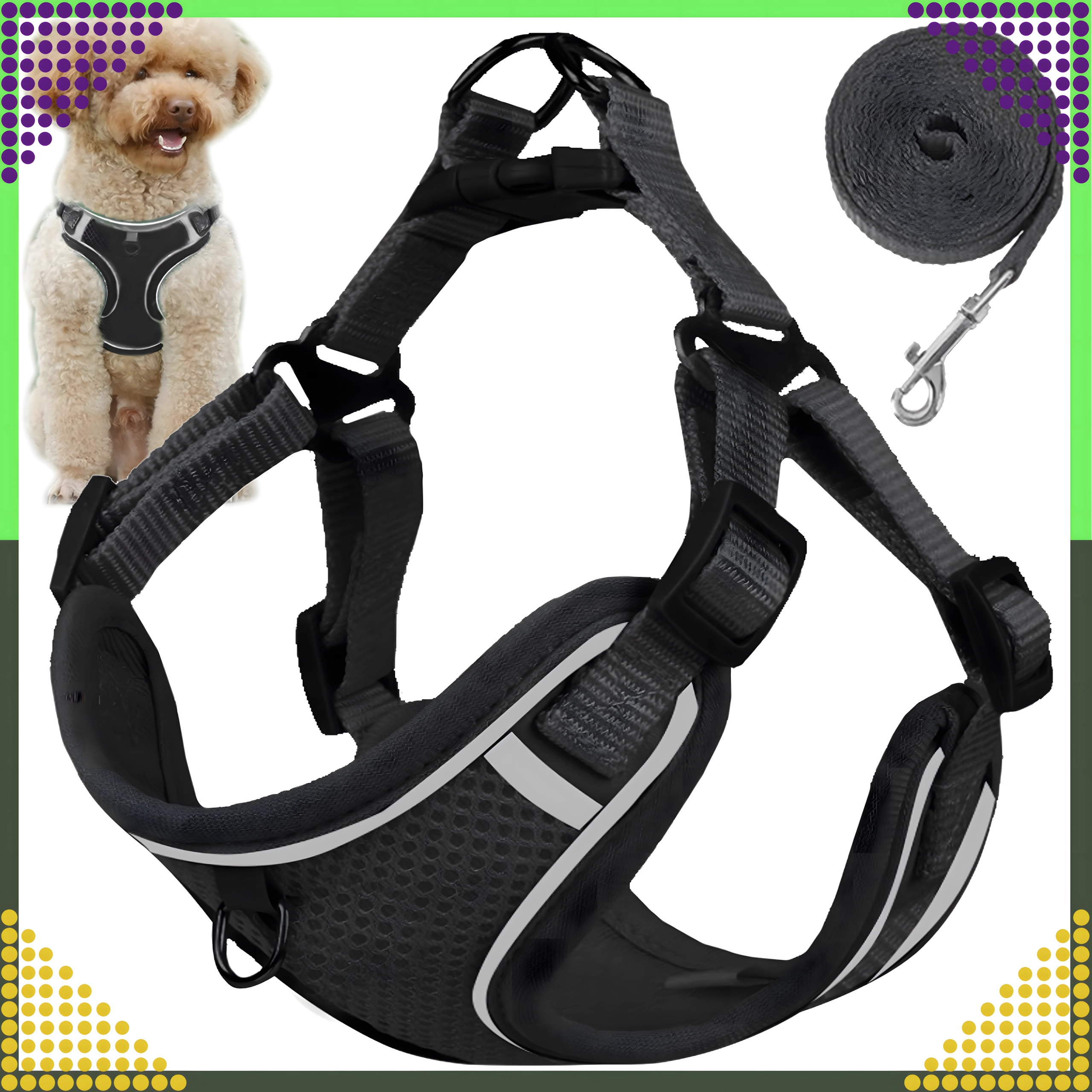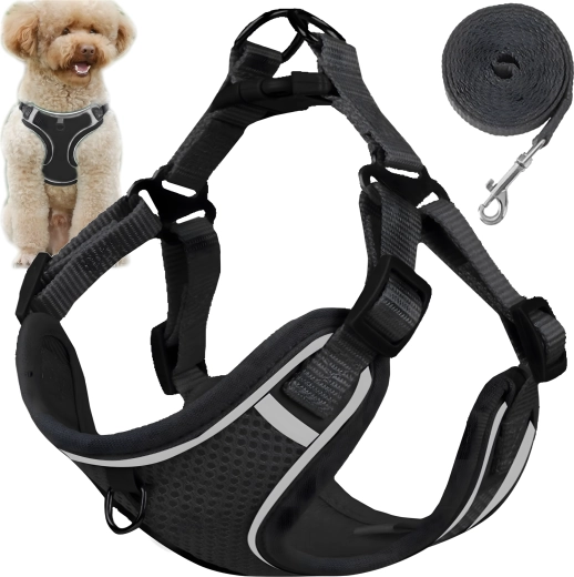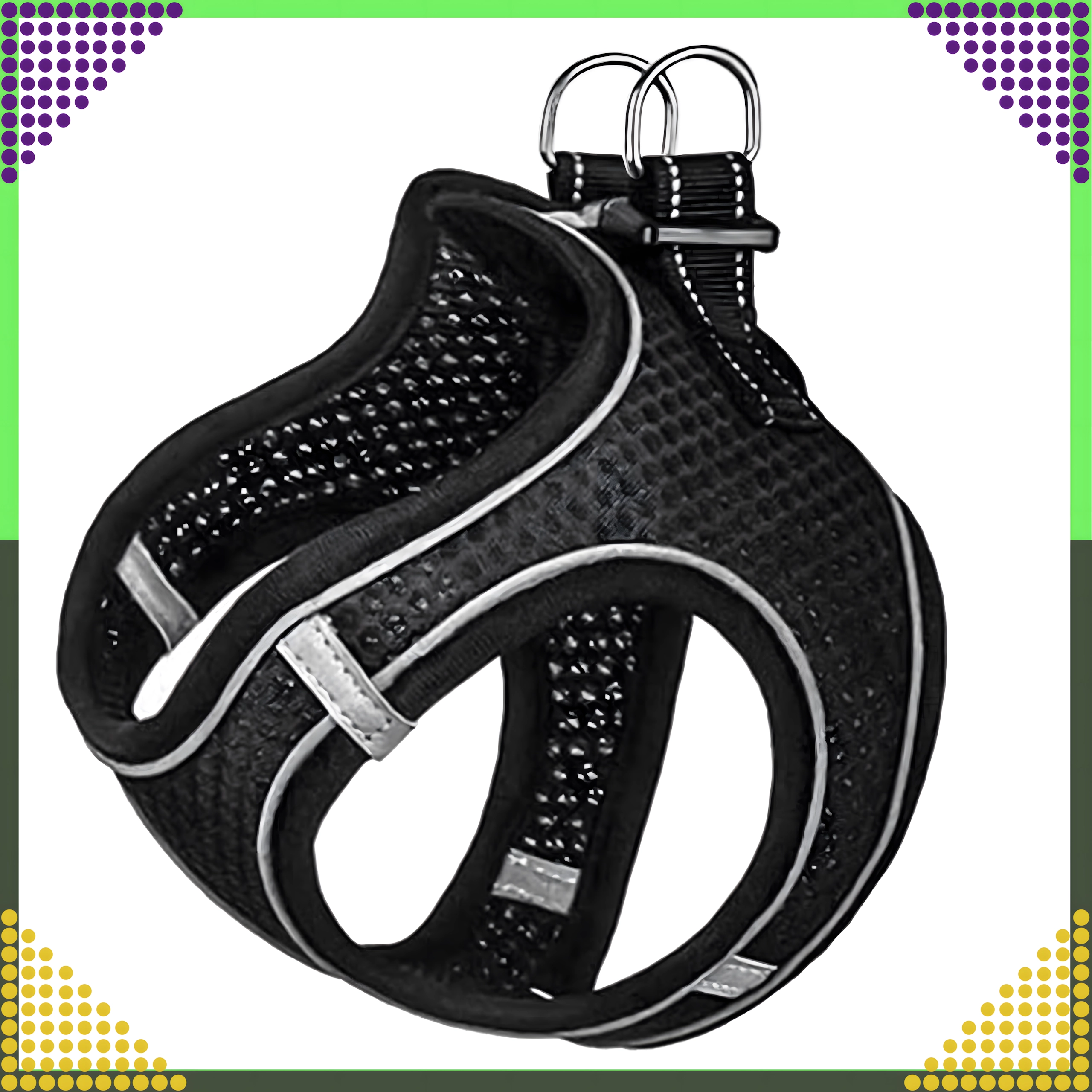 Datorită croielii ergonomice, bretelelor reglabile și închiderii pe spate, hamul se potrivește sigur și confortabil. Inelele D metalice duble oferă o prindere sigură a lesei și control asupra animalului de companie.