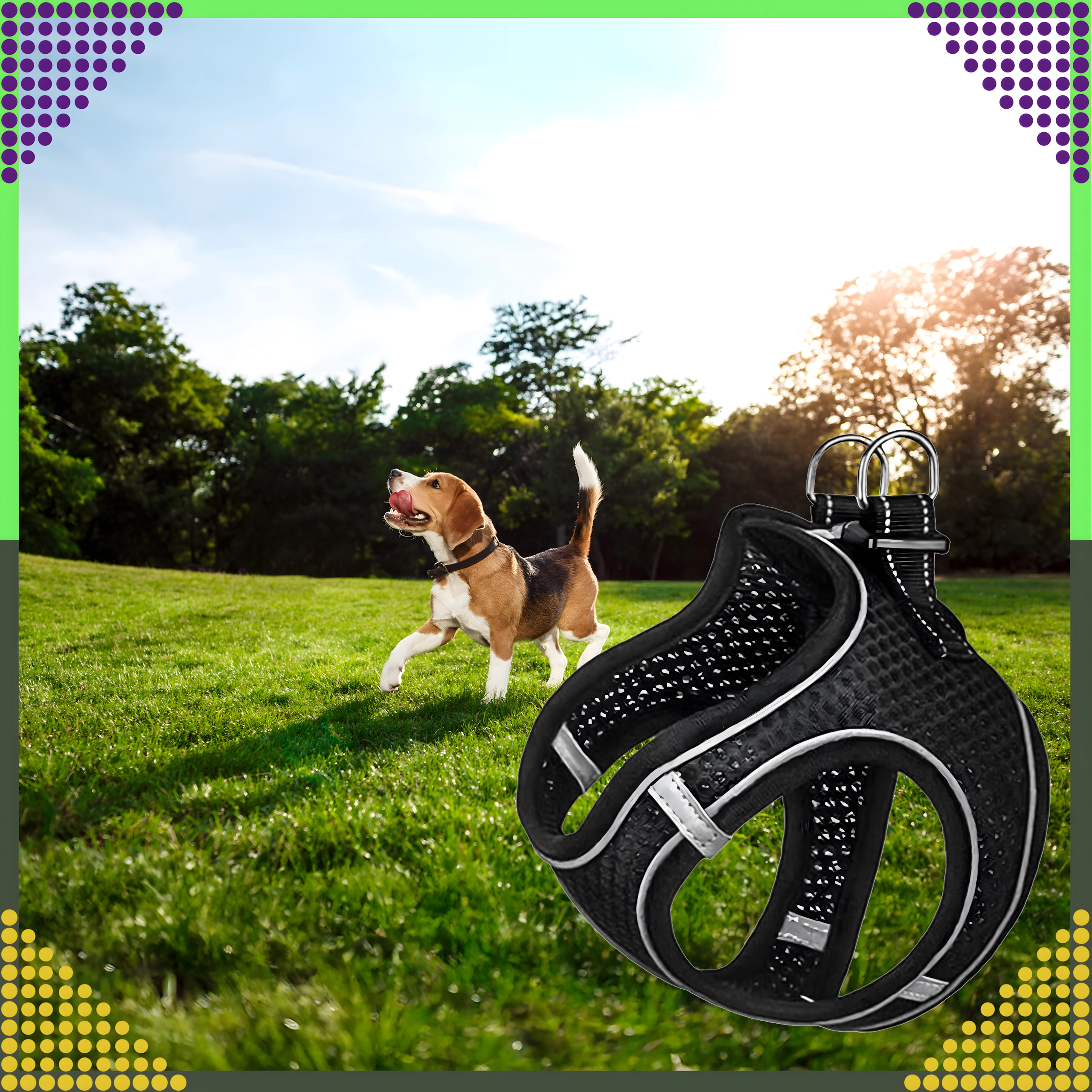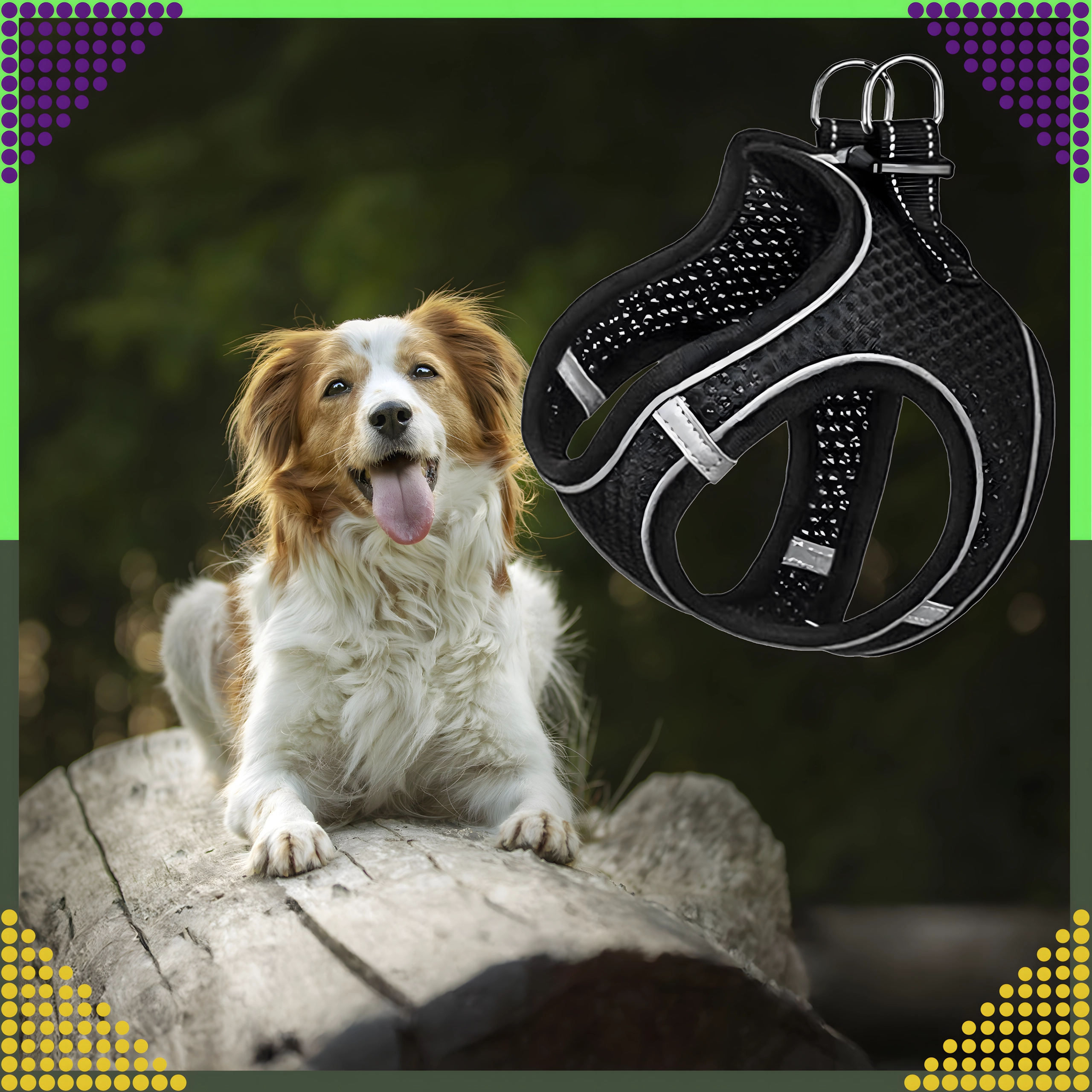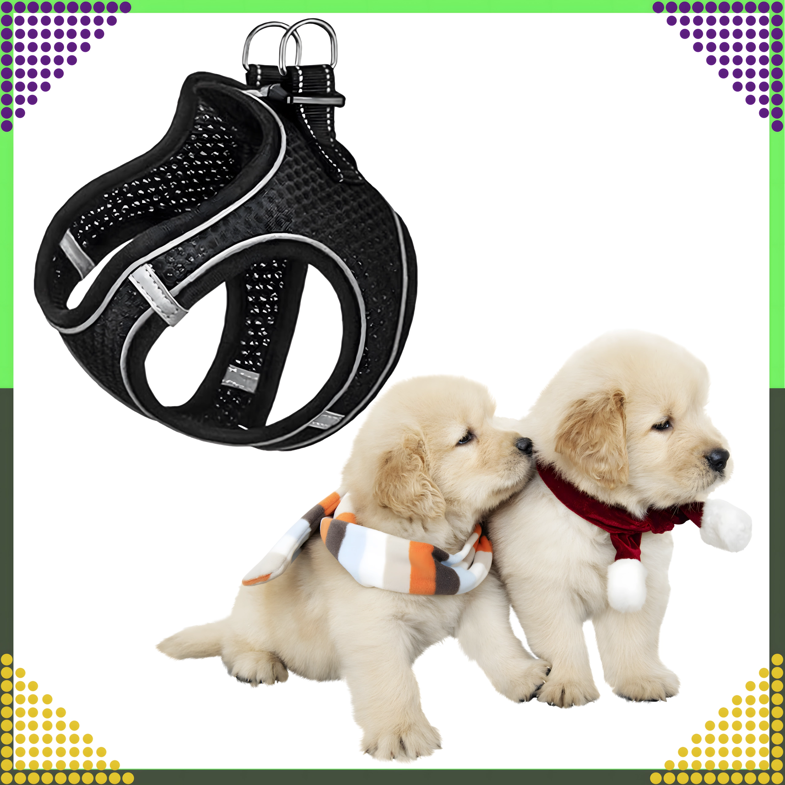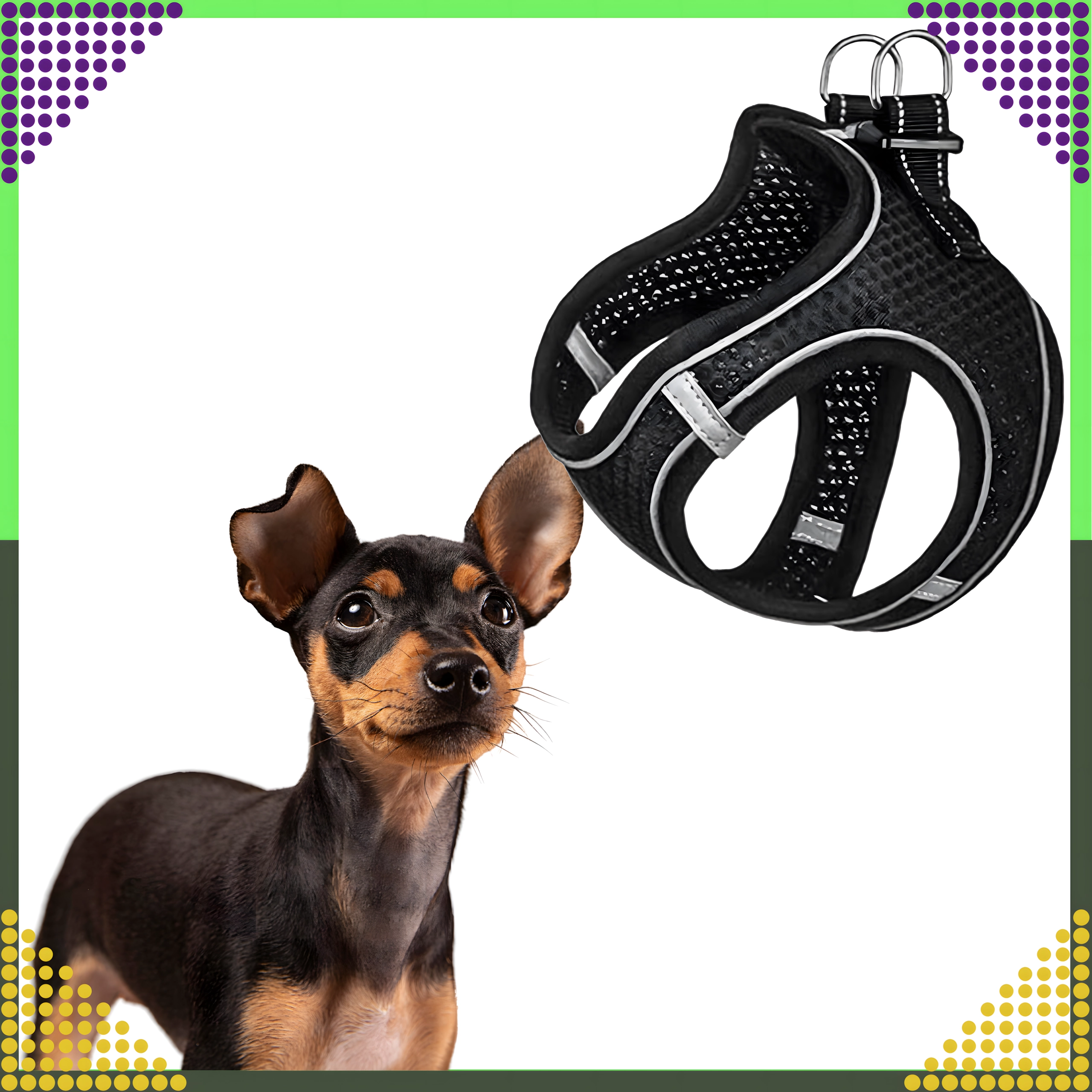 Datorită croielii ergonomice, bretelelor reglabile și închiderii pe spate, hamul se potrivește sigur și confortabil. Inelele D metalice duble oferă o prindere sigură a lesei și control asupra animalului de companie.