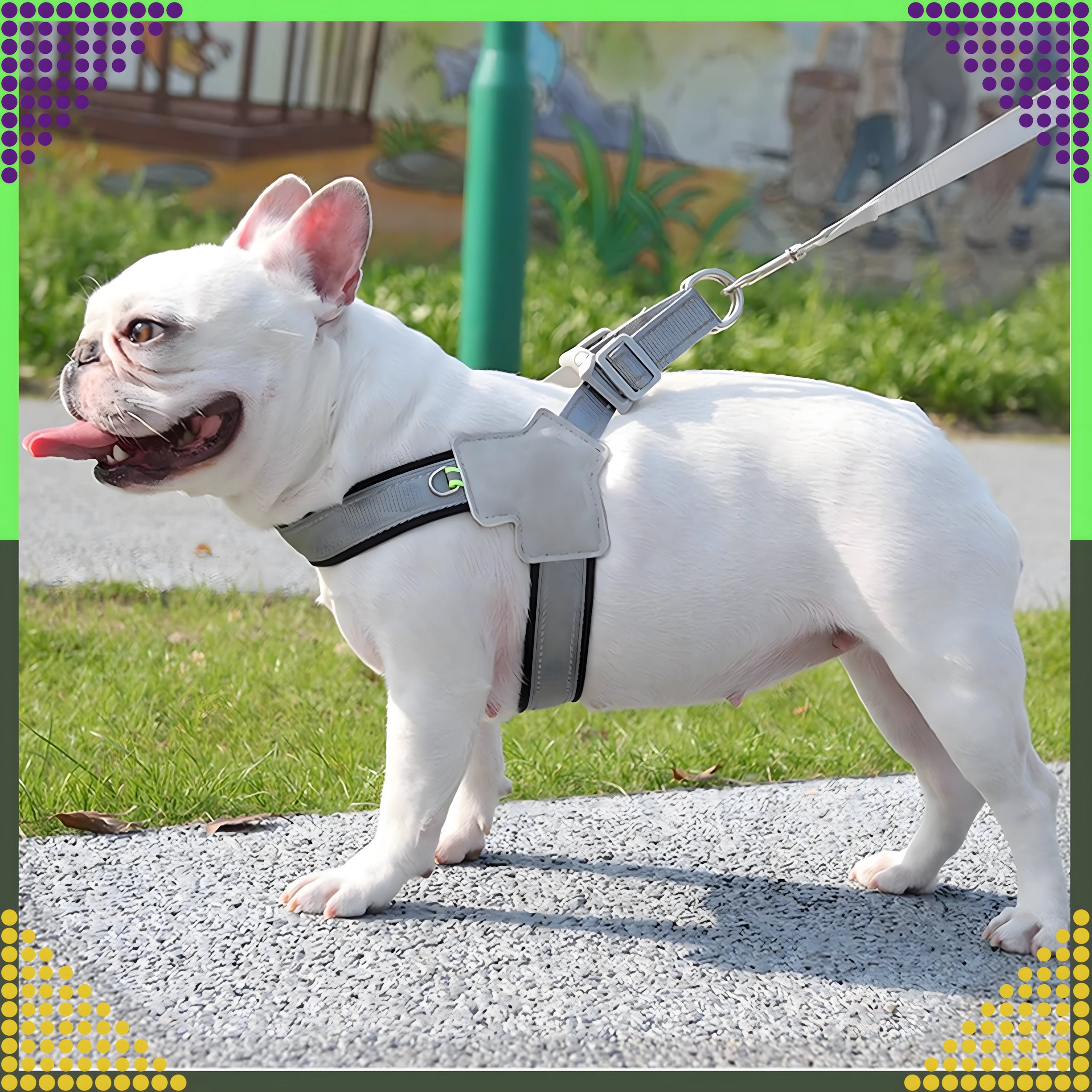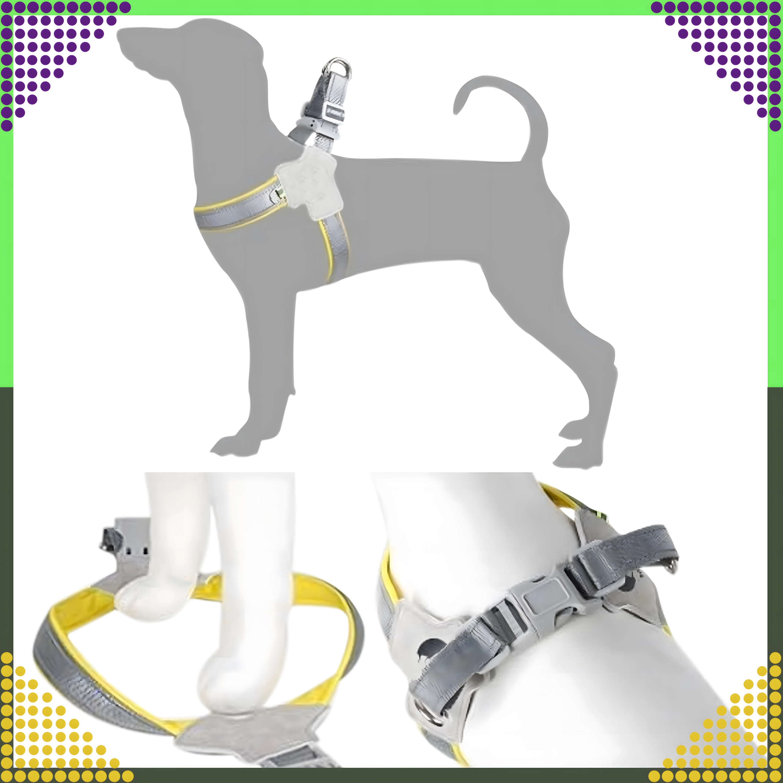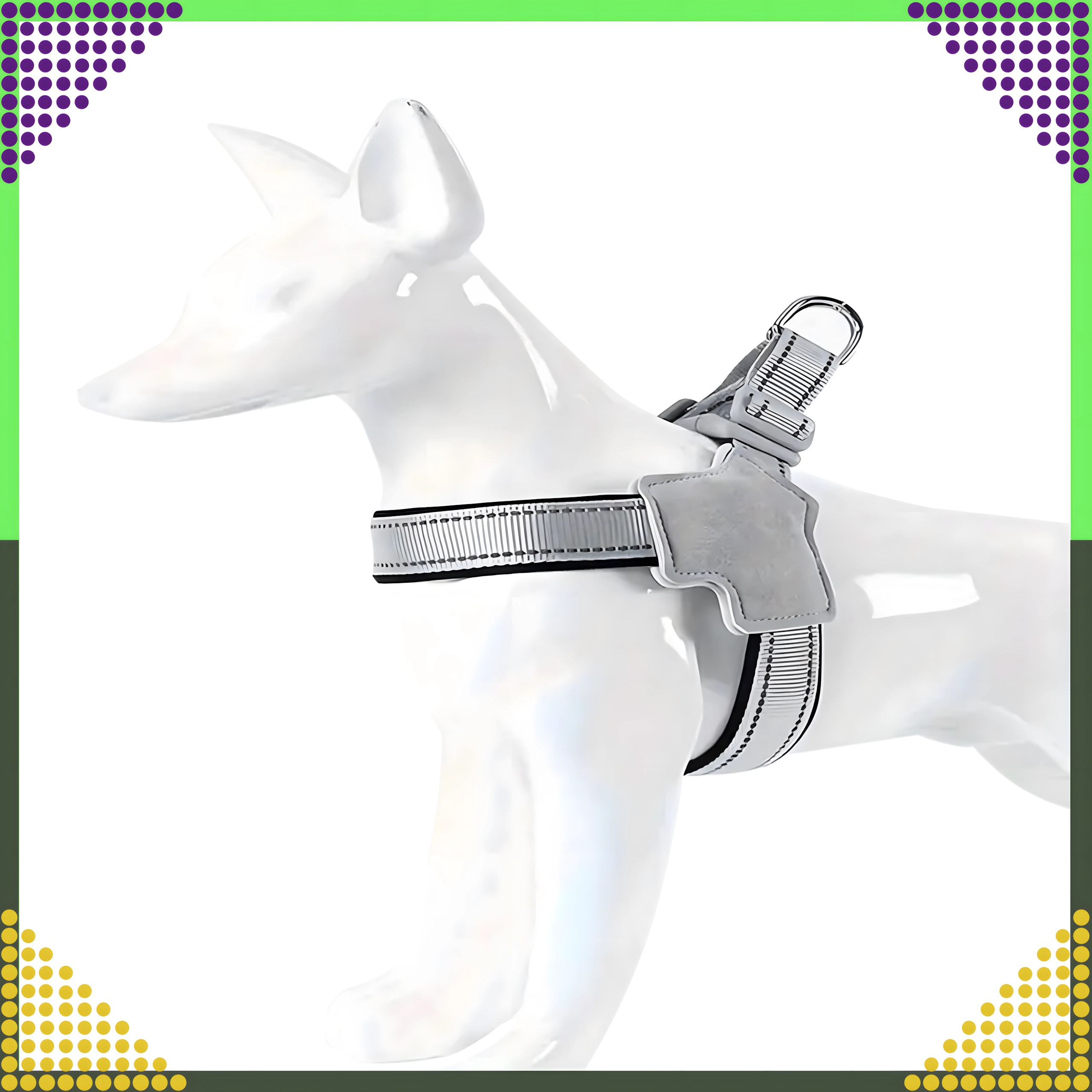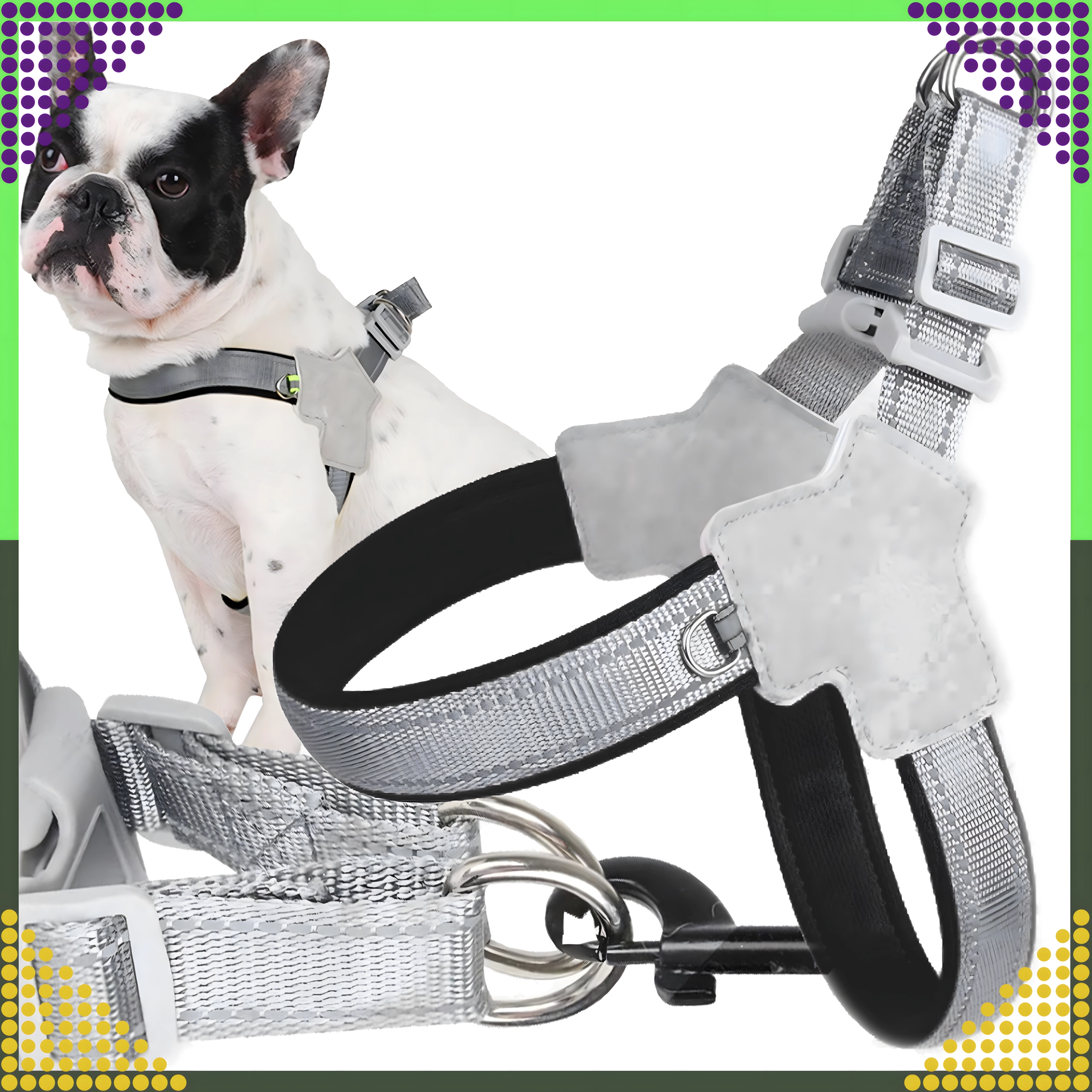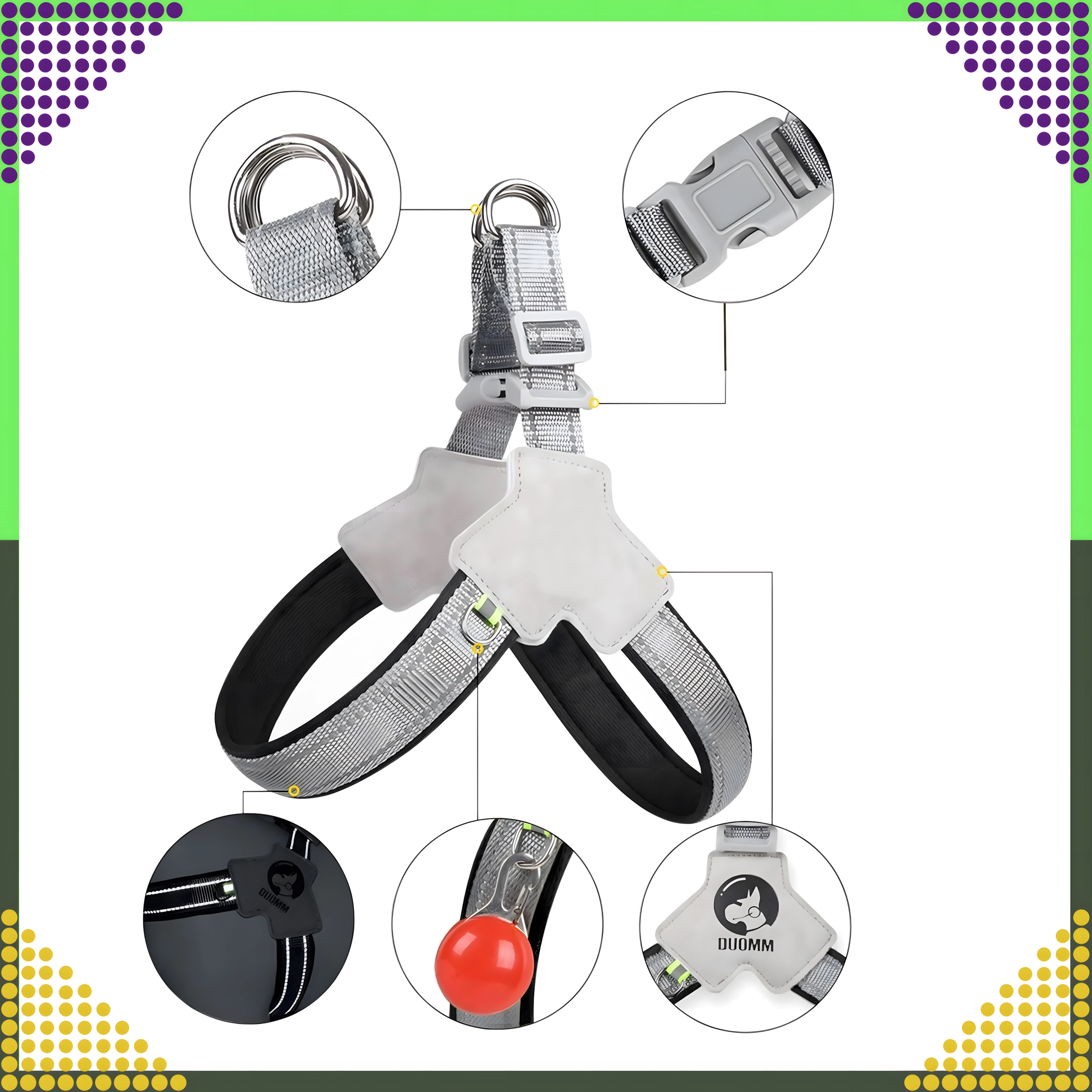 Hamul este fabricat din materiale durabile și rezistente la abraziune, cu căptușeală moale pentru confort pe tot parcursul zilei. Elementele reflectorizante asigură o vizibilitate mai bună după lăsarea serii. Curelele complet reglabile și catarama de siguranță cu blocare dublă mențin totul ferm pe poziție, în timp ce inelele metalice duble în D oferă o prindere sigură a lesei.