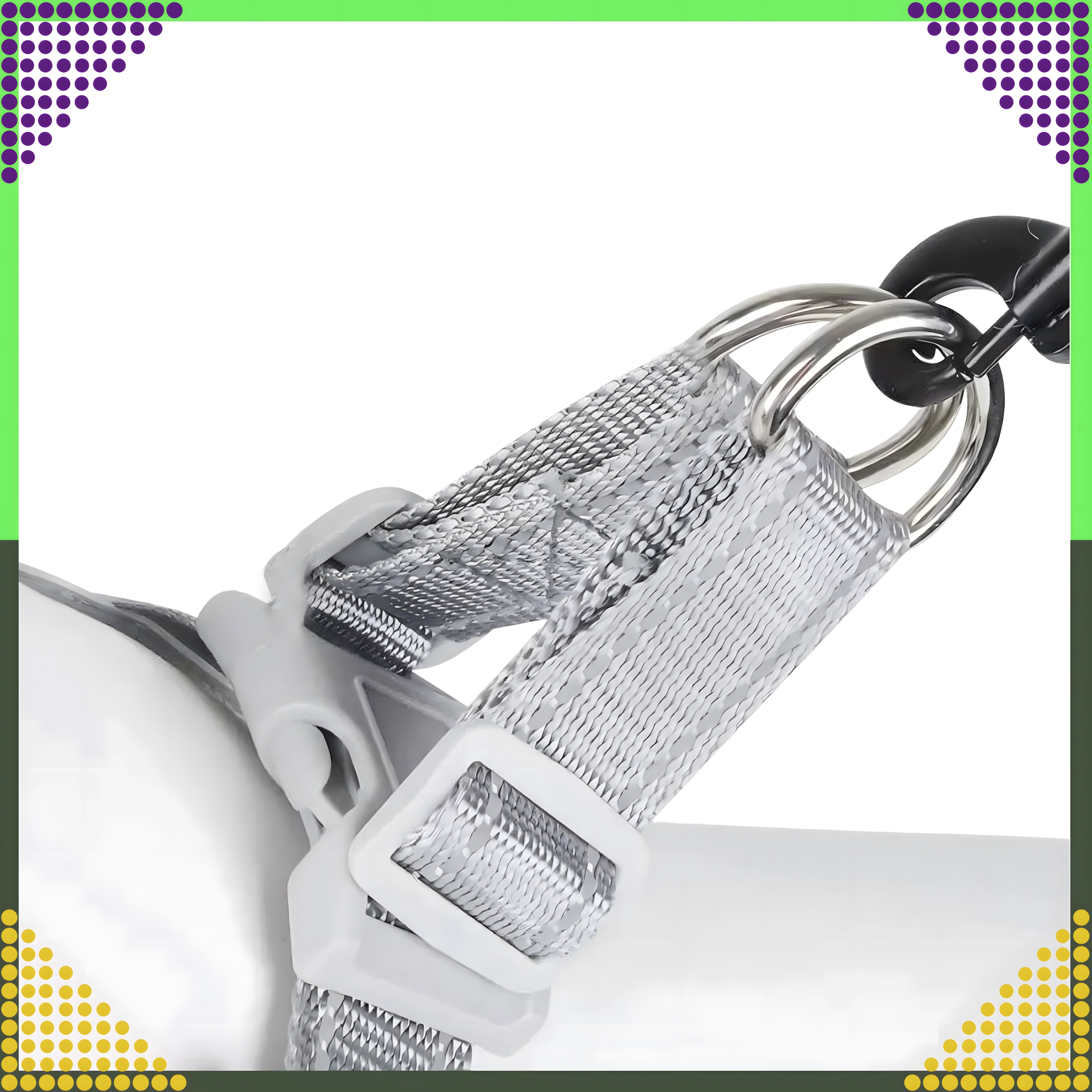 Două inele metalice în D și cusături rezistente oferă o atașare sigură și durabilă a lesei, minimizând riscul de desprindere.