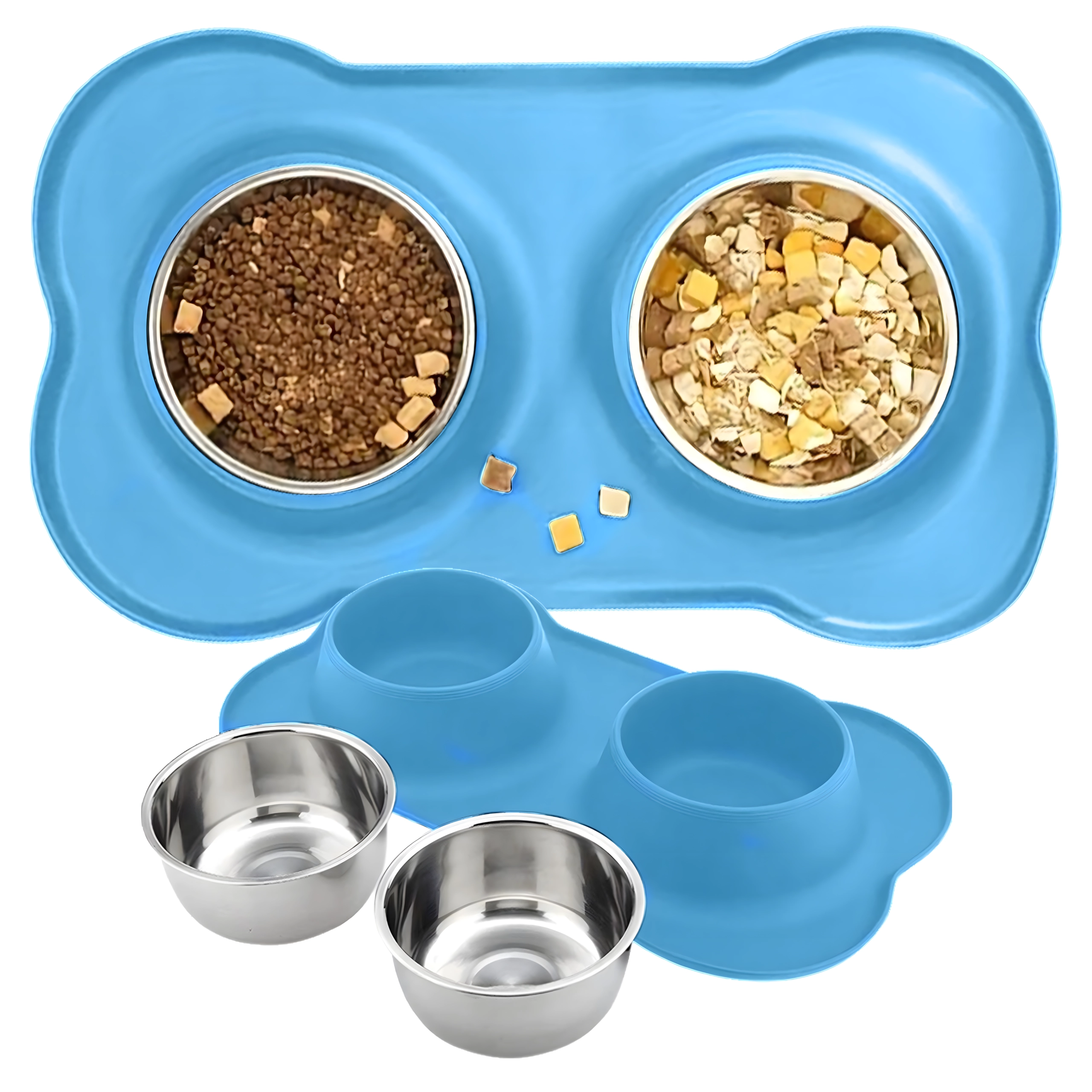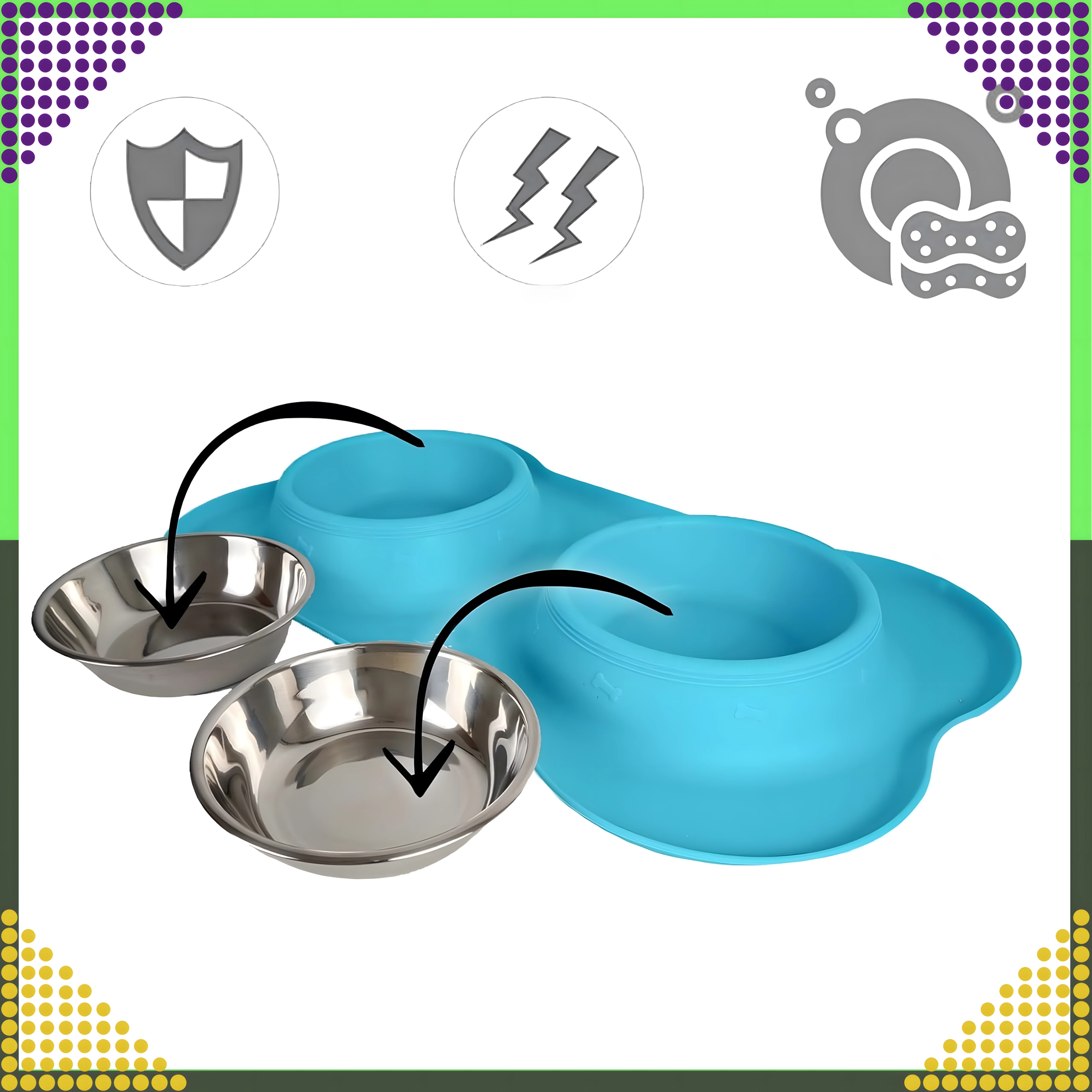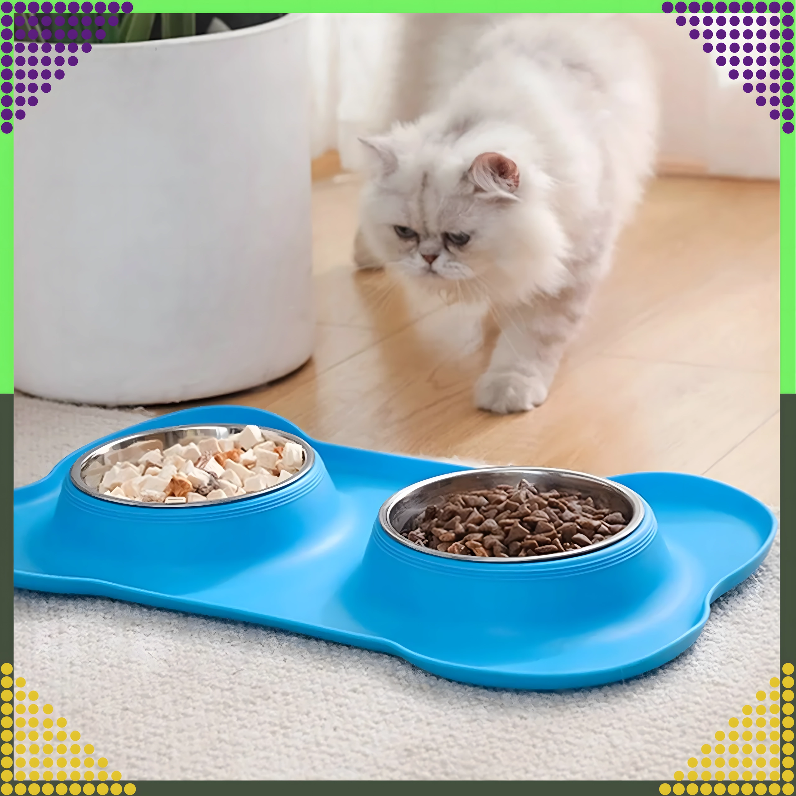 Faceți hrănirea mai curată și mai comodă. Bolul dublu cu covorașul solid din silicon păstrează totul la loc, prinde granulele vărsate și picăturile de apă, iar datorită inserțiilor din inox se spală ușor – chiar și în mașina de spălat vase.