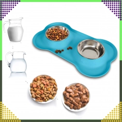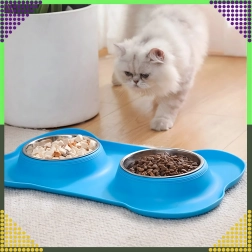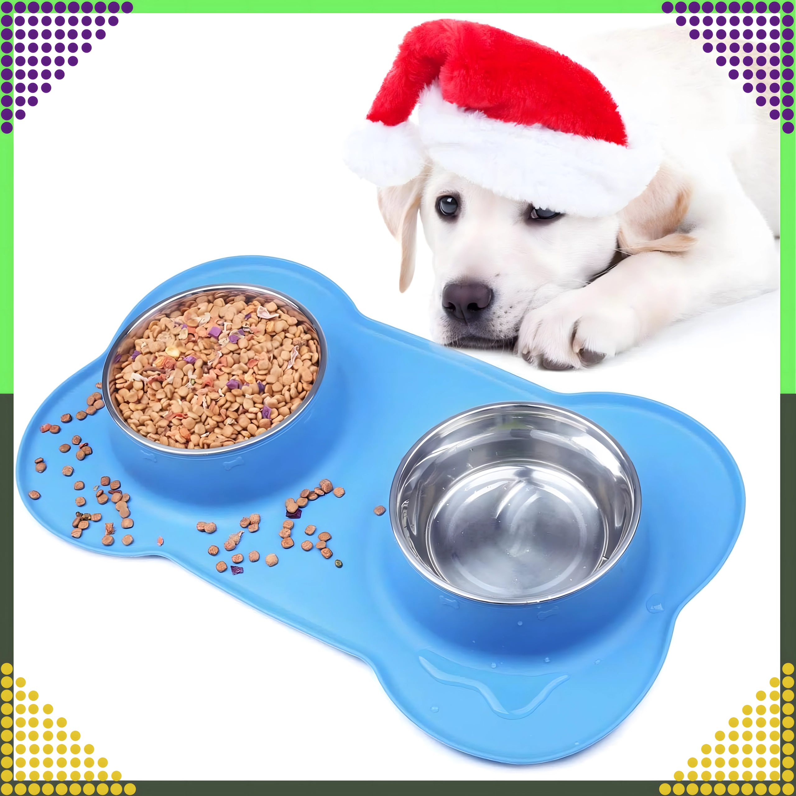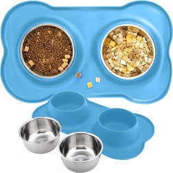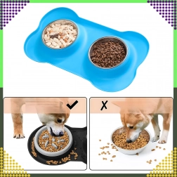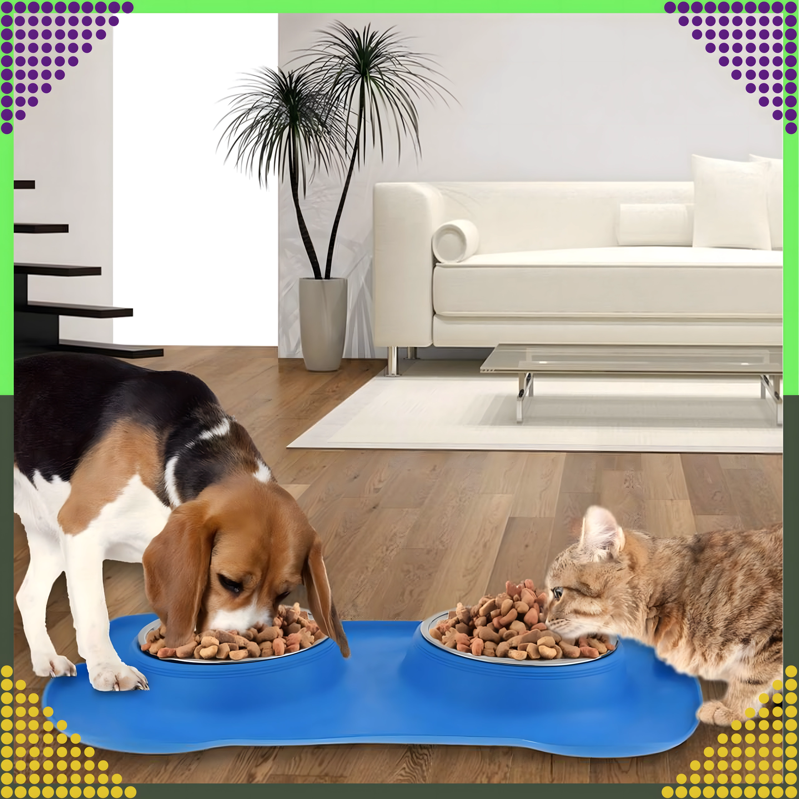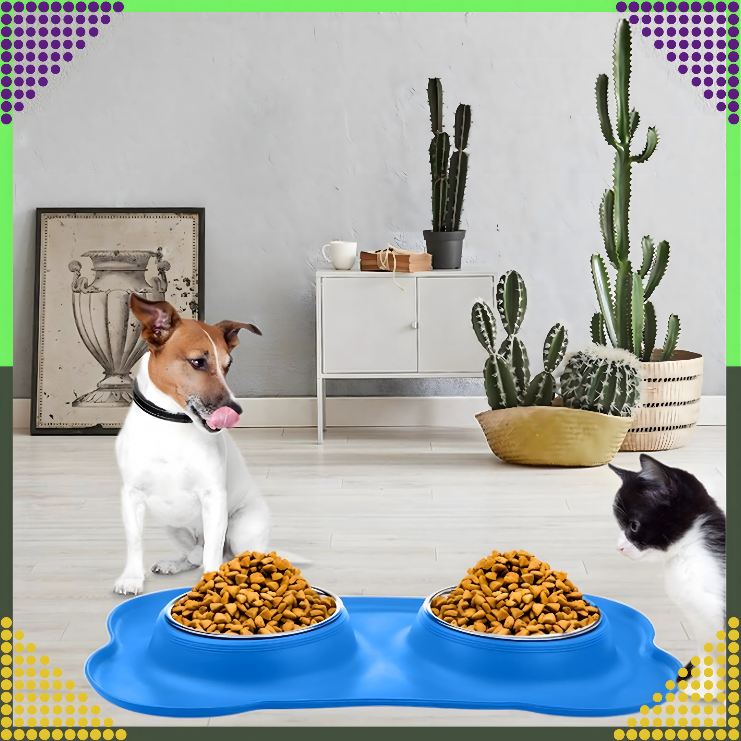 Faceți hrănirea mai curată și mai comodă. Bolul dublu cu covorașul solid din silicon păstrează totul la loc, prinde granulele vărsate și picăturile de apă, iar datorită inserțiilor din inox se spală ușor – chiar și în mașina de spălat vase.