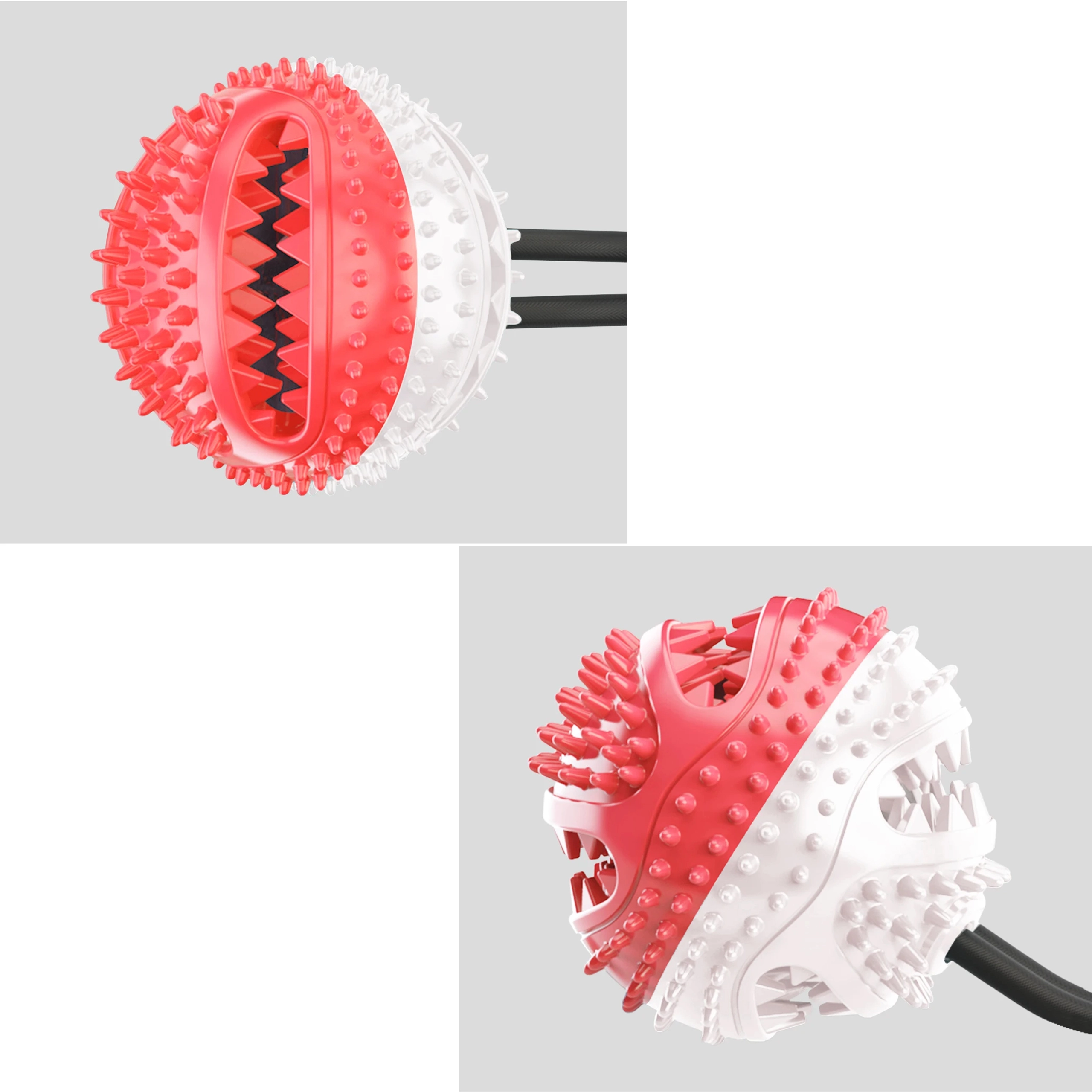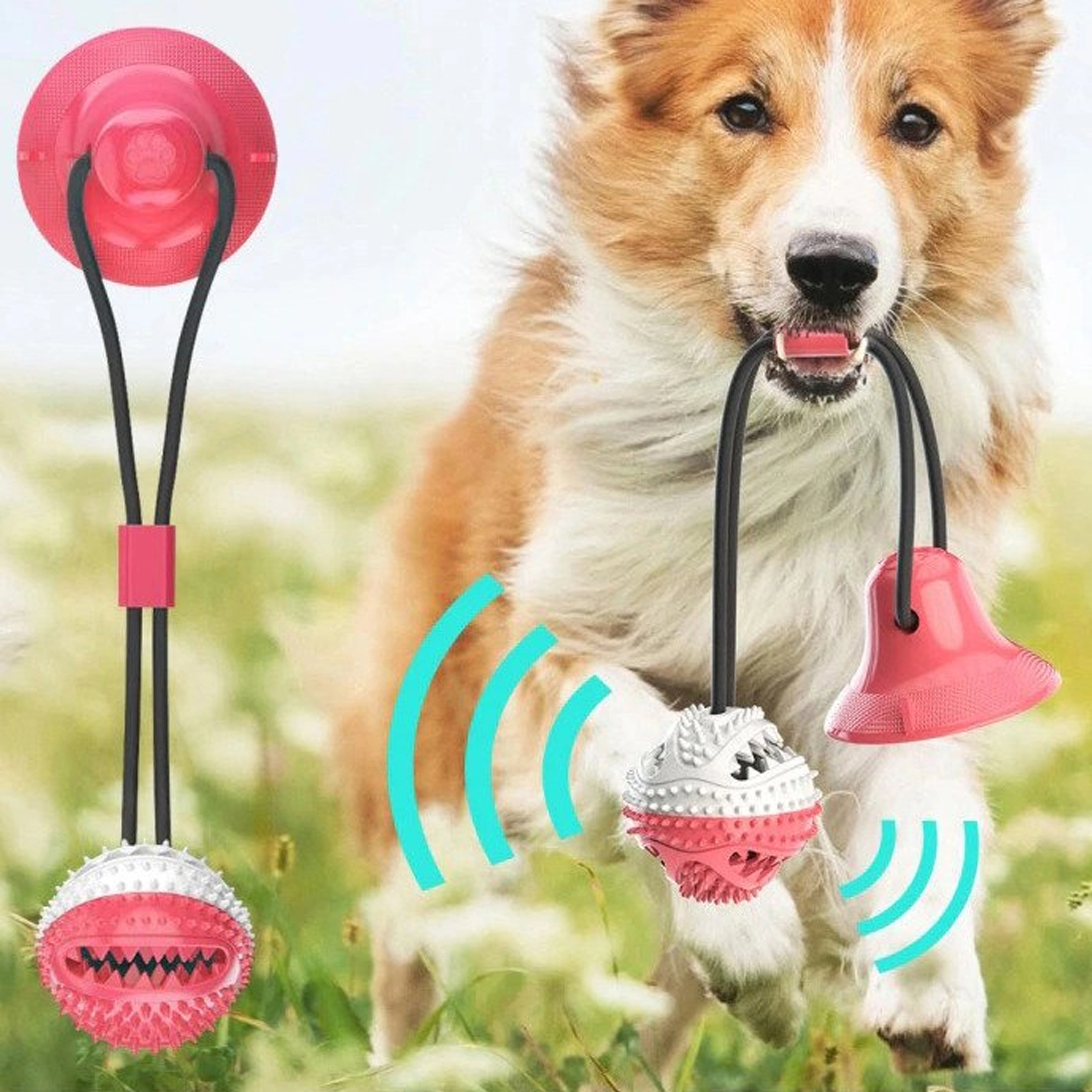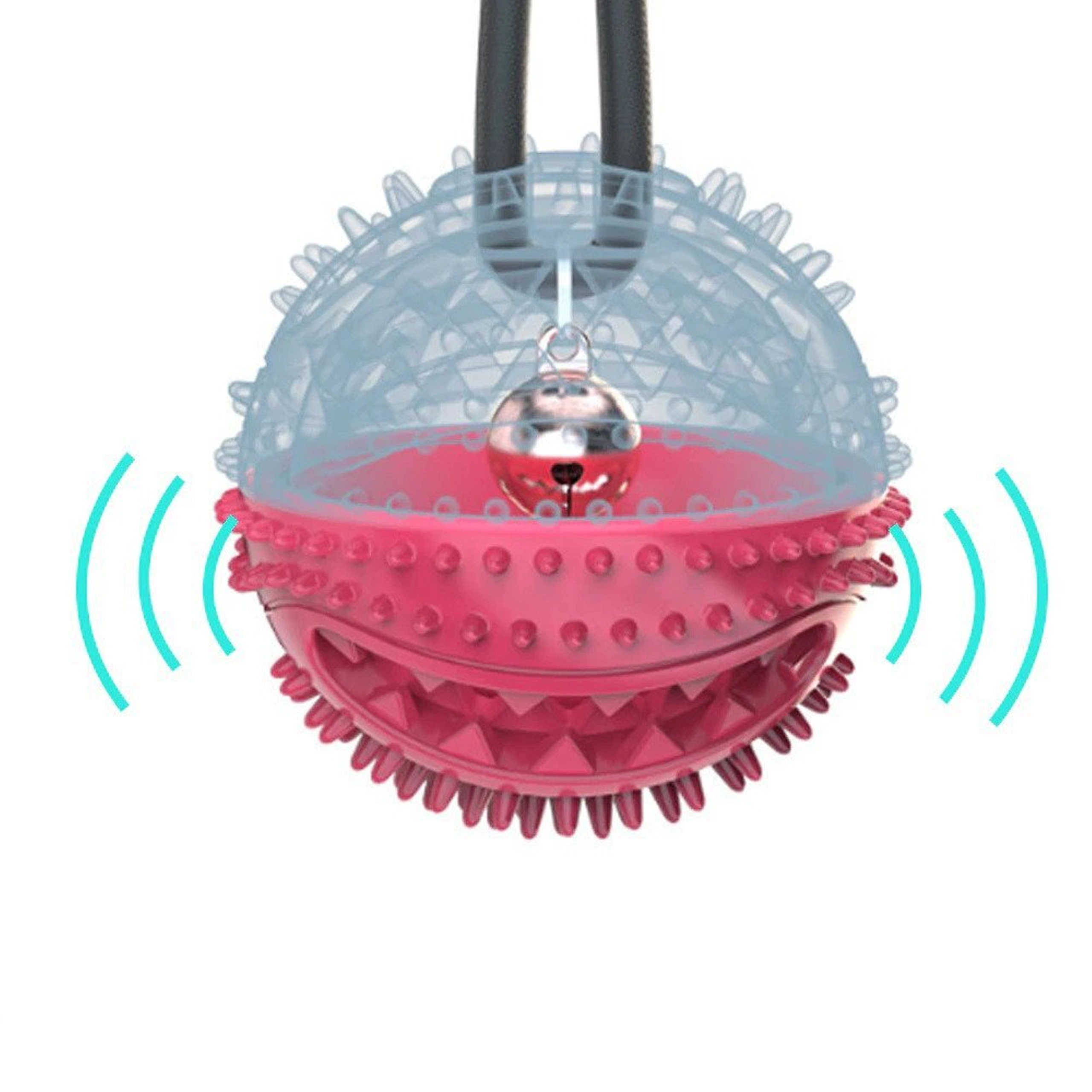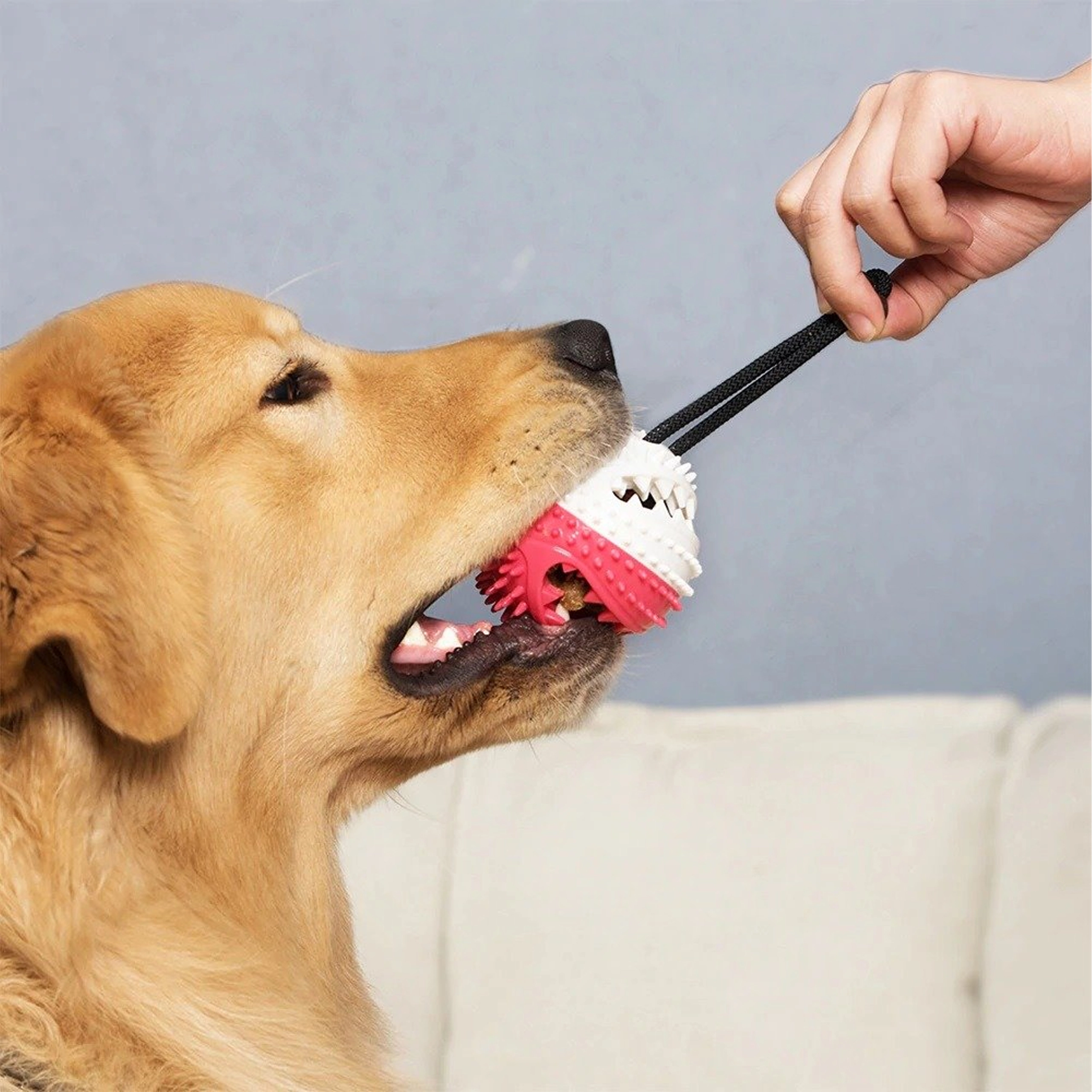 Mingiuța interactivă cu ventuză îți distrează câinele prin tras, ros și „vânarea” recompenselor. Datorită corzii rezistente și ventuzei puternice, jucăria se poate fixa pe suprafețe netede, astfel încât câinele să poată trage în siguranță și să încerce să elibereze mingiuța. Proeminențele din cauciuc texturat, în timpul jocului, curăță mecanic dinții și masează delicat gingiile, susținând igiena cavității bucale.