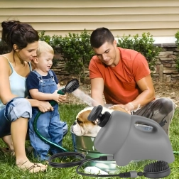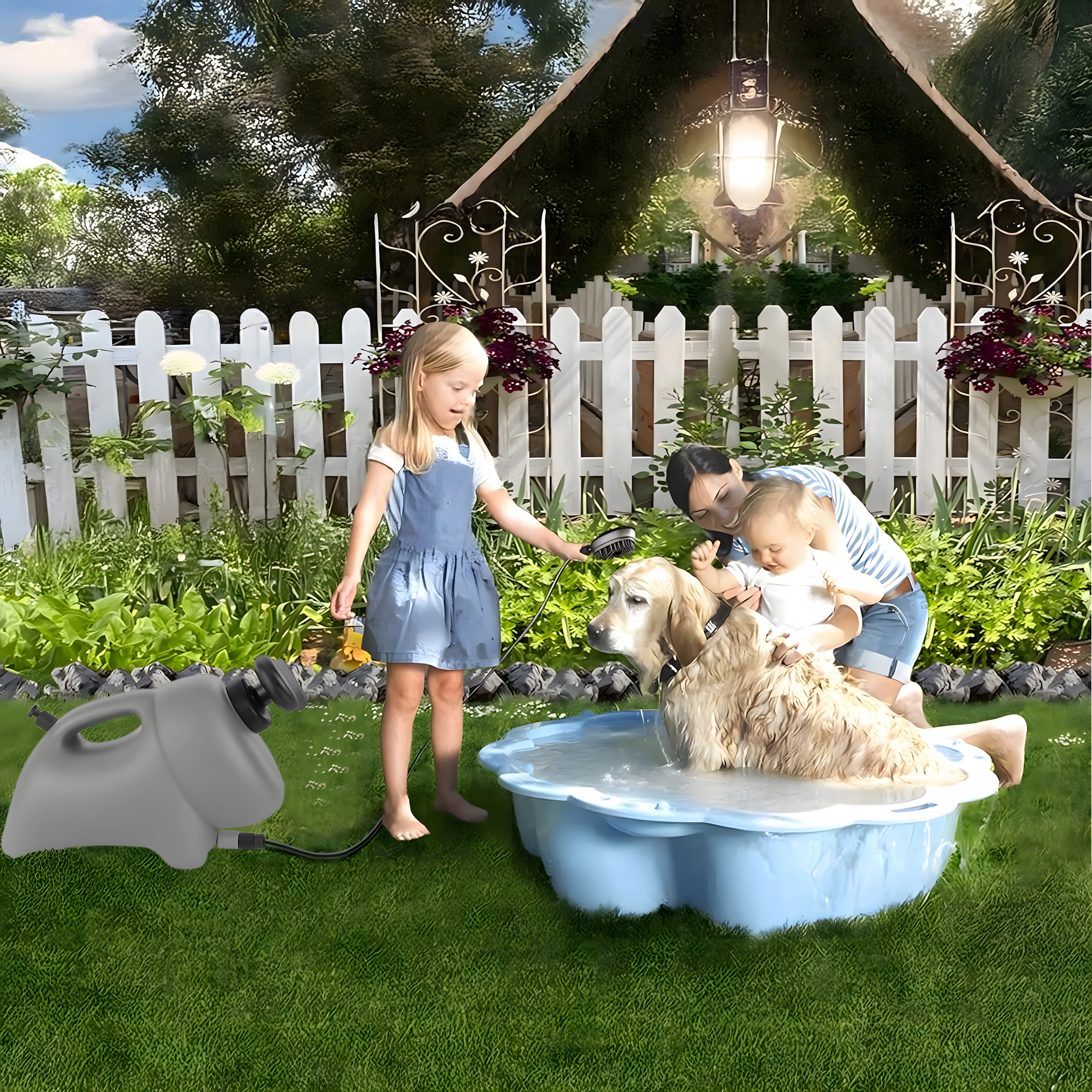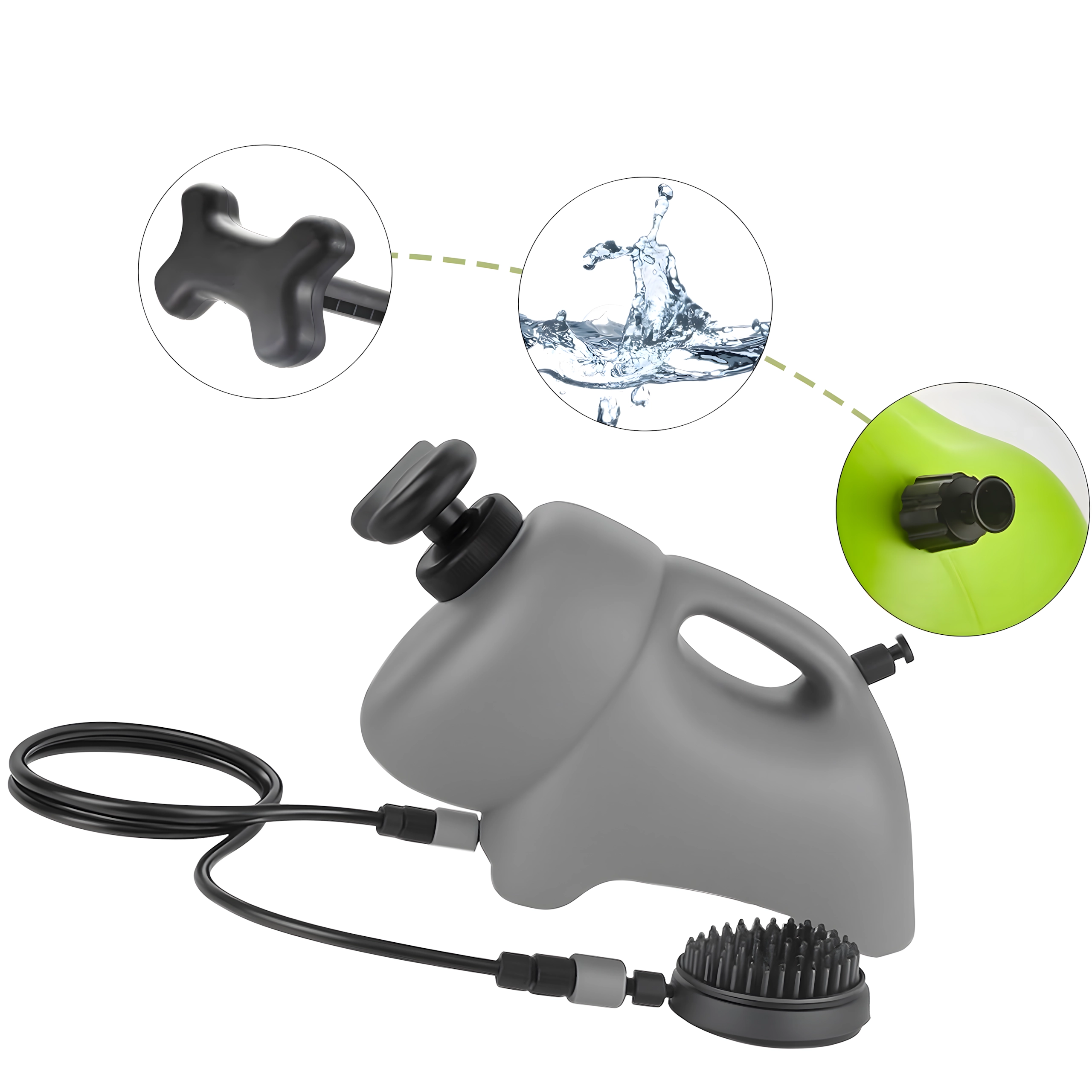 Mașină de spălat portabilă practică și silențioasă, cu volum de 8 l, pentru îmbăierea ușoară a câinilor și pisicilor acasă sau în aer liber. Combină duș și perie de masaj 2 în 1, are un furtun lung pentru acces comod și nu necesită alimentare electrică. Rezervorul menține apa caldă până la 2,5 ore, fiind ideal și pentru zilele mai răcoroase.