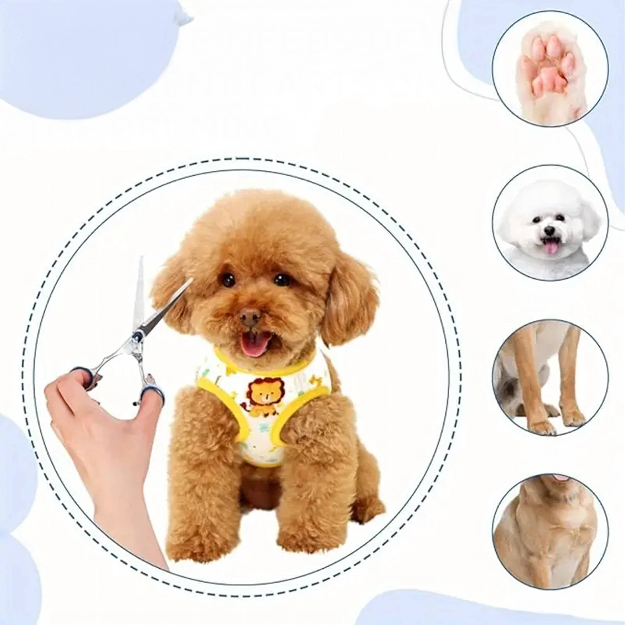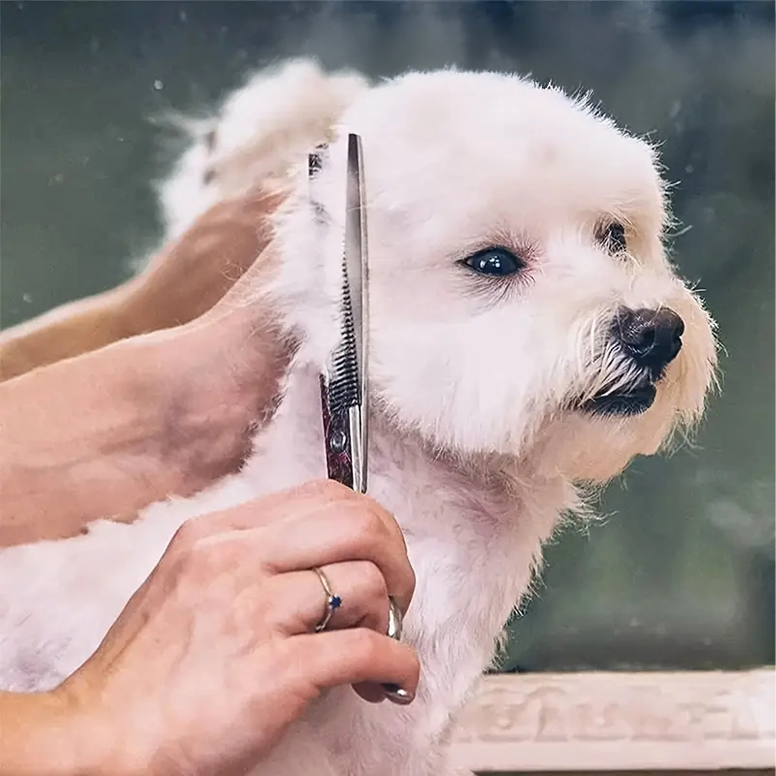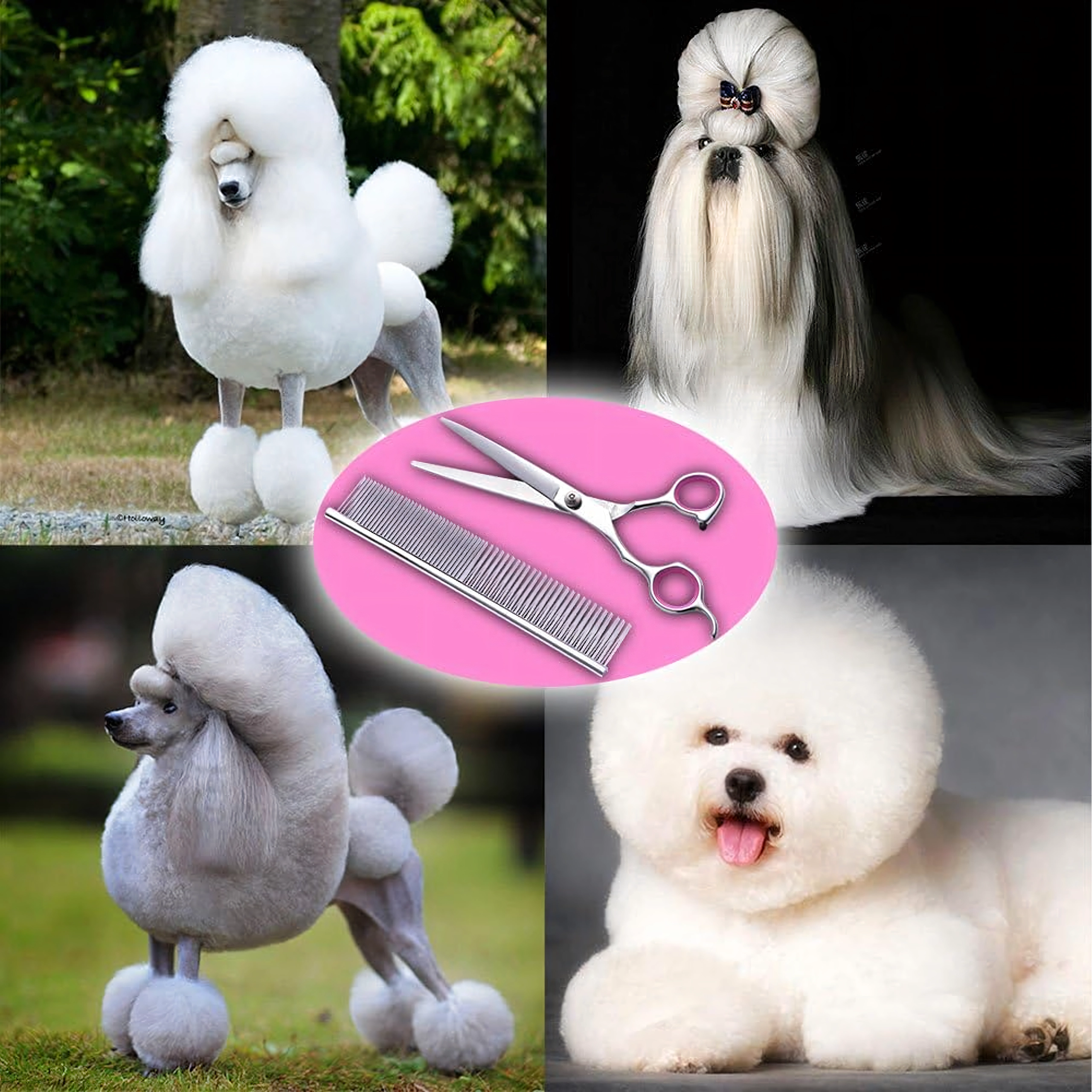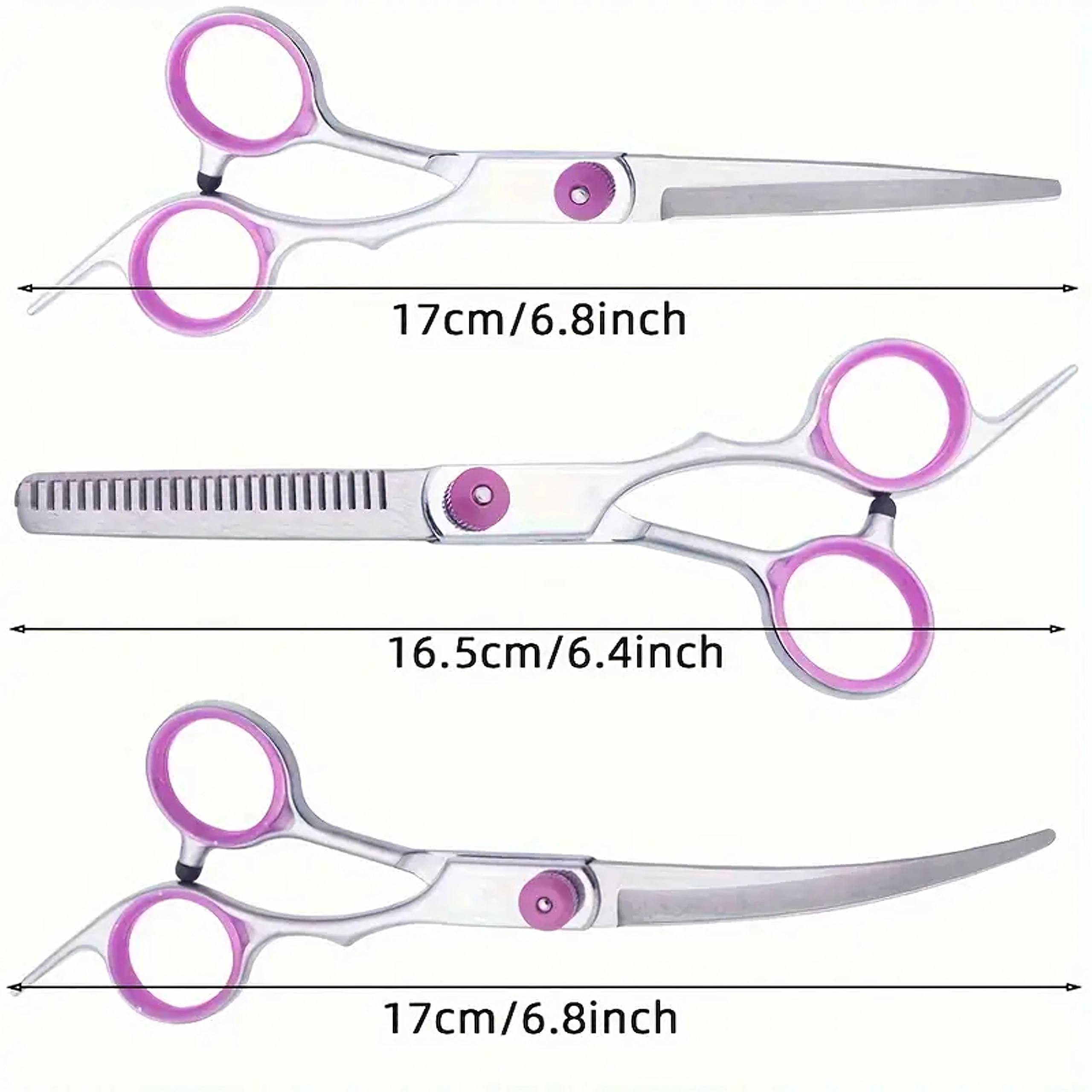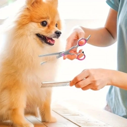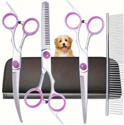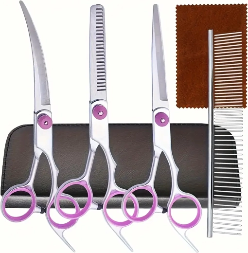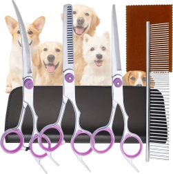 Trei tipuri de foarfece (drepte, curbate, de filat) + pieptene metalic într-o husă de protecție. Tot ce ai nevoie pentru tuns, stilizare și subțierea blănii într-un singur loc.