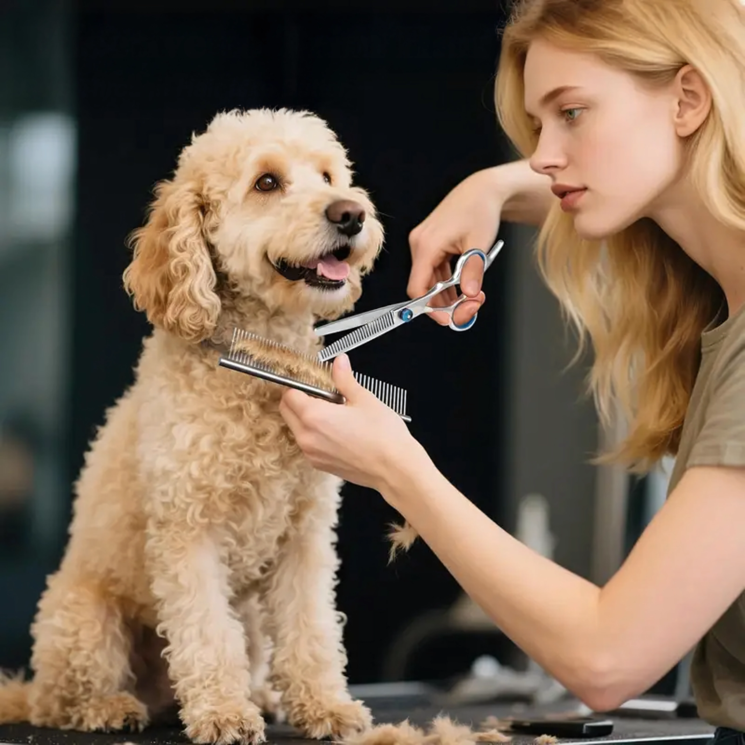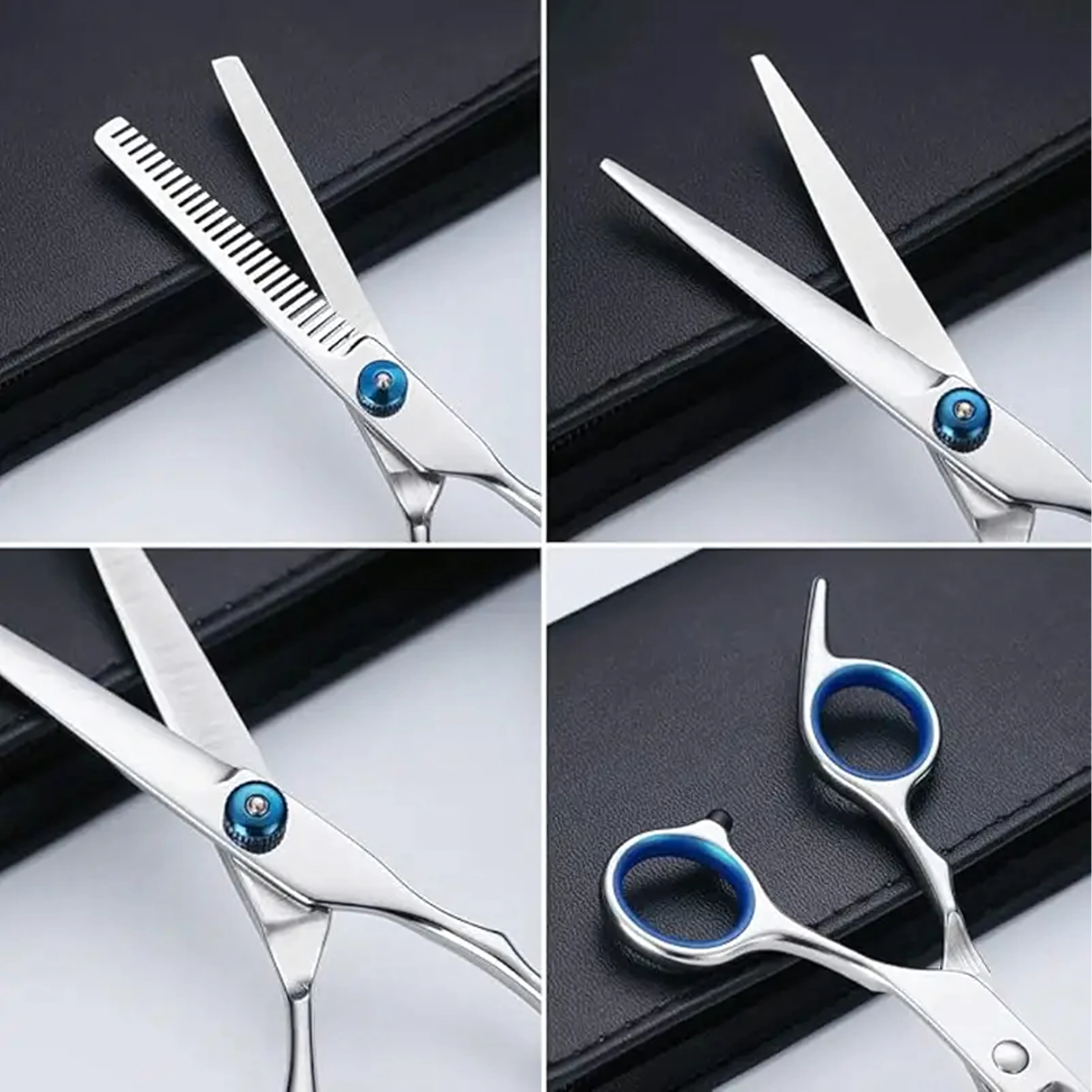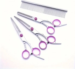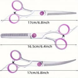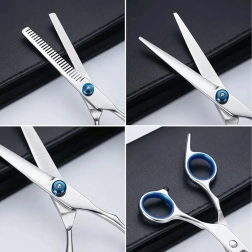 Acest set de grooming universal este conceput pentru modelare precisă, subțiere și finisare a blănii câinilor și pisicilor. Oțelul inoxidabil asigură durabilitate îndelungată, tăiere curată și întreținere facilă. Datorită inelelor ergonomice pentru degete și opritoarelor, lucrul este confortabil chiar și în sesiuni mai lungi.