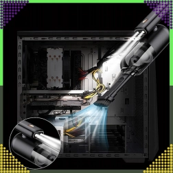 Cu ajutorul accesoriului cu peri și al iluminării LED, îndepărtează praful din tastaturi, carcase PC și fante înguste fără riscul de a deteriora componentele.