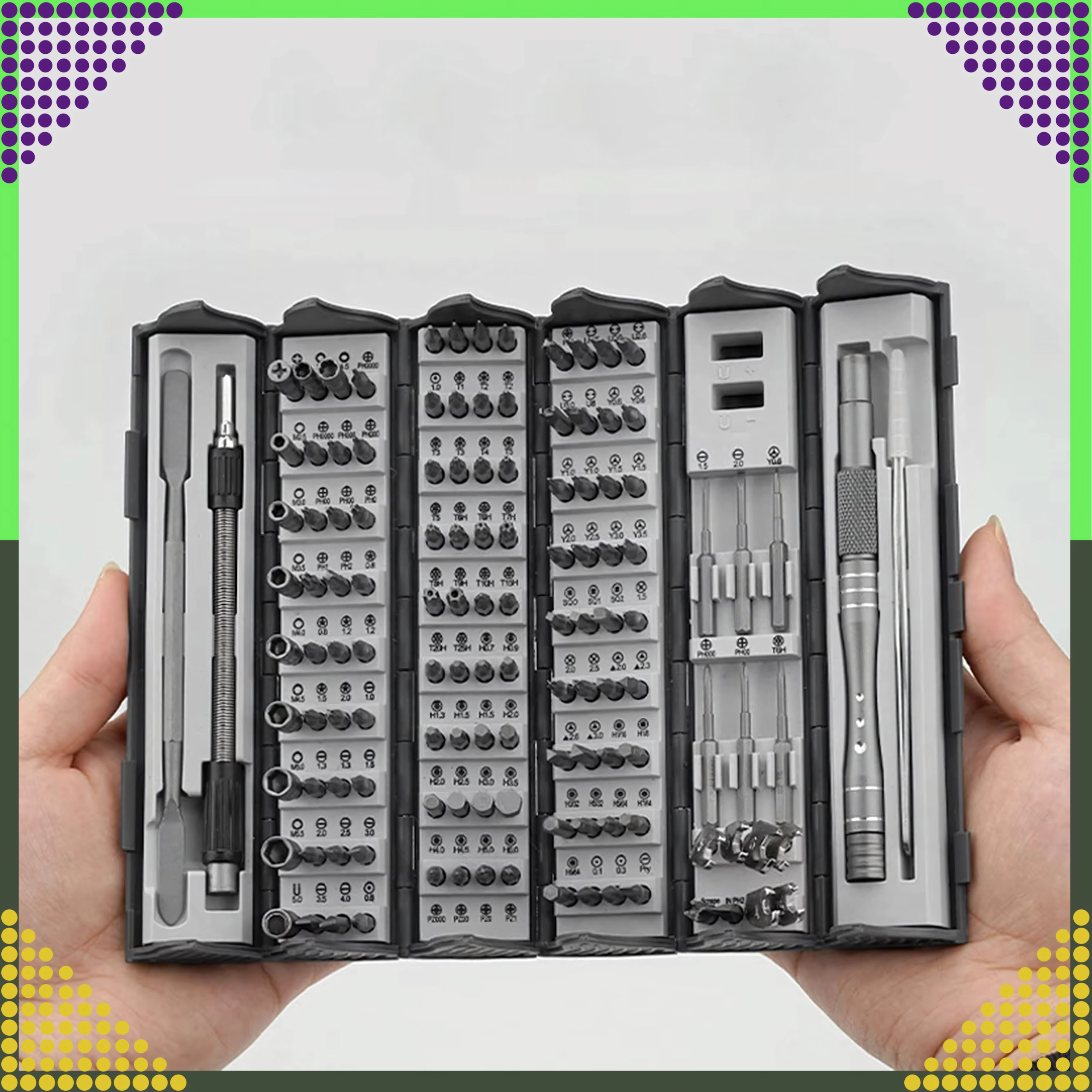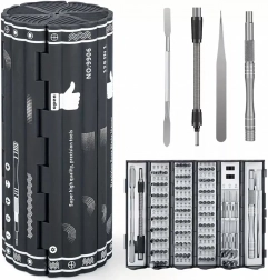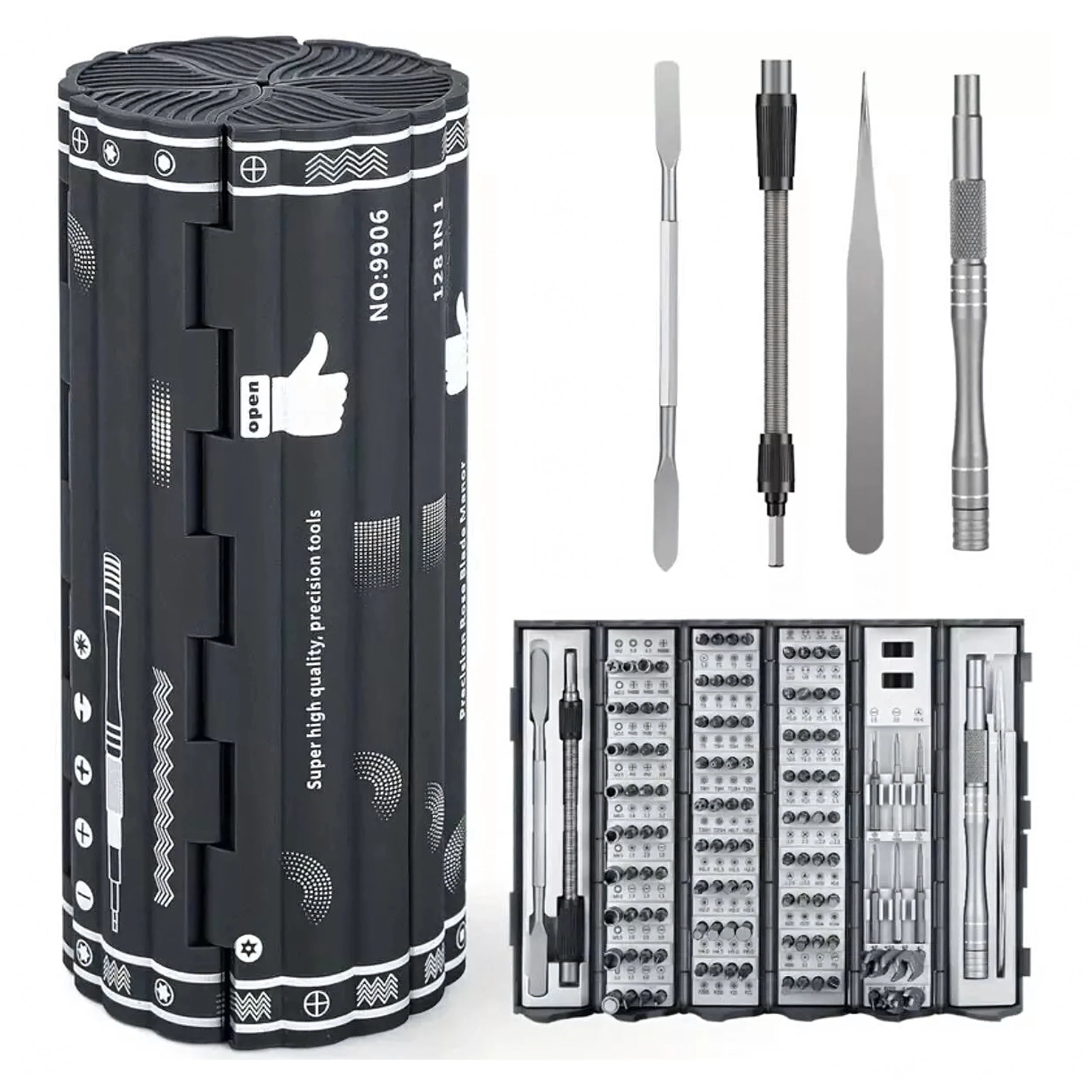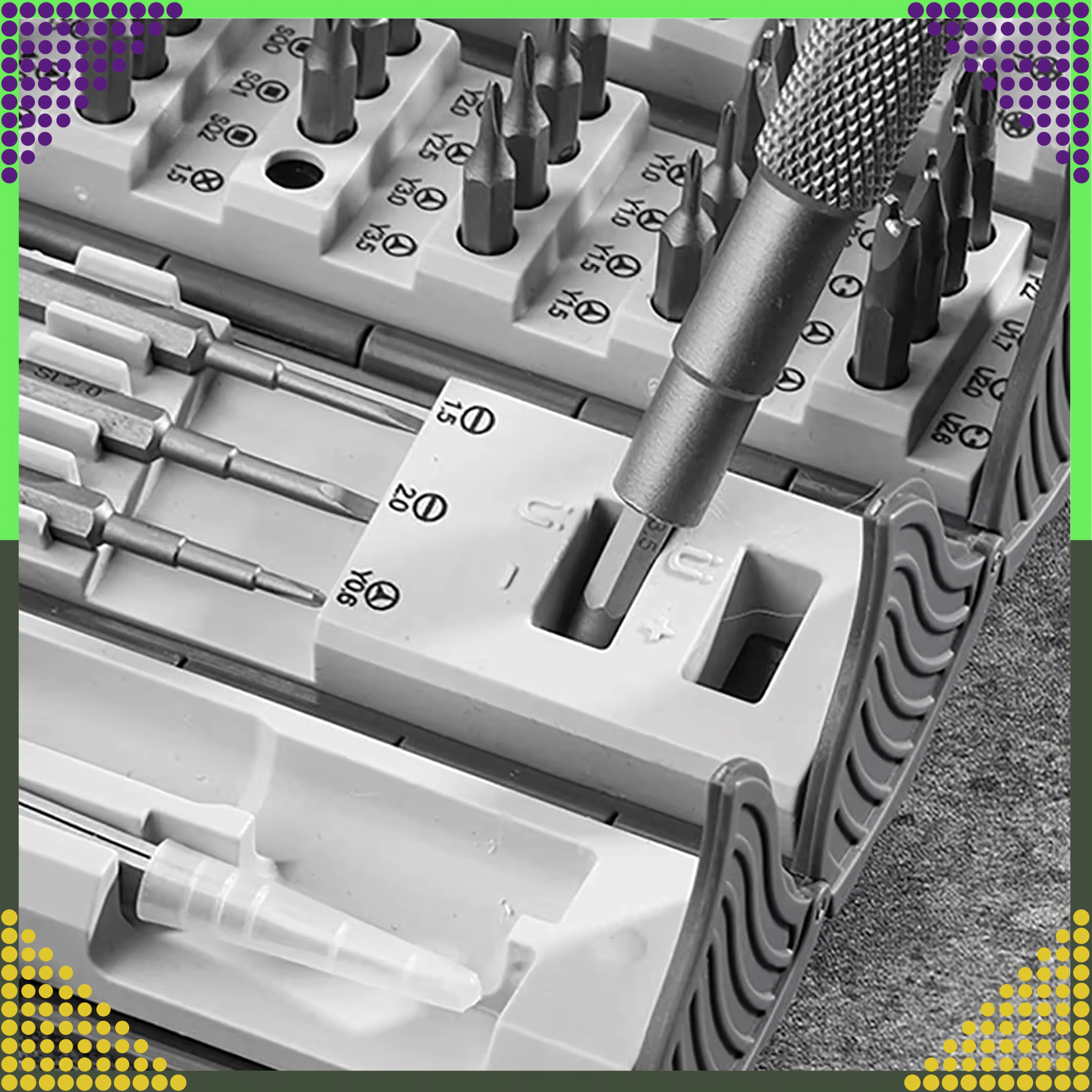 Selecția largă de capete și accesorii acoperă majoritatea operațiunilor de service pentru electronice (telefoane, laptopuri, console de jocuri), asamblări fine (ceasuri, ochelari, aparate foto) precum și meșterit uzual în gospodărie. Include un toc practic pentru depozitare ordonată și transport facil.