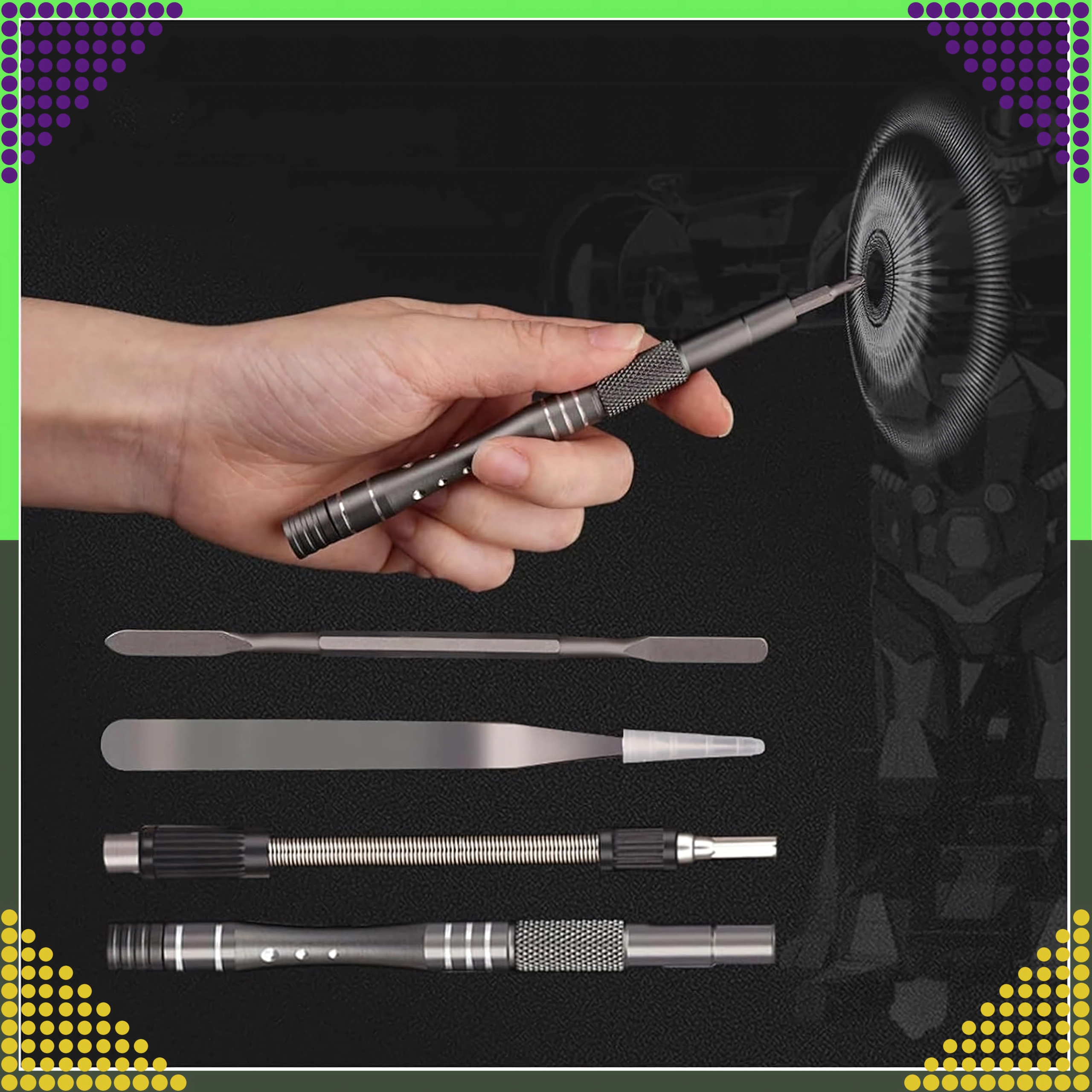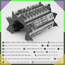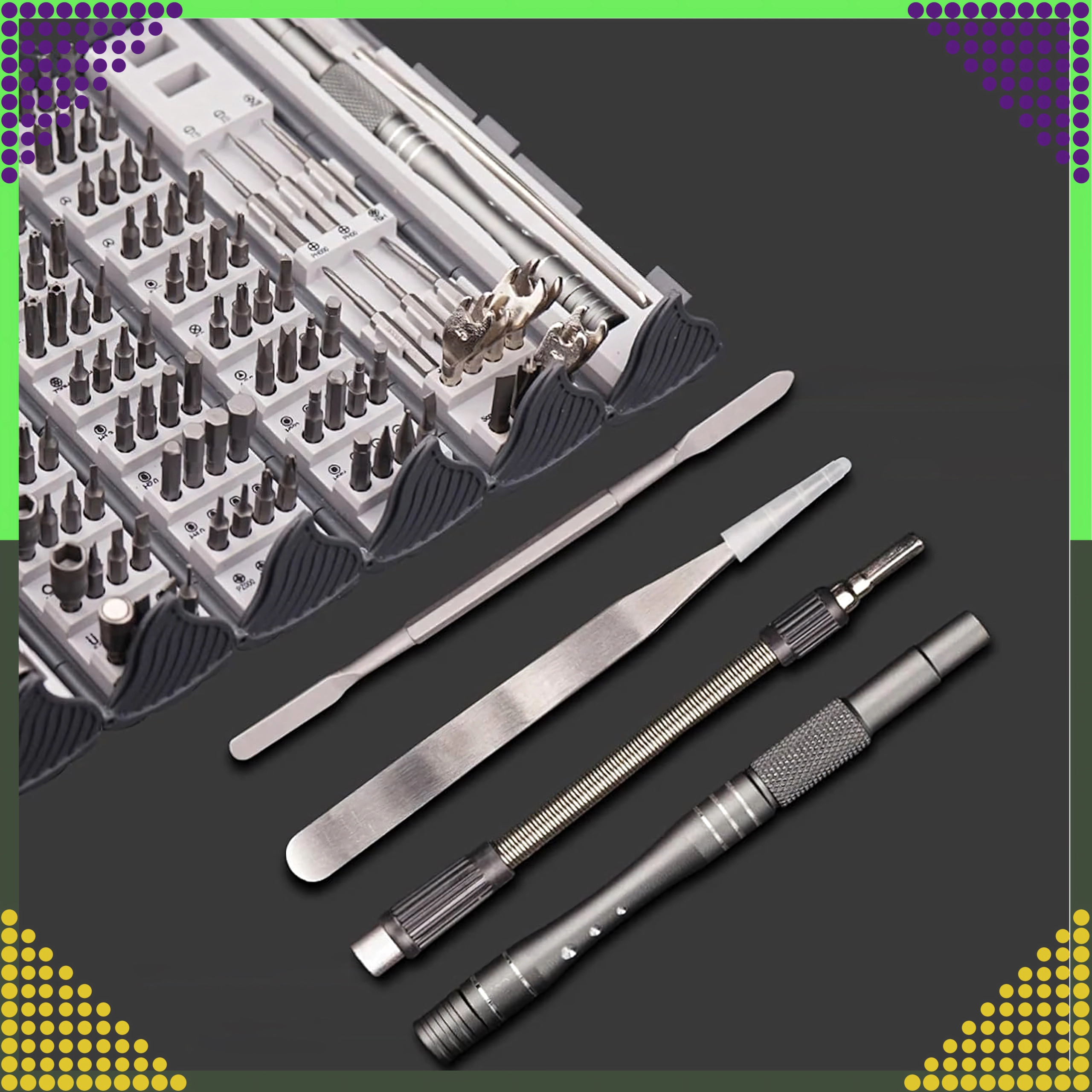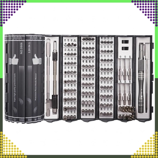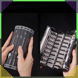 Selecția largă de capete și accesorii acoperă majoritatea operațiunilor de service pentru electronice (telefoane, laptopuri, console de jocuri), asamblări fine (ceasuri, ochelari, aparate foto) precum și meșterit uzual în gospodărie. Include un toc practic pentru depozitare ordonată și transport facil.