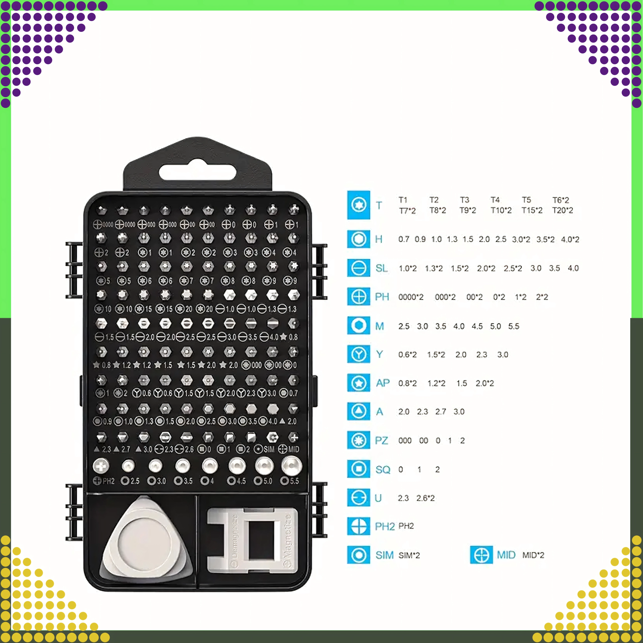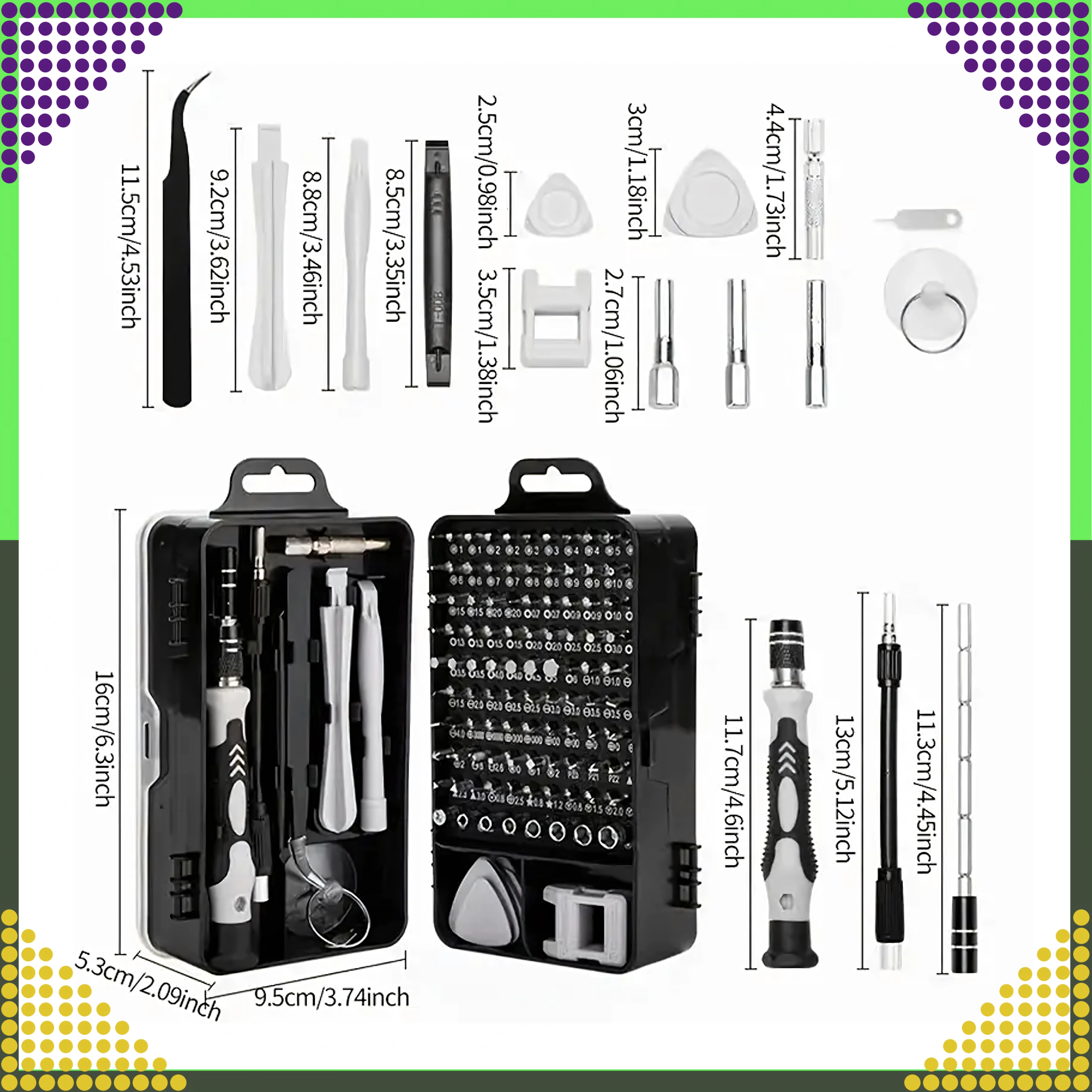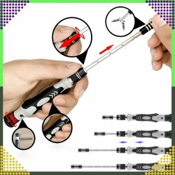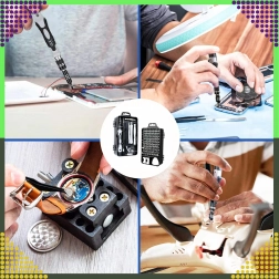 Găsiți aici 100 de biți magnetici cu gâturi mai lungi pentru acces mai bun, mâner cu prelungitor, pensetă, ventuză, leviere și deschizătoare triunghiulare, precum și magnetizor/demagnetizor. Setul este ideal pentru reparații de telefoane, laptopuri, PC-uri, ceasuri, ochelari, camere foto și modele în miniatură.
