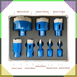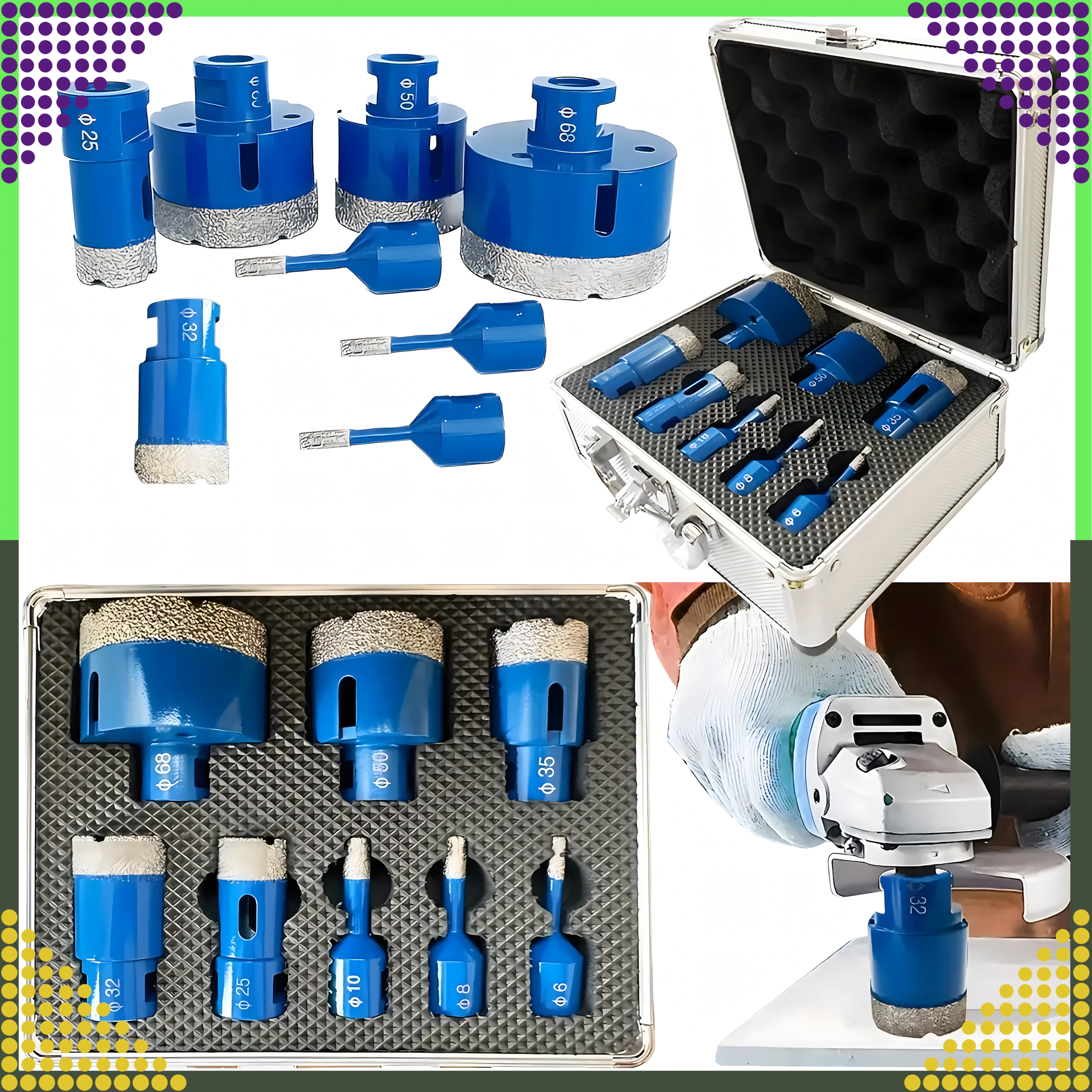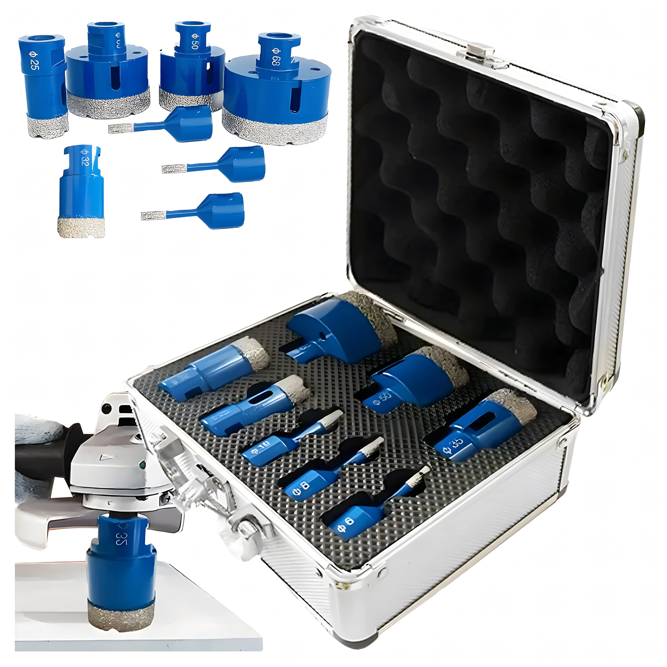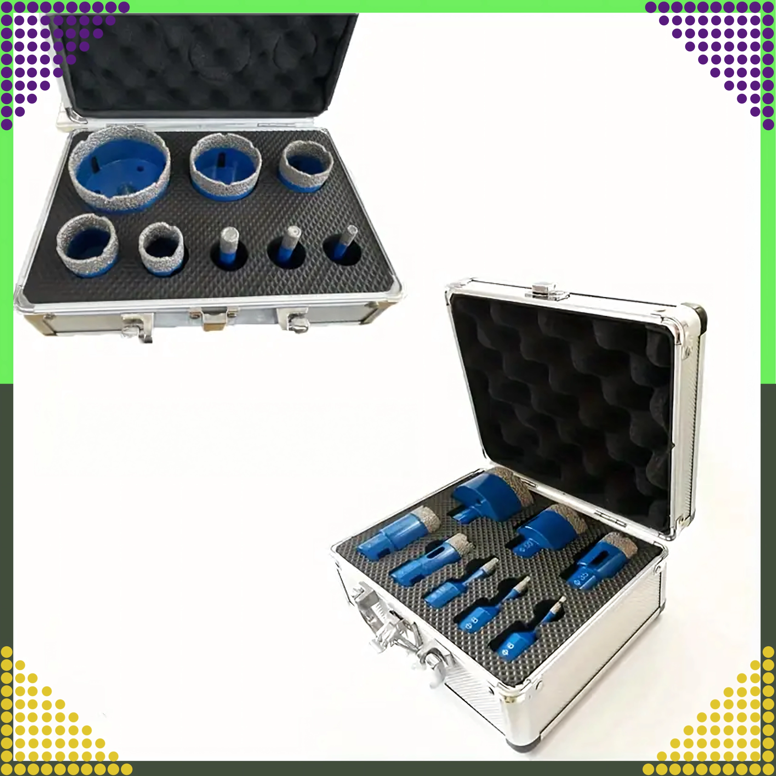 Set universal de carote diamantate pentru găurire precisă în gresie porțelanată, plăci ceramice, beton, cărămidă și granit. Conține 8 dimensiuni (6, 8, 10, 25, 32, 35, 50, 68 mm) pentru utilizare variată. Stratul diamantat rezistent asigură durată de viață îndelungată și margini netede ale orificiilor. Totul este depozitat într-o valiză practică din aluminiu pentru transport și depozitare în siguranță.