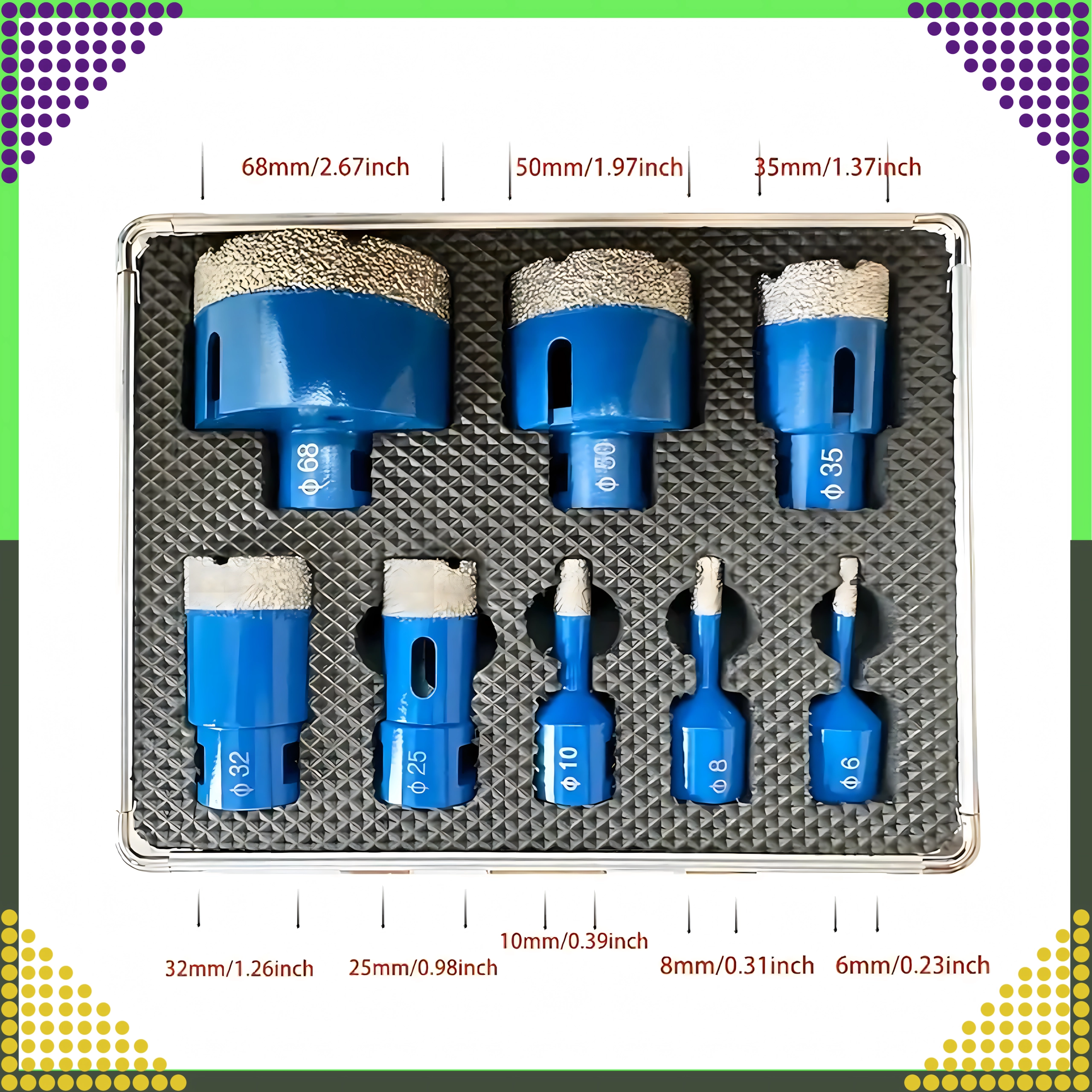 - 8 diametre în set: 6, 8, 10, 25, 32, 35, 50, 68 mm – pentru orificii uzuale de instalații.