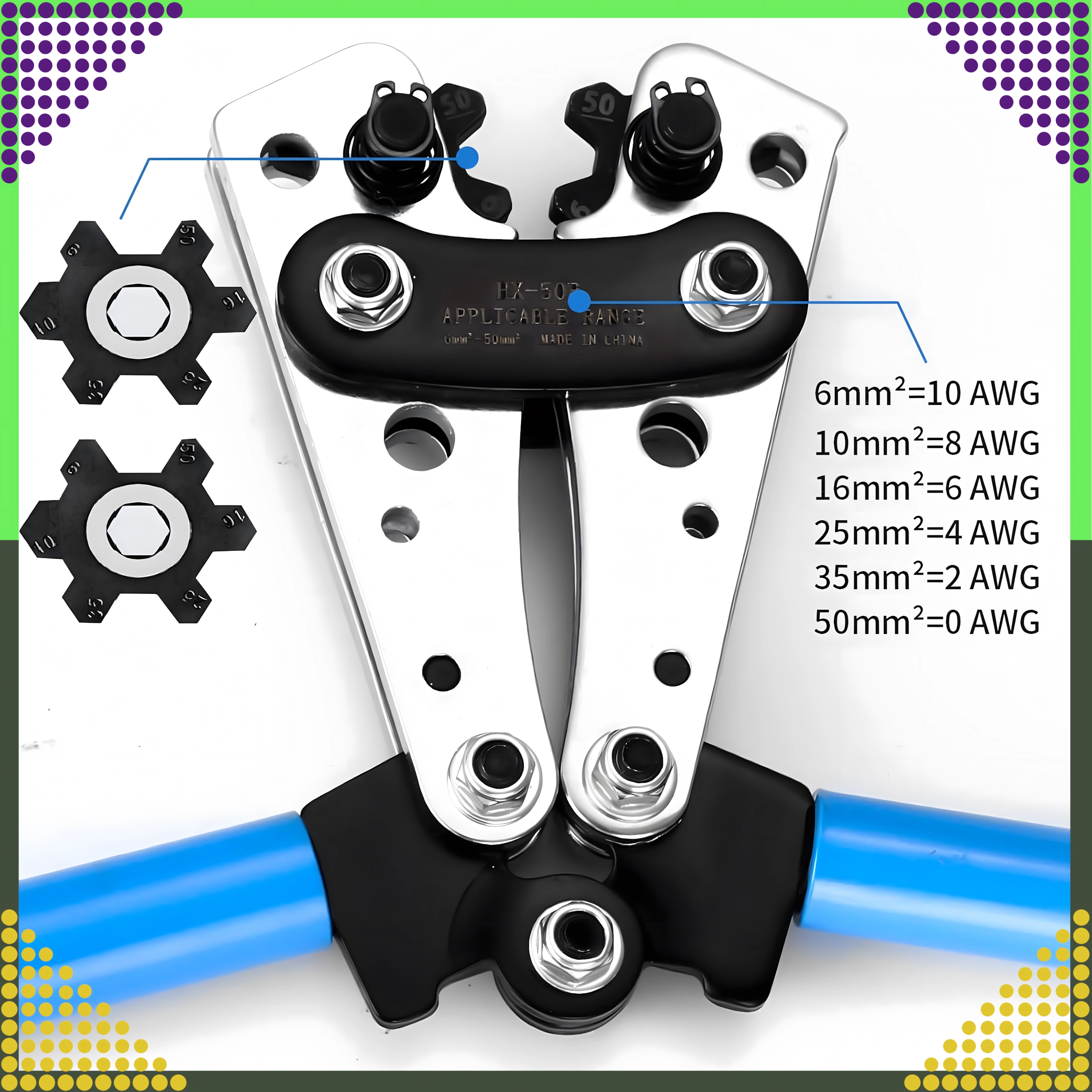 Această presă robustă pentru papuci și tubulețe este proiectată pentru lucru precis cu conductori electrici în intervalul 6–50 mm². Matrița de sertizare hexagonală oferă o conexiune stabilă, rezistentă mecanic și cu conductivitate bună. Datorită raportului de pârghie și lungimii de 390 mm obțineți forță mare de sertizare cu efort redus.