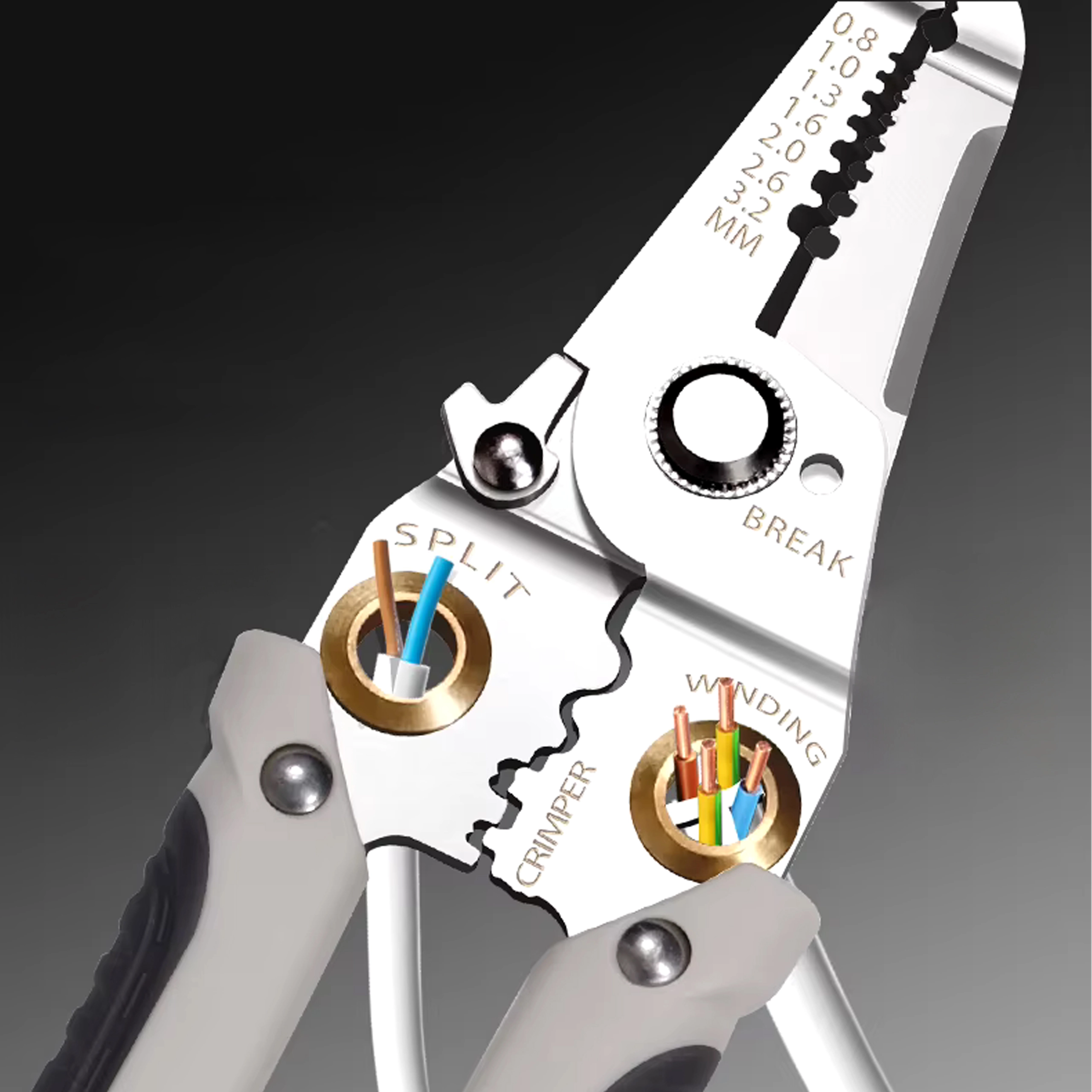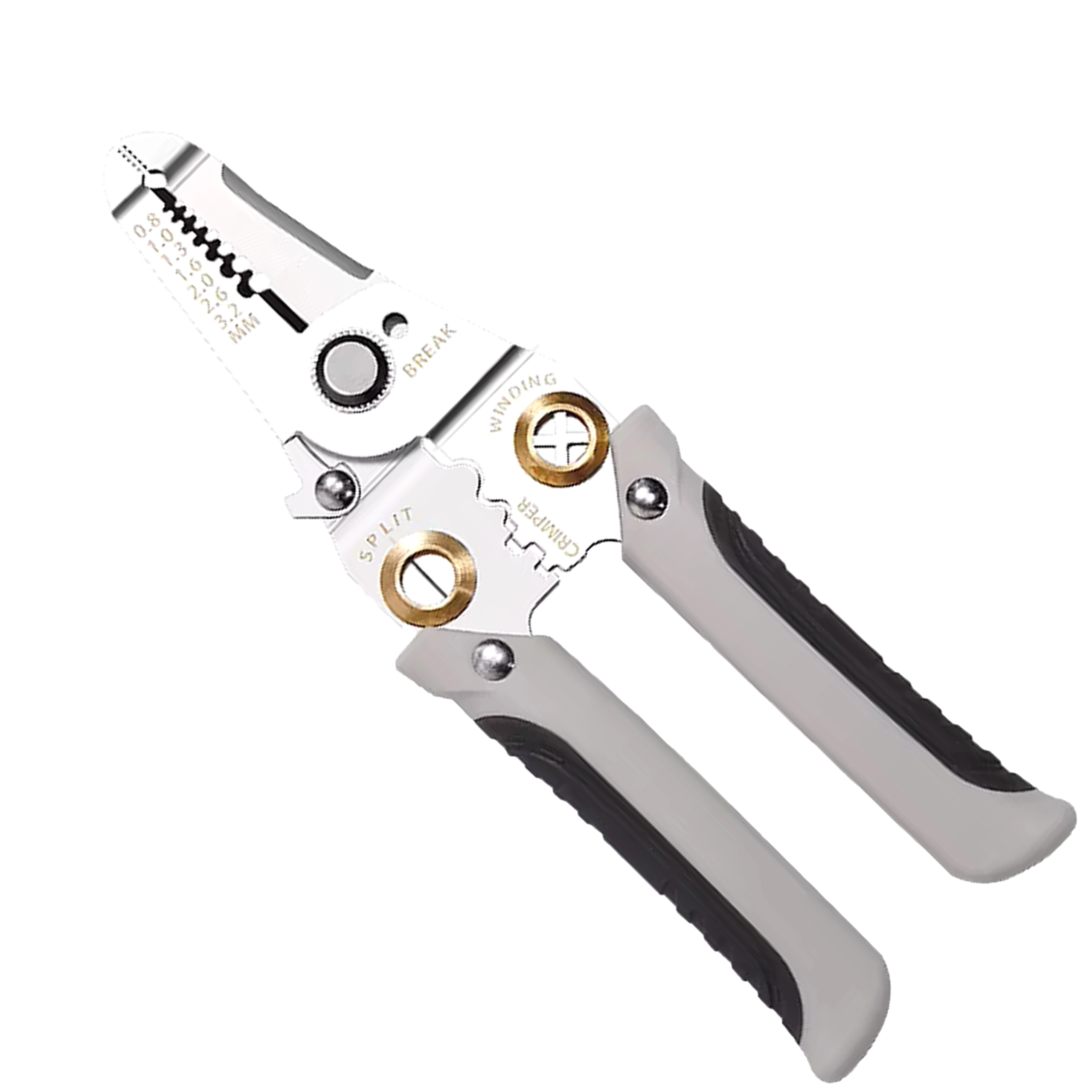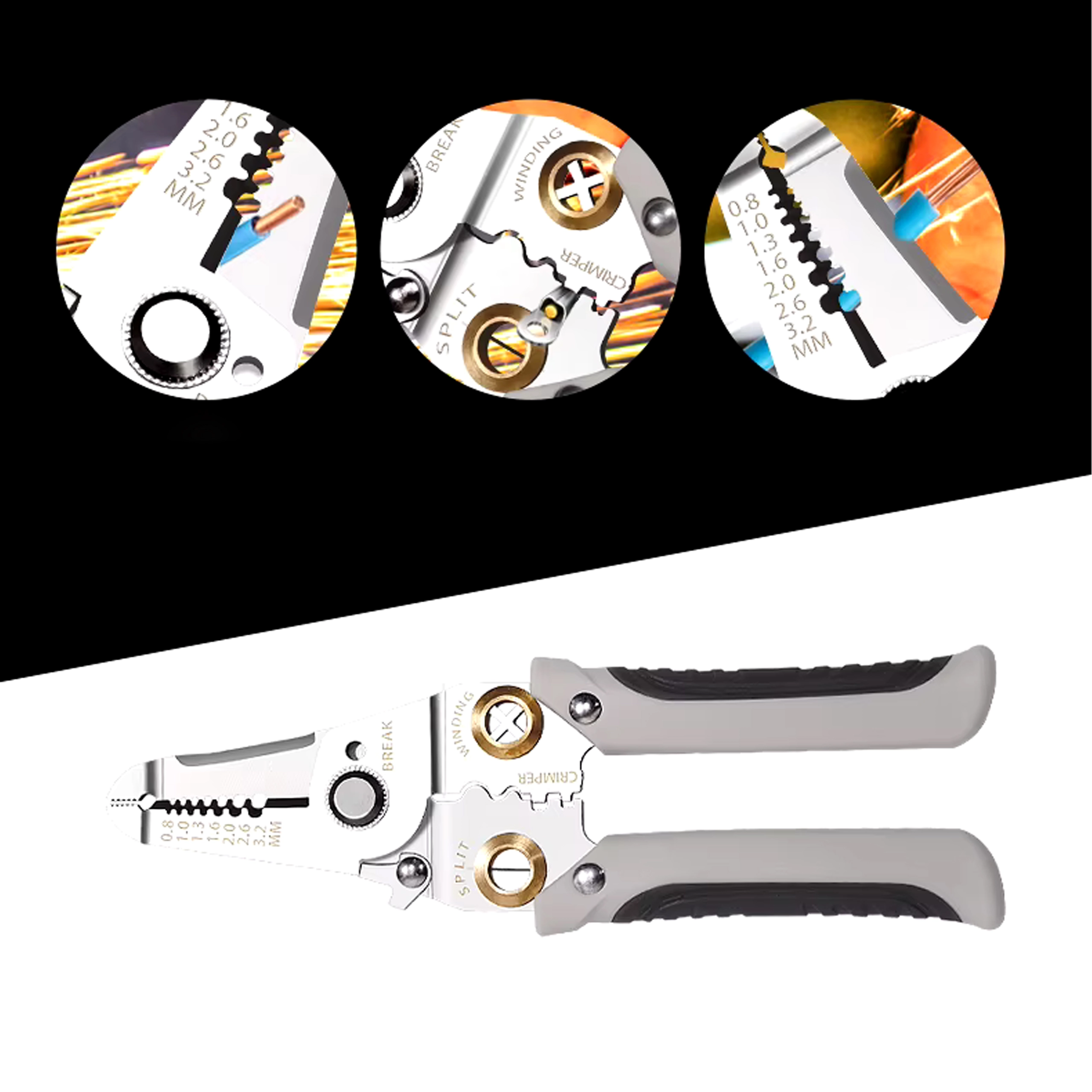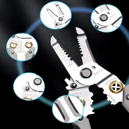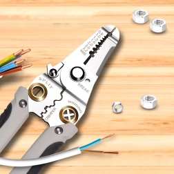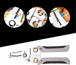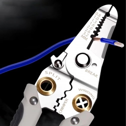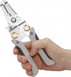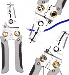- 7 funcții în 1: dezizolare, tăiere, sertizare, răsucire, separare și prindere a conductorilor, plus orificii de tăiere pentru diametre uzuale