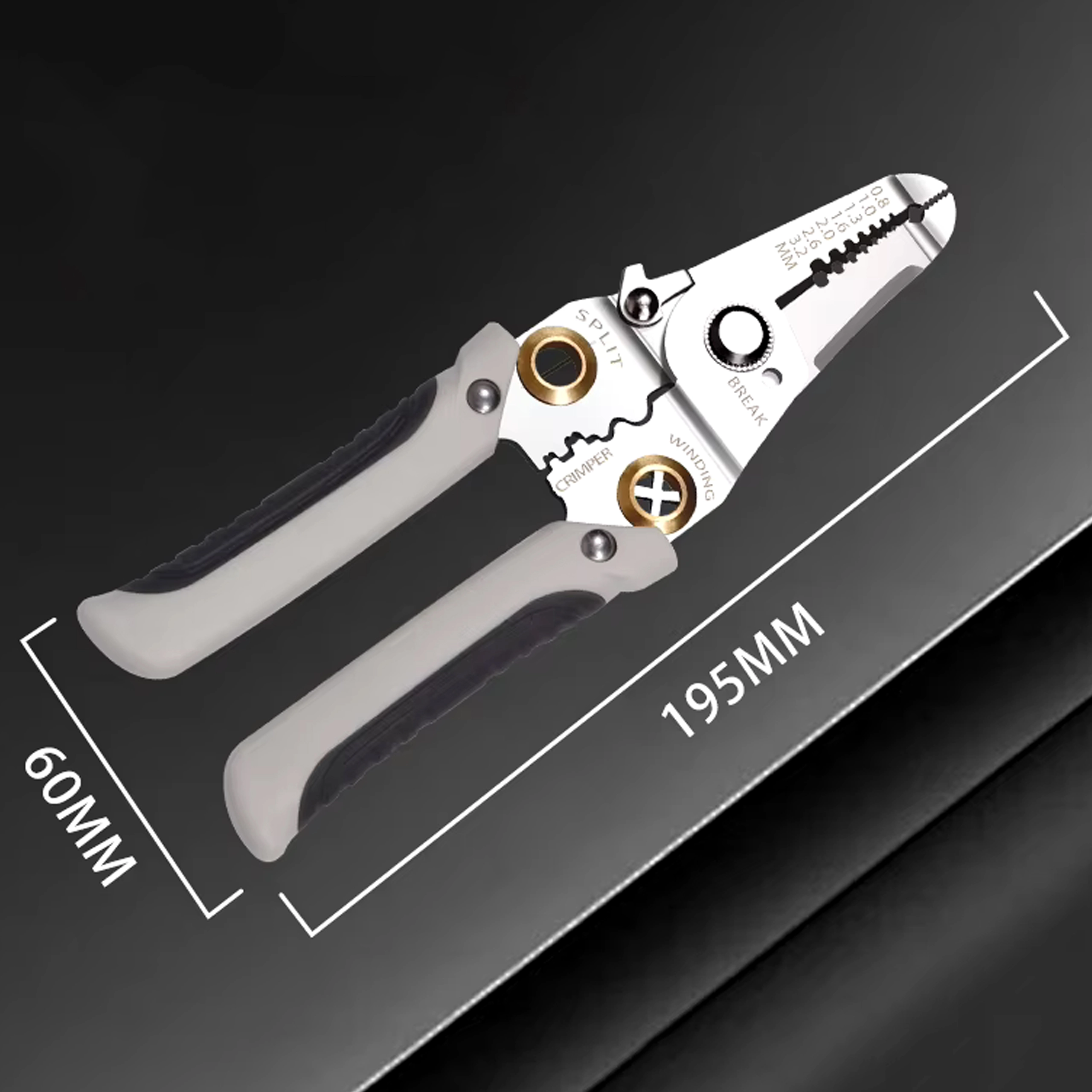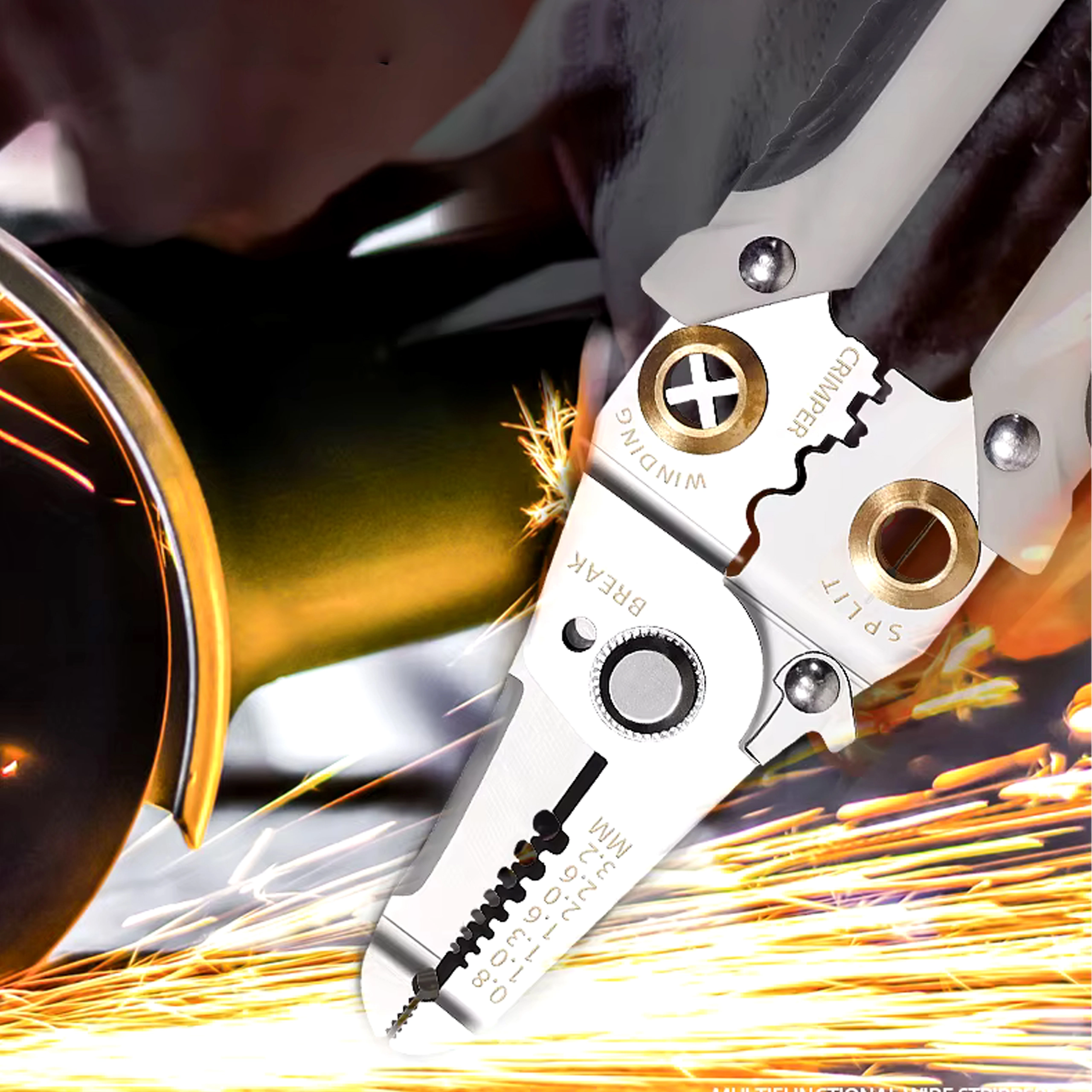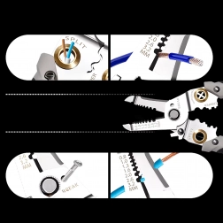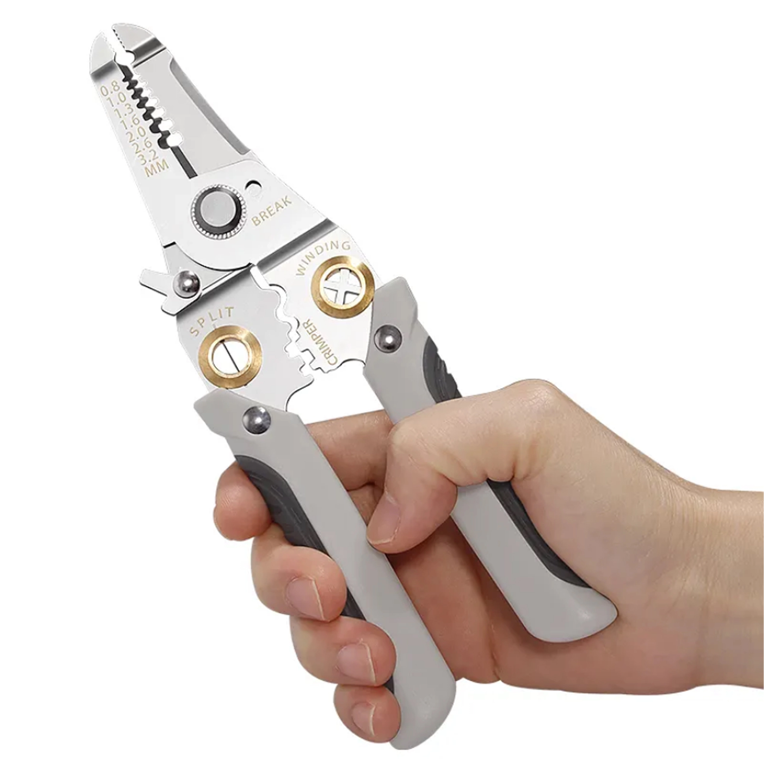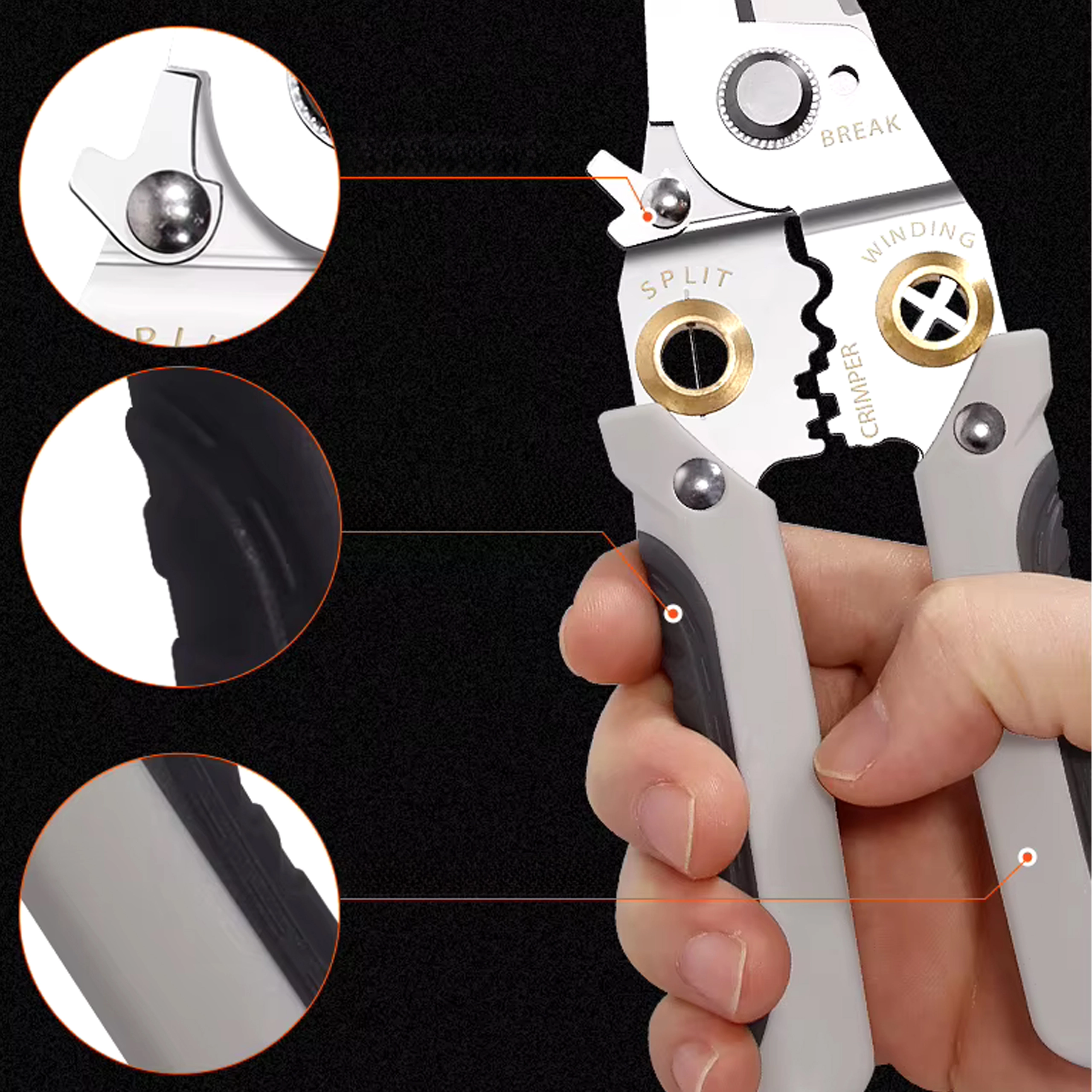 - 7 funcții în 1: dezizolare, tăiere, sertizare, răsucire, separare și prindere a conductorilor, plus orificii de tăiere pentru diametre uzuale