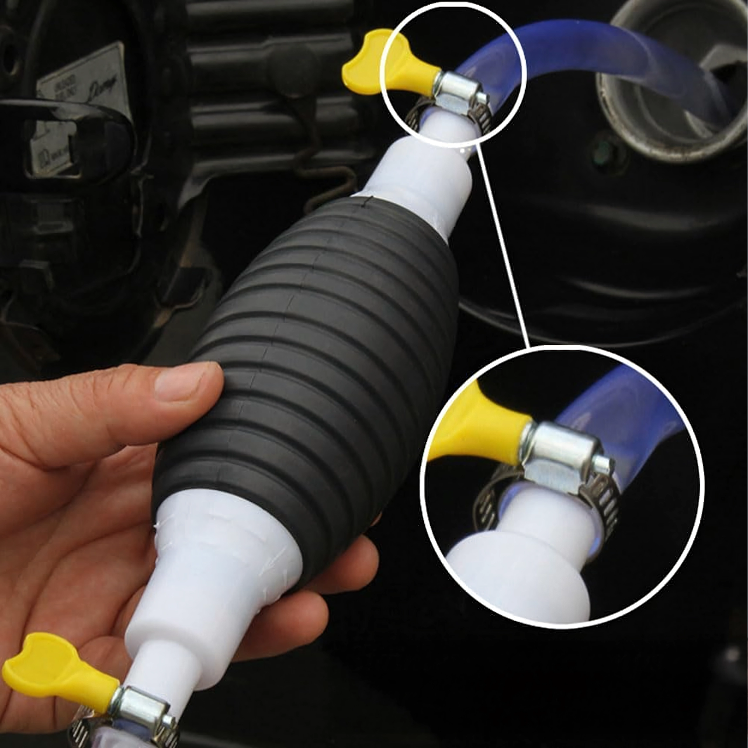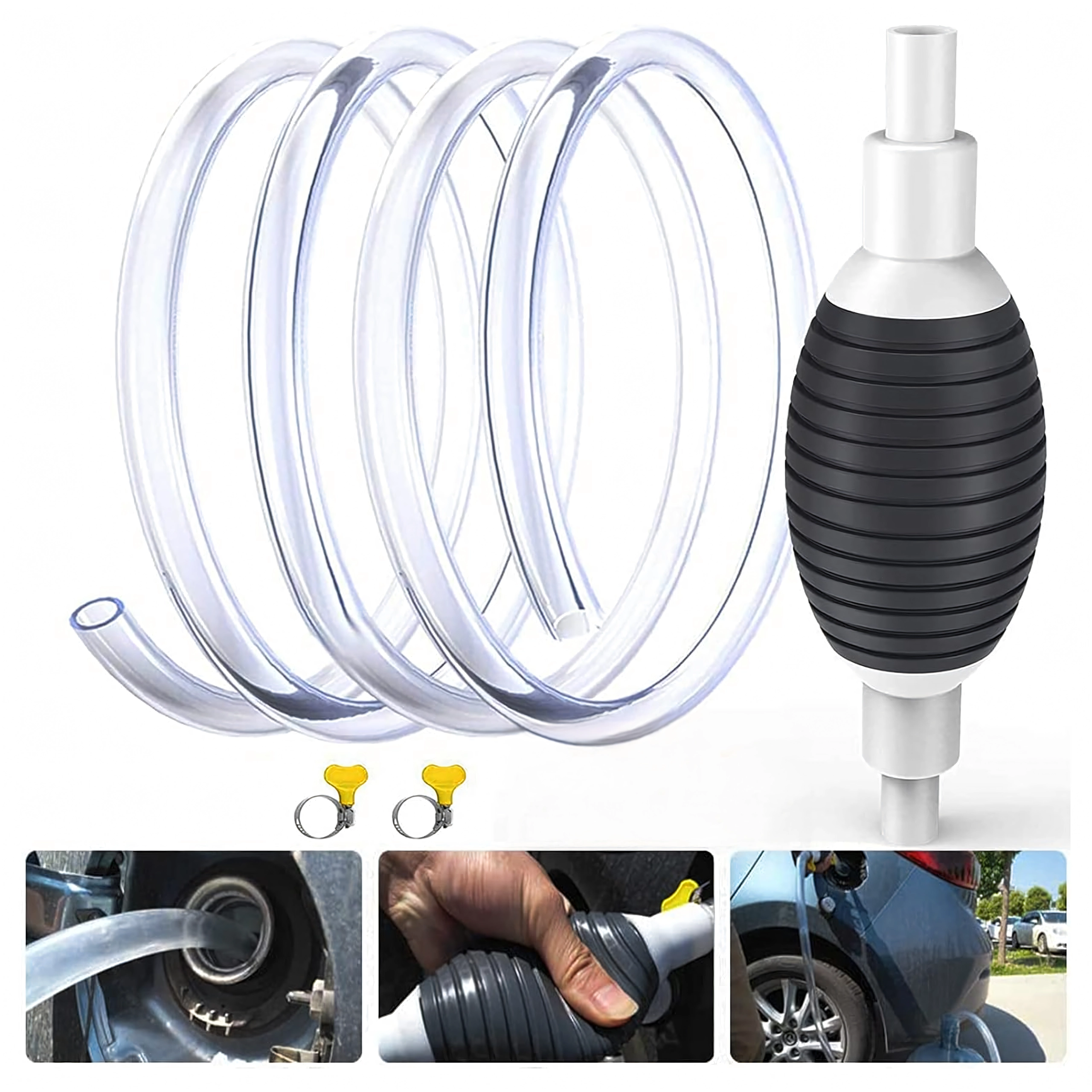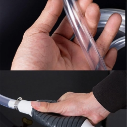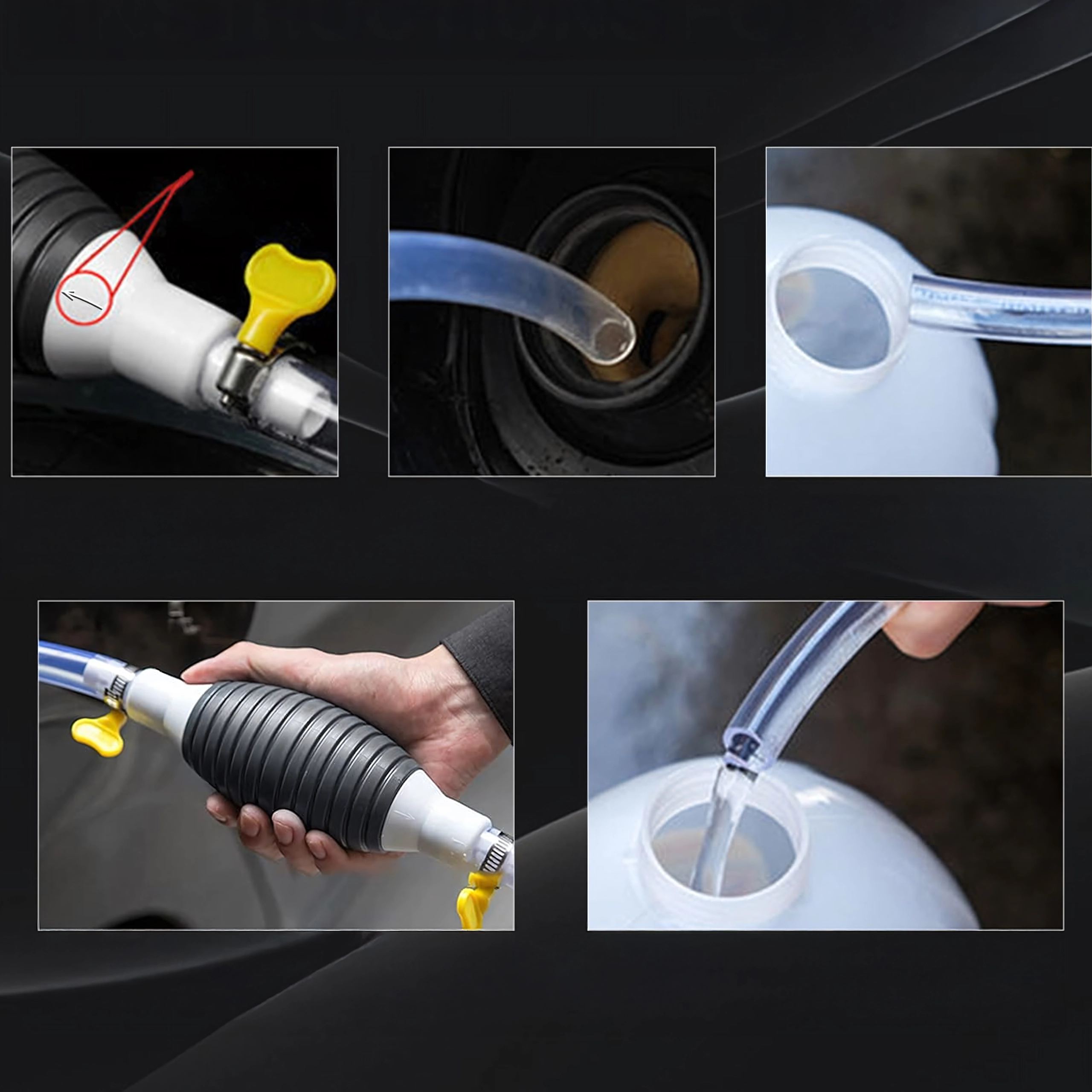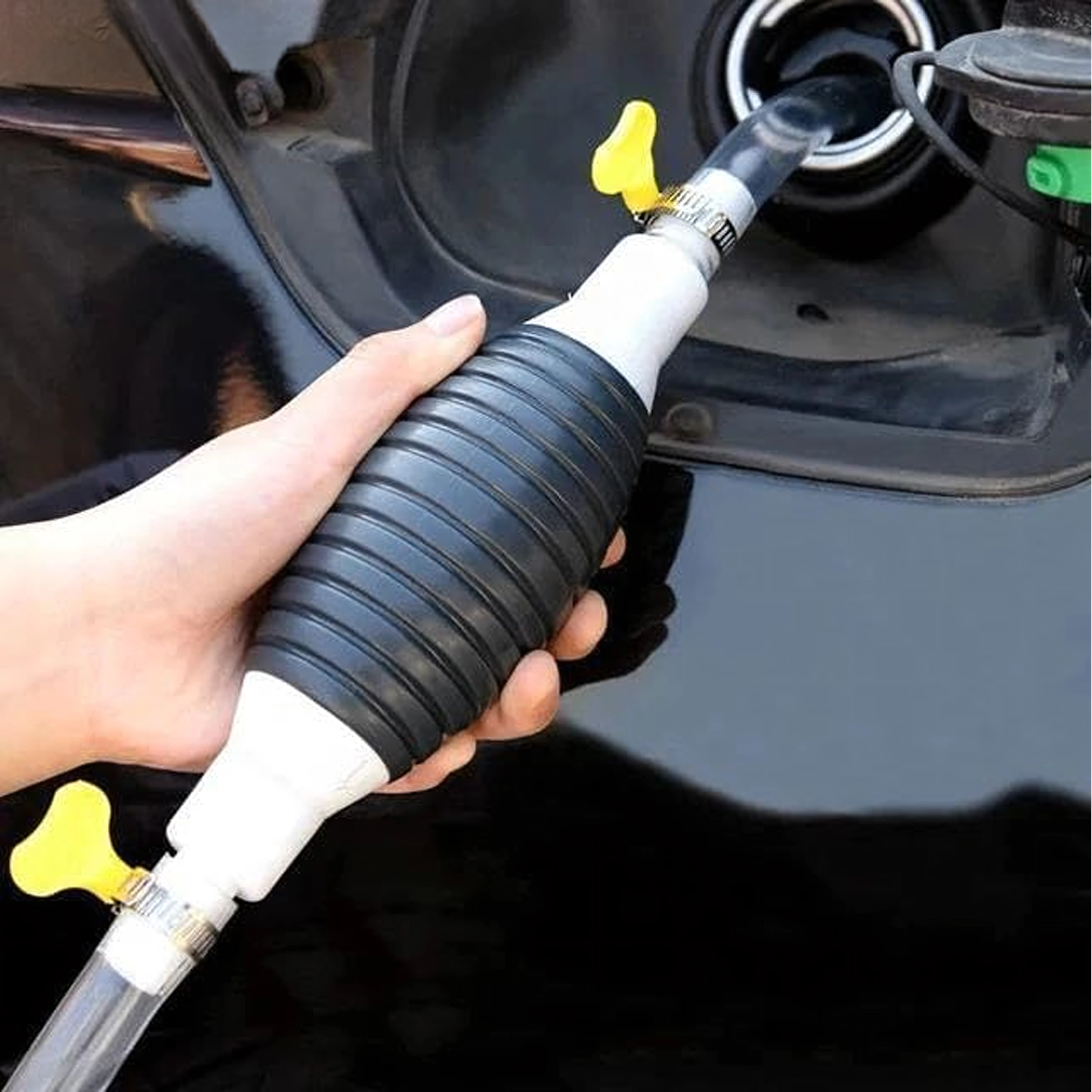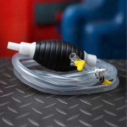 Balonul de strângere creează instantaneu vid și pornește fluxul fără vărsare. Furtunul transparent permite controlul debitului și prevenirea revărsării.