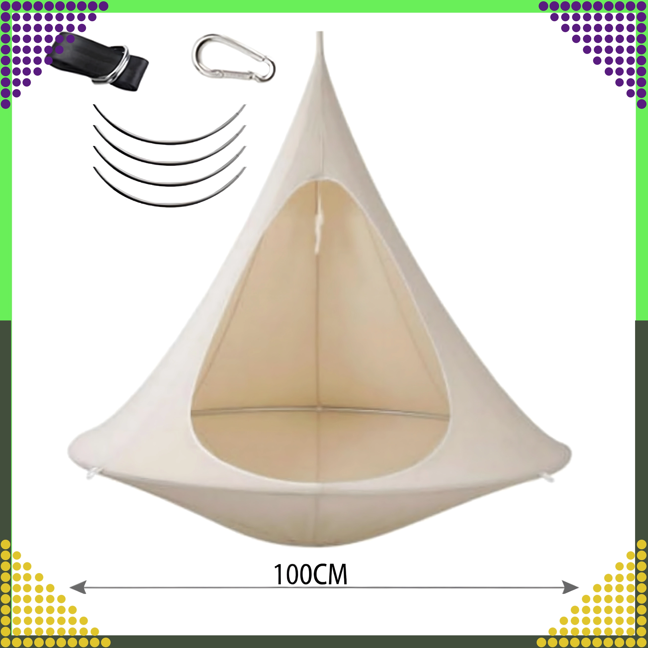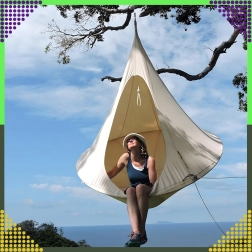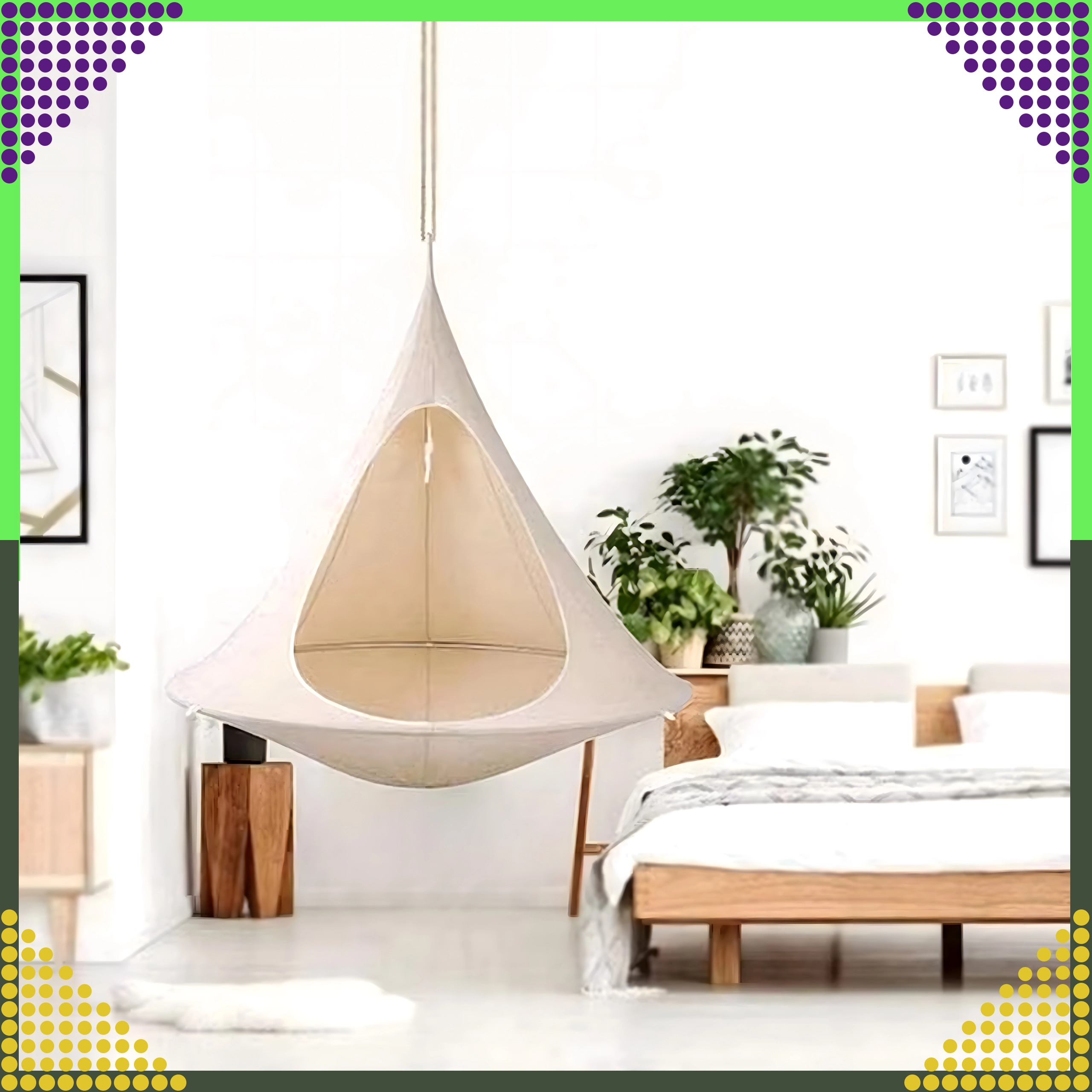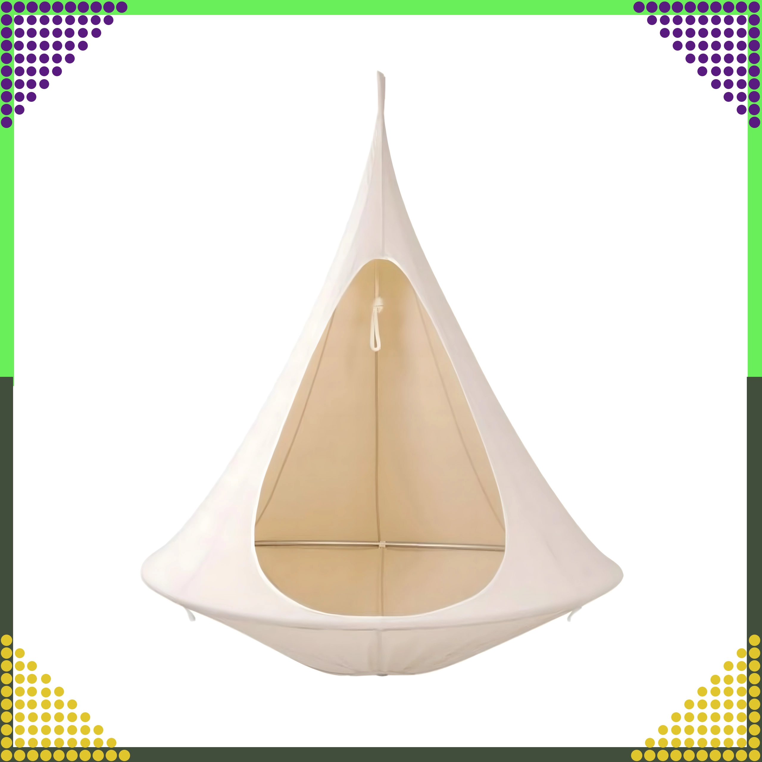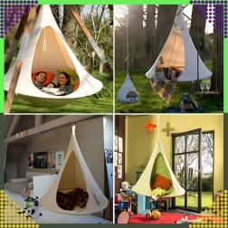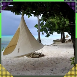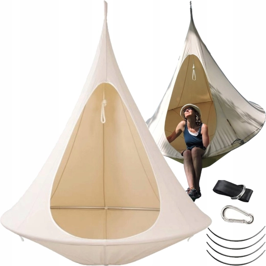 Hamacul suspendat în formă de cocon creează un refugiu plăcut, sigur și liniștit pentru citit, relaxare sau un pui de somn. Datorită materialului respirabil și prinderii rezistente într-un singur punct, este potrivit pentru camera copiilor, living sau în grădină, sub copac. Nuanța bej se potrivește ușor cu orice stil.