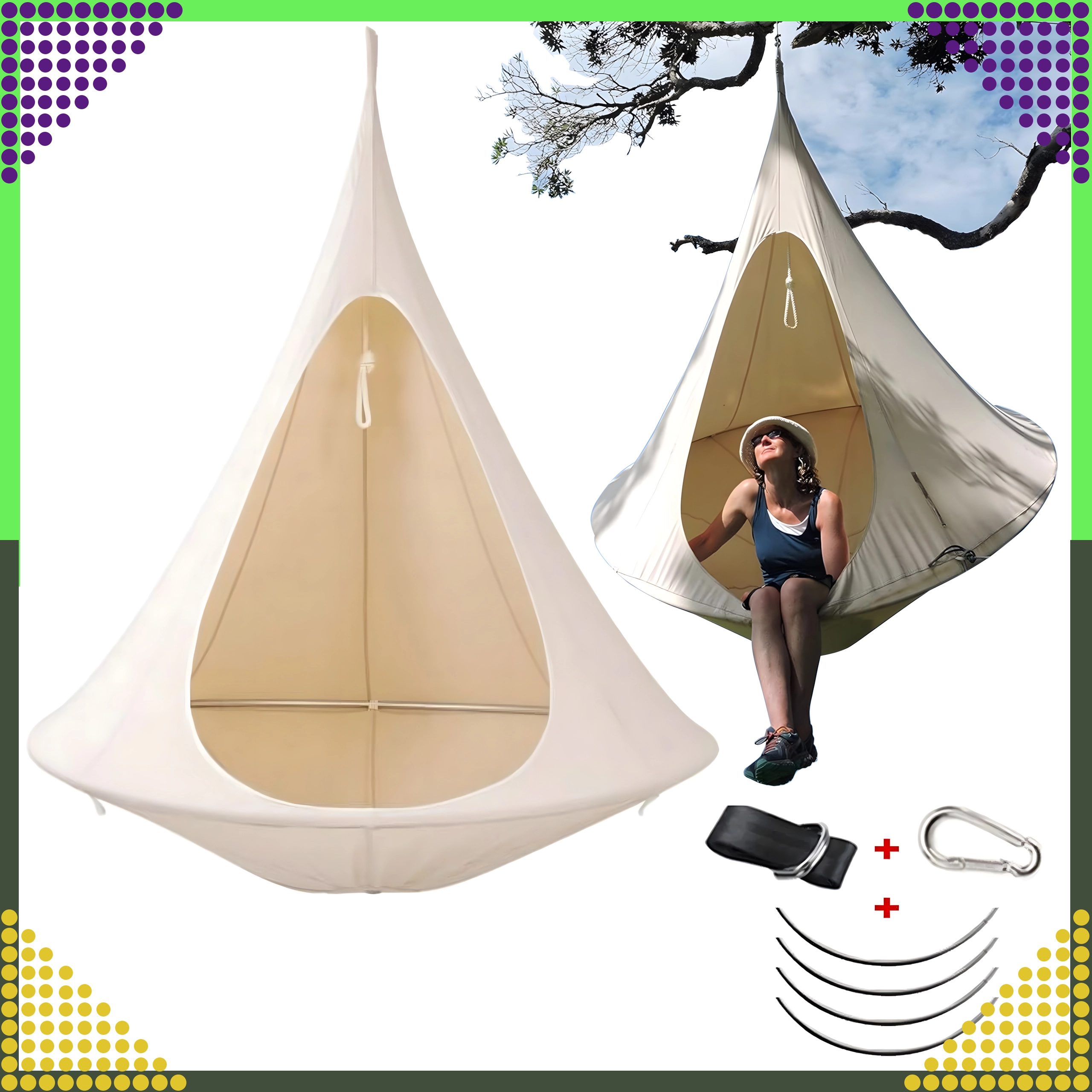 Sunt incluse chinga de prindere și carabiniera pentru fixare rapidă și sigură de un copac, grindă sau cârlig de tavan.