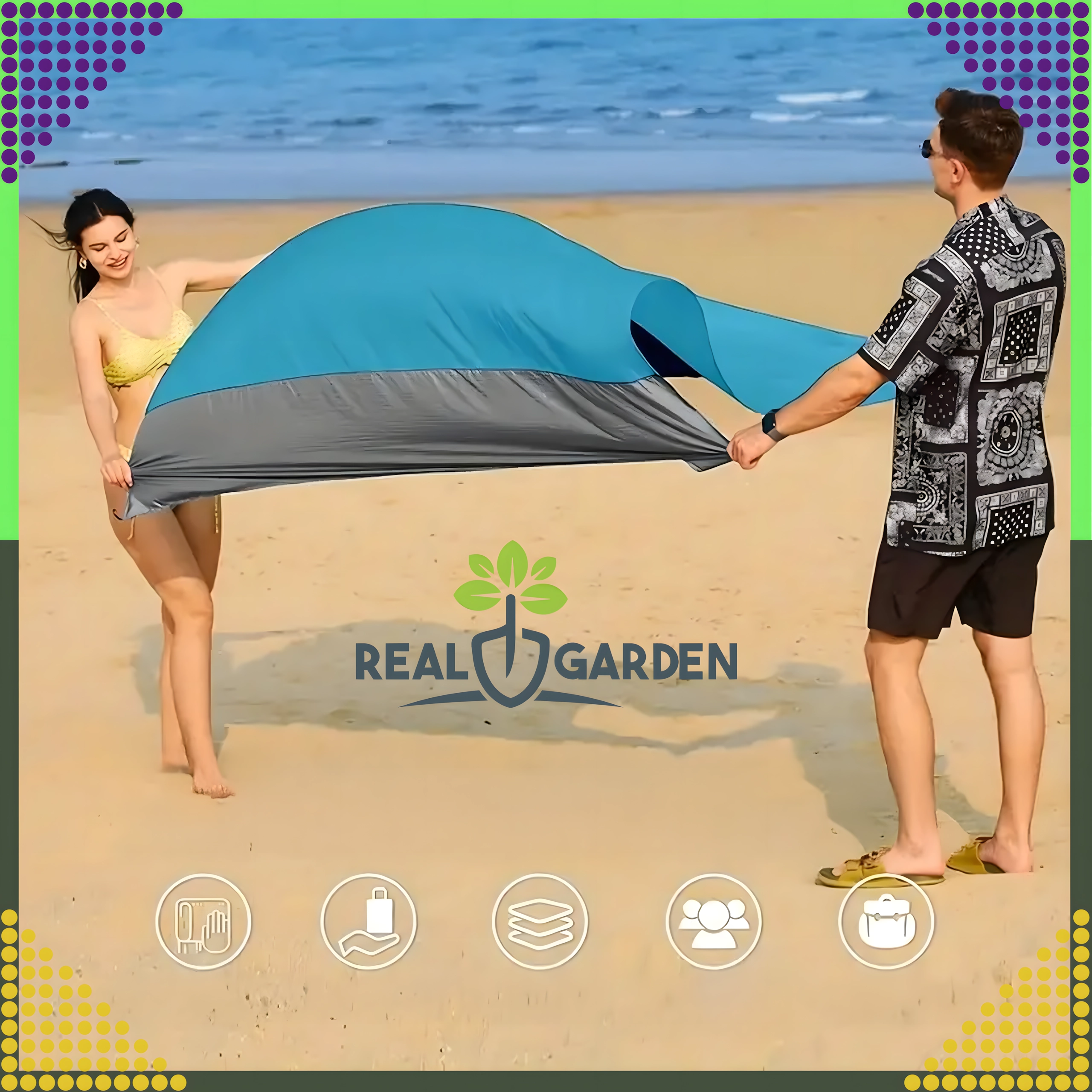 Pătură practică și confortabilă pentru plajă/picnic, cu dimensiuni de 210 × 200 cm, ideală pentru plajă, picnic și camping. Este impermeabilă, ușoară, se pliază ușor și, datorită țărușilor/sistemului de fixare, rămâne stabilă pe poziție. Include o husă practică. Pătura protejează împotriva umezelii, se curăță ușor și oferă spațiu confortabil pentru întreaga familie.