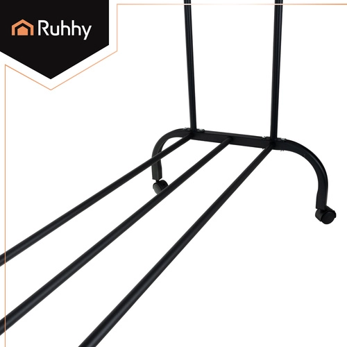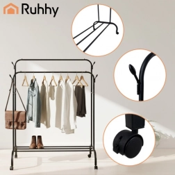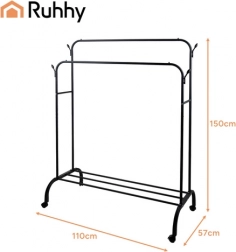 Cauți o soluție practică și economă de spațiu pentru haine, pantofi și accesorii? Standul RUHHY cu două bare oferă suficient loc pentru cămăși, paltoane și rochii fără șifonare. Roțile pivotante cu rotație 360° și frână asigură mutarea ușoară și stabilitatea, iar raftul inferior suportă mai multe perechi de pantofi sau cutii de depozitare.