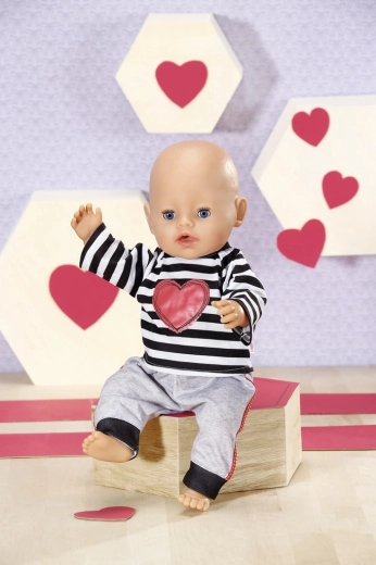 Setul stilat pentru păpuși Dolly Moda oferă confort și farmec pentru joaca de zi cu zi. Datorită croielii universale, se potrivește perfect păpușilor de 39–46 cm, inclusiv BABY born și Baby Annabell. Setul include un hanorac în dungi, cu mânecă lungă și o inimă mare roșie, și pantaloni de trening gri comozi, cu manșete contrastante și dungi laterale roșii. Mărime universală, execuție de calitate și susținerea creativității și a jocului de rol fac din acest set un accesoriu grozav pentru orice păpușă.