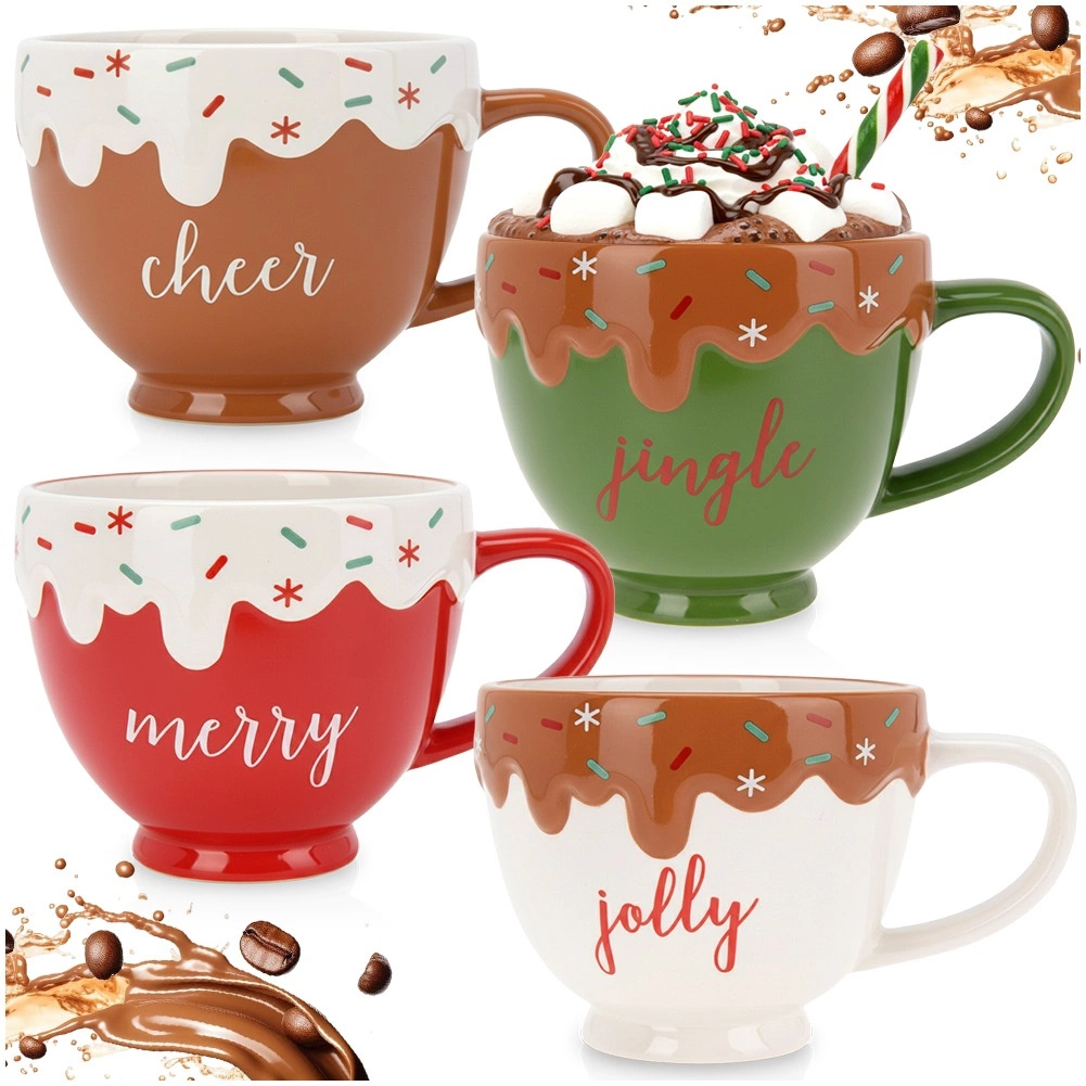 Acest set de patru căni festive aduce în bucătăria ta atmosfera plină de bucurie a Crăciunului. Fiecare cană este decorată cu efect de „glazură care se prelinge” cu presărare colorată și cu o inscripție veselă, devenind astfel nu doar practice, ci și un element decorativ.