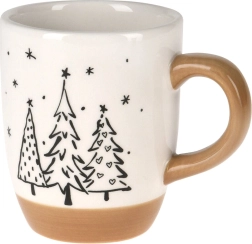 Adu în casa ta atmosfera sărbătorilor cu cana ceramică elegantă decorată cu brazi minimalisti. Combinația glazurii albe cu mâner și bază bej este rafinată și atemporală, astfel cana se potrivește oricărei mese.