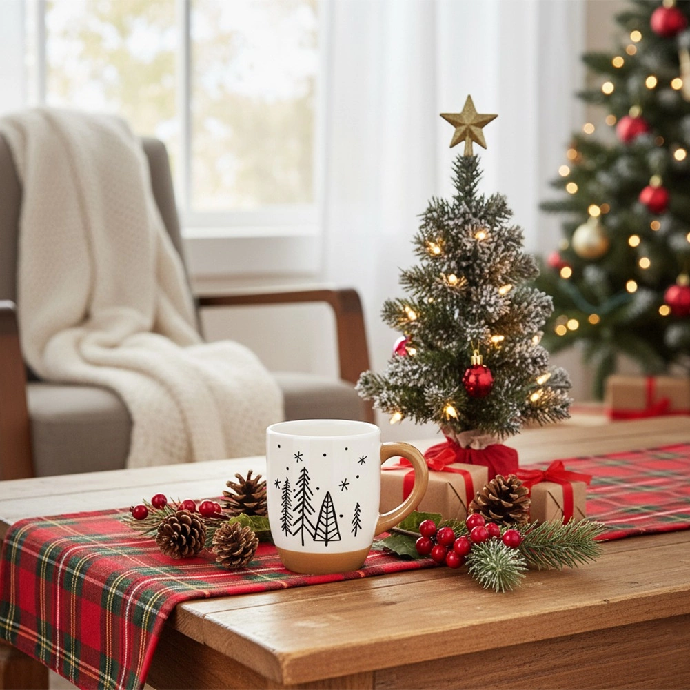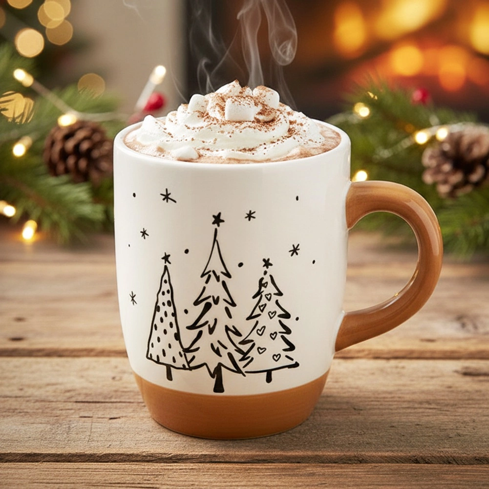 Cană albă cu brazi negri și bază bej care adaugă stil băuturilor de iarnă și creează o atmosferă festivă plăcută.