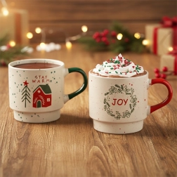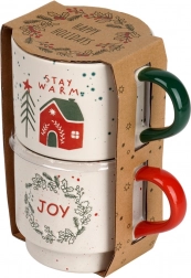 Descoperă farmecul serilor de iarnă cu setul elegant de 2 căni de Crăciun din gresie porțelanată de calitate, în finisaj crem/bej cu detalii roșii și verzi. Motivele atrăgătoare „JOY” și „STAY WARM” dau un plus de stil oricărei mese și sunt perfecte și ca idee de cadou pentru cei dragi.