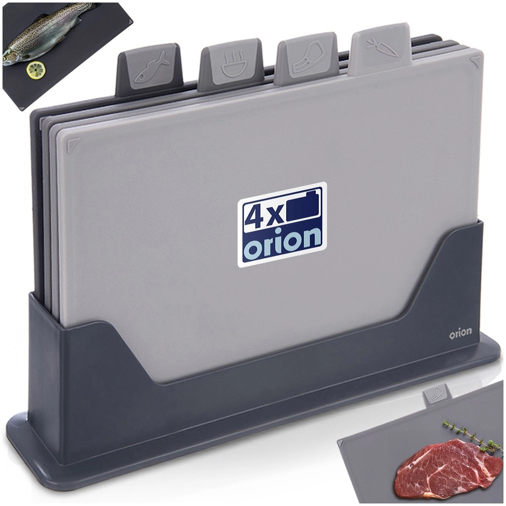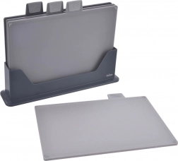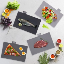 Acest set de 4 tocătoare în nuanțe de gri este proiectat pentru gătitul de zi cu zi, cu accent pe igienă și organizare. Etichetele grafice de pe filele superioare indică clar utilizarea pentru legume, carne crudă, mâncăruri gata și pește, astfel încât să mențineți cu ușurință curățenia și ordinea la prepararea alimentelor.