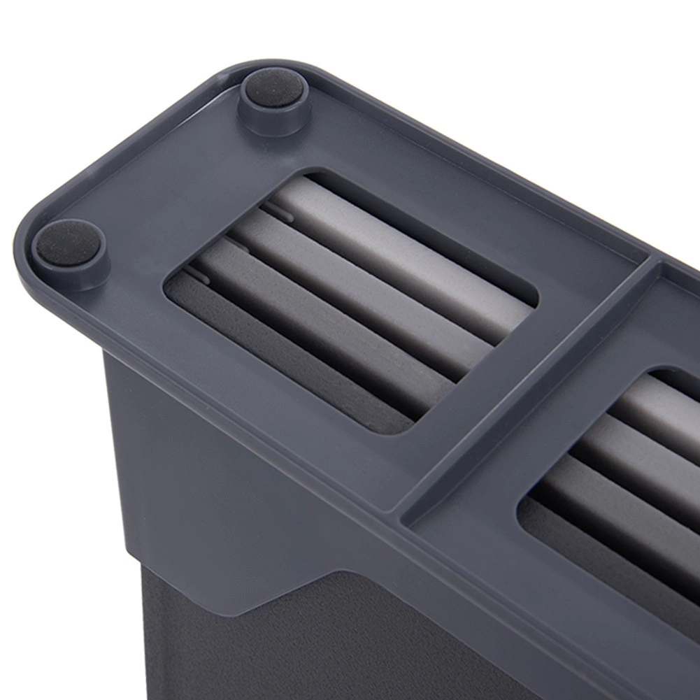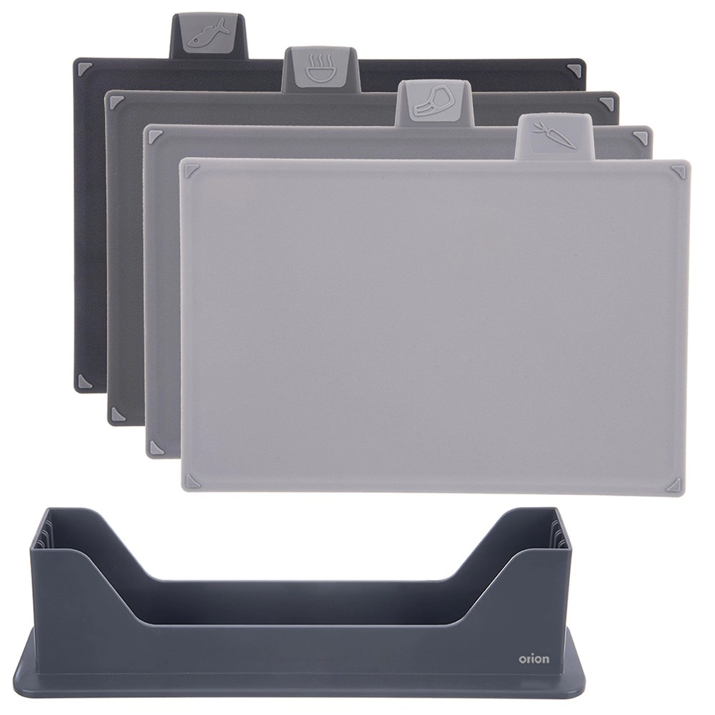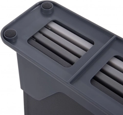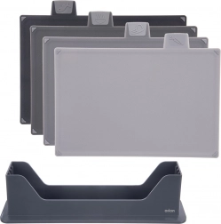 Suportul compact, cu caneluri profilate, menține tocătoarele în poziție verticală, are pad-uri din spumă împotriva alunecării și protejează blatul de zgârieturi.