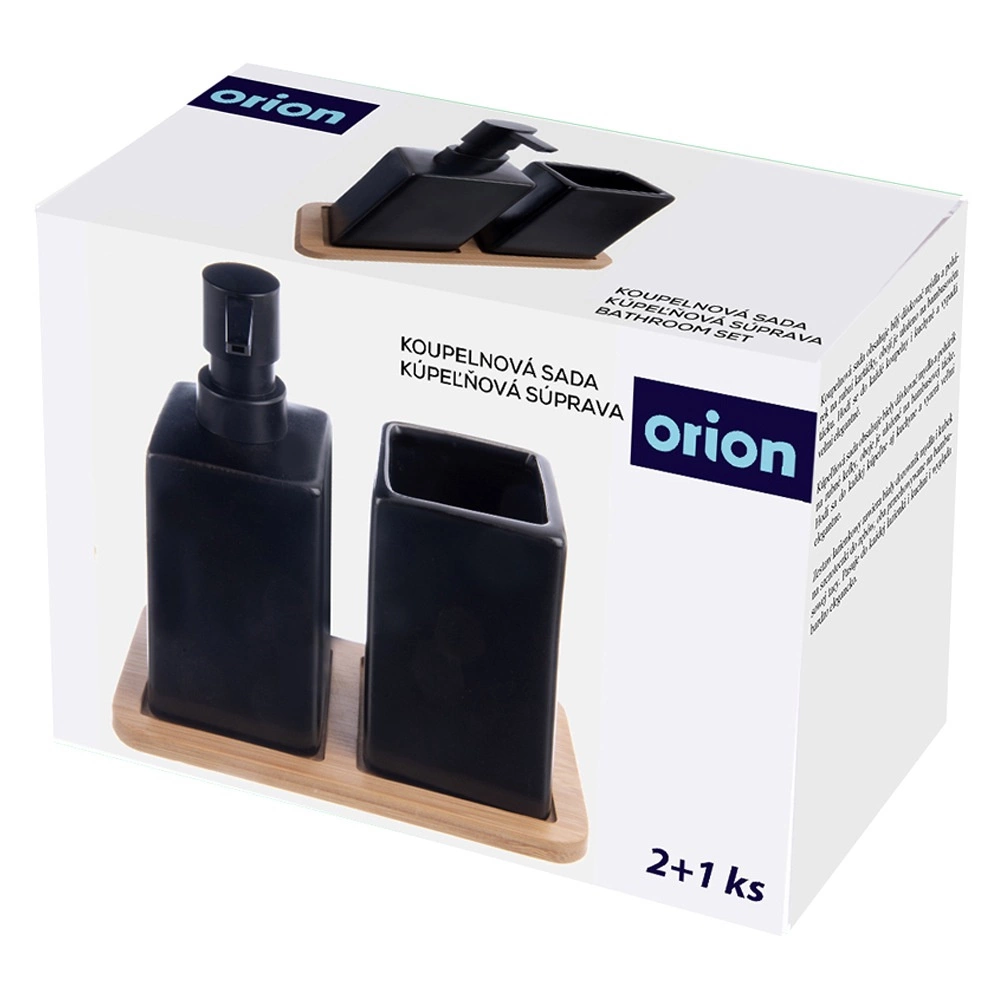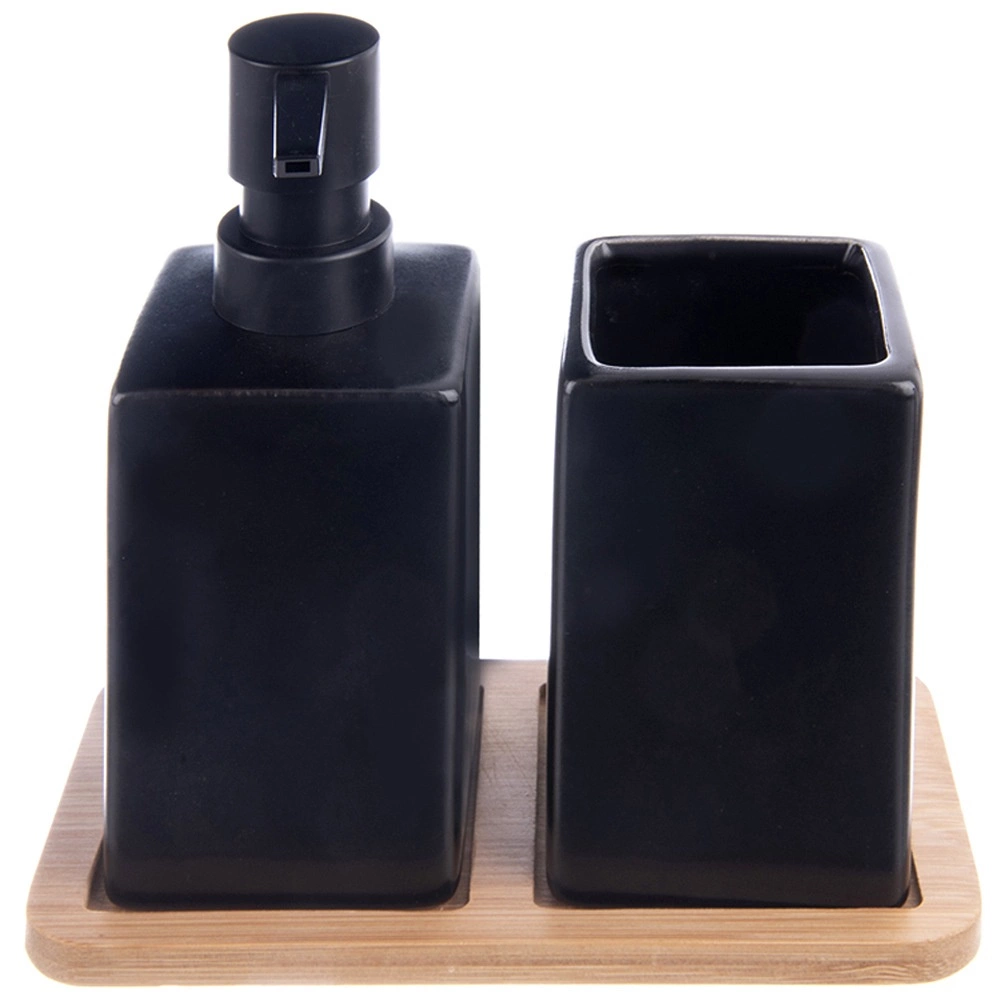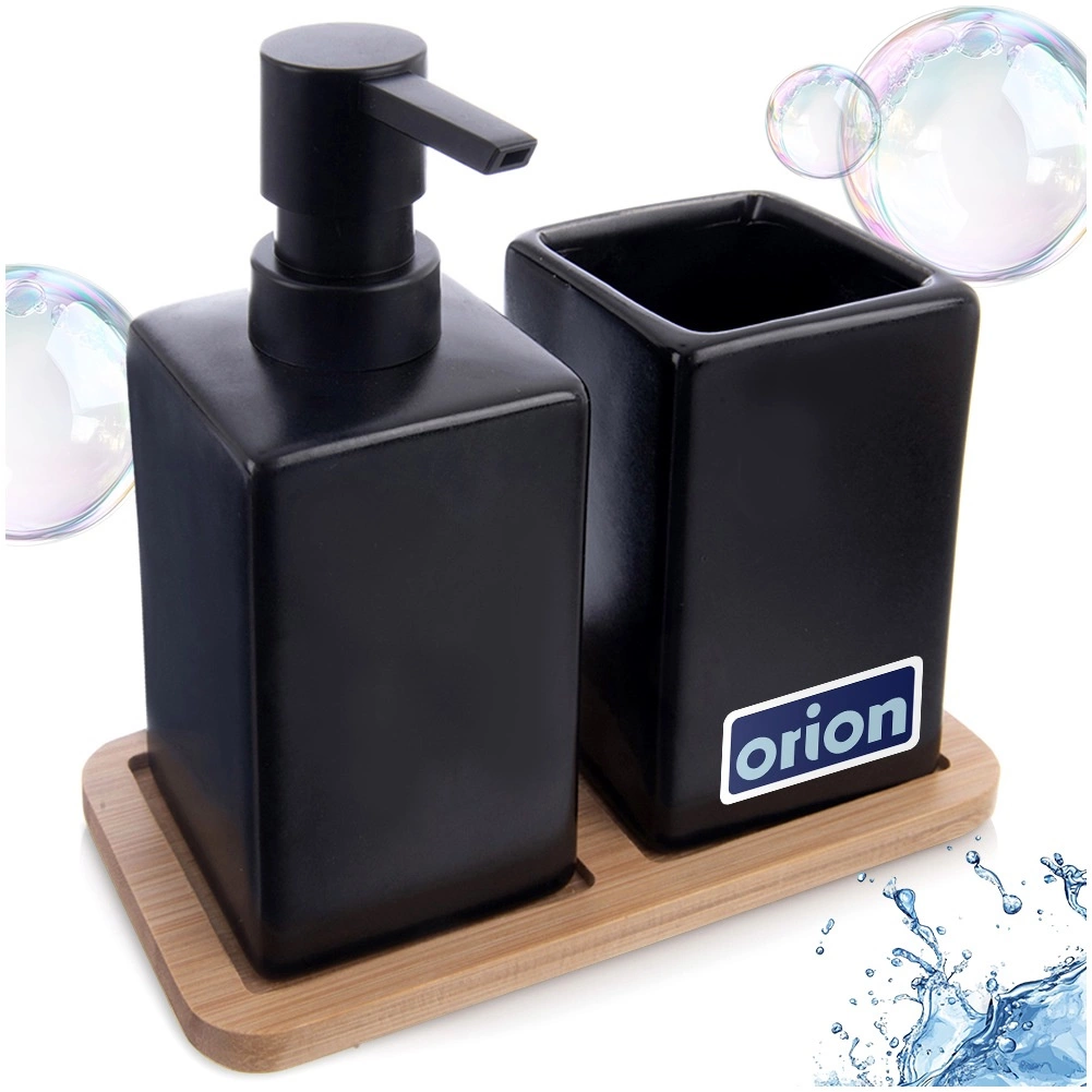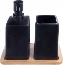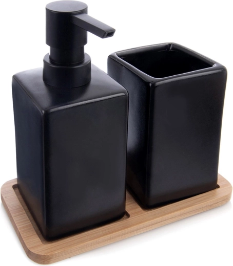 Setul include un dispenser pentru săpun lichid (300 ml), un pahar practic pentru periuțe sau accesorii cosmetice și o tăviță din bambus, care ține totul laolaltă și protejează blatul de umiditate. Dolomitul de calitate asigură stabilitate, rezistență și curățare ușoară, iar bambusul oferă un contrast decorativ natural.