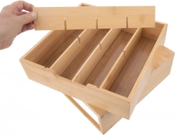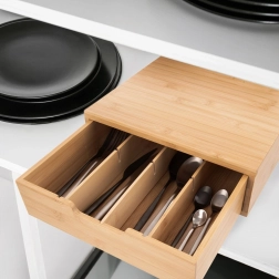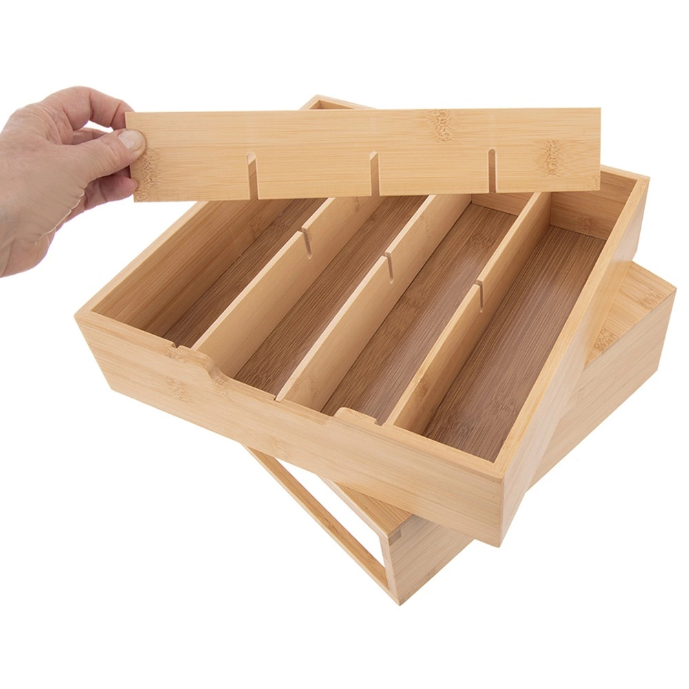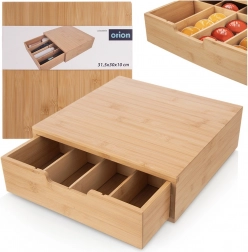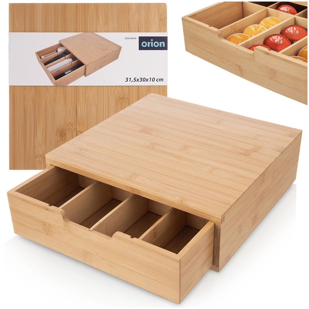 Elegantul organizator din bambus natural îmbină un aspect stilat cu o organizare funcțională. Sertarul cu divizoare permite sortarea clară a capsulelor, pliculețelor de ceai, condimentelor și altor mărunțișuri. Personalizează compartimentarea internă cu ajutorul elementelor detașabile, exact după nevoile tale.