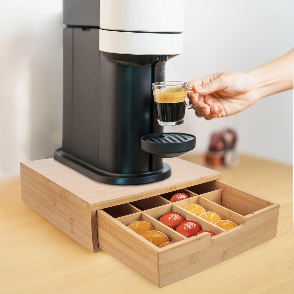 Organizatorul susține espressorul și, în același timp, ascunde capsulele în sertar – totul ordonat și la îndemână.